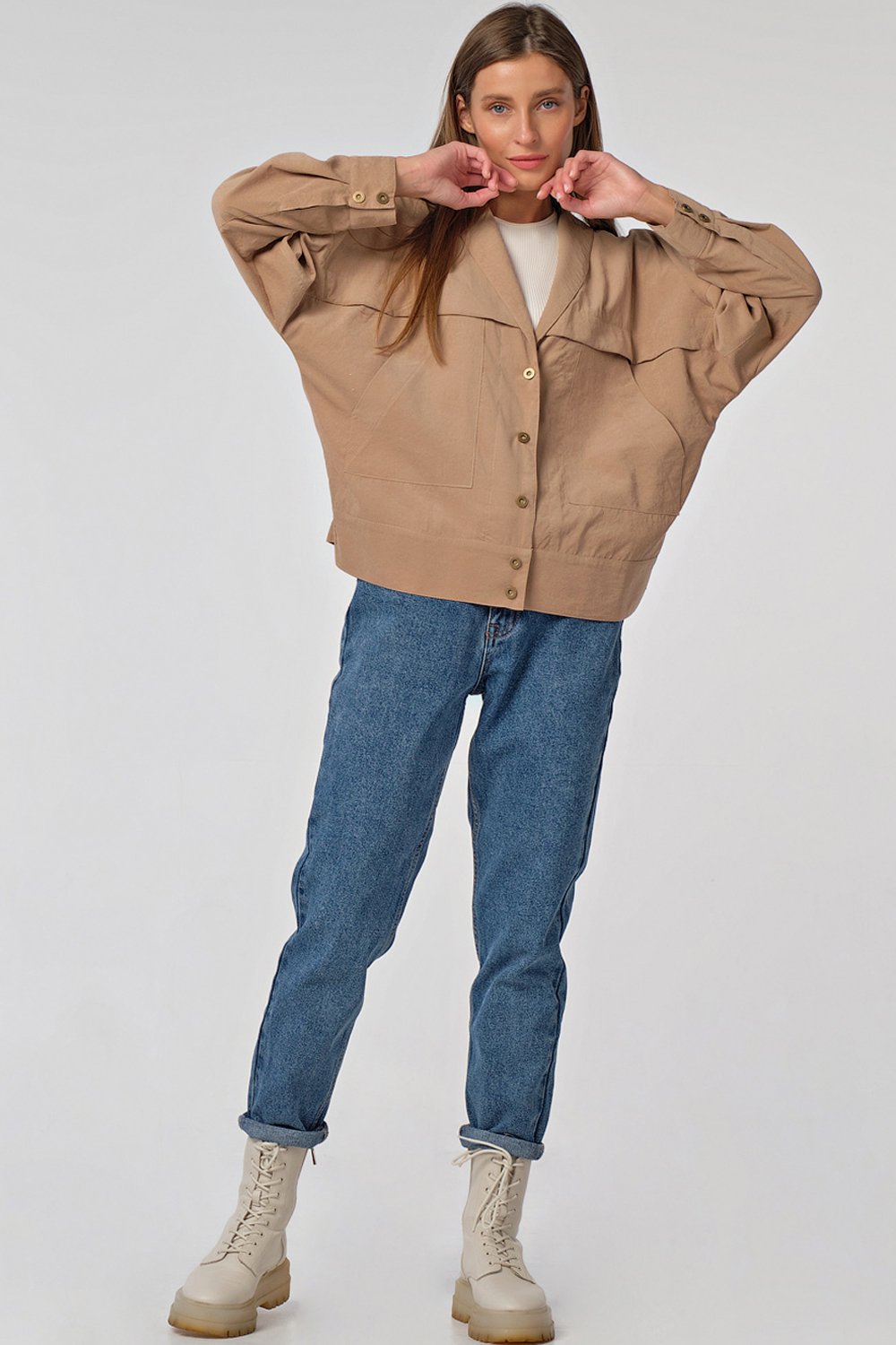 • Детали: шалевый воротник, спущенная линия плеча, цельновыкроенный рукав с притачной манжетой с застежкой на кнопку, кокетки по переду и спинке, с заложенной складкой, накладные карманы по переду, притачной пояс по низу ветровки, хлястики для регулировки ширины по низу. Застежка на кнопки по переду.