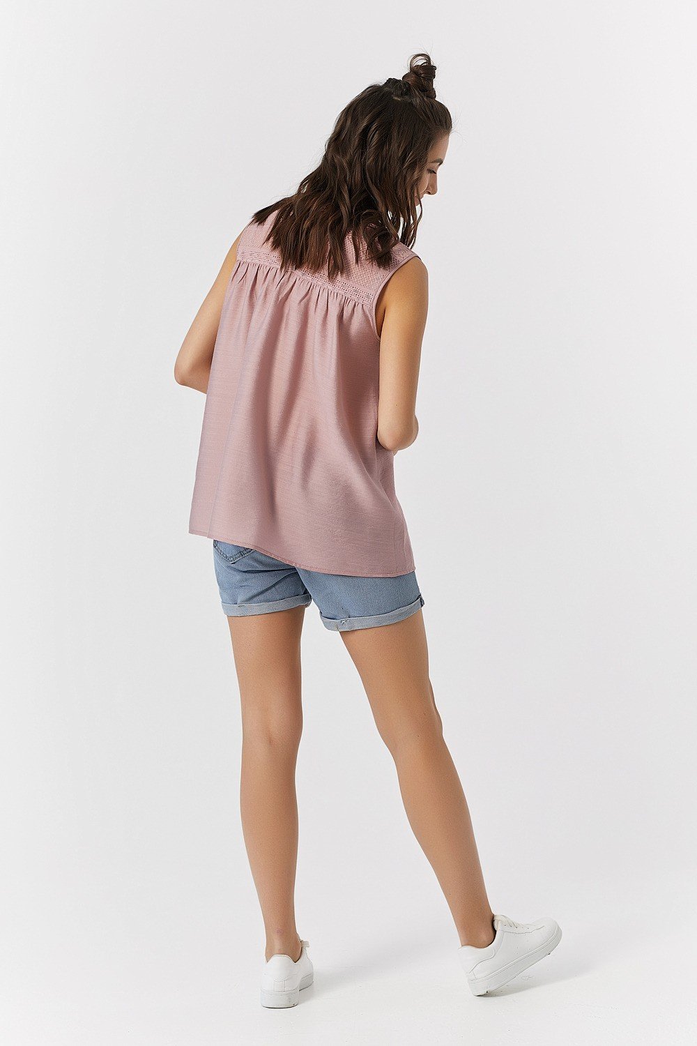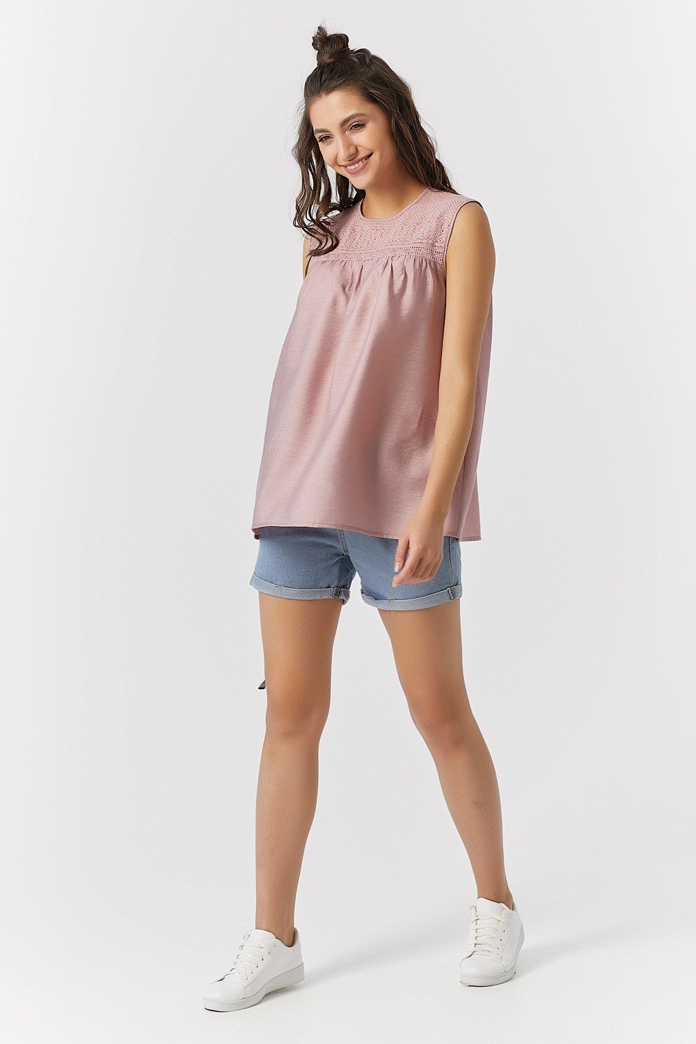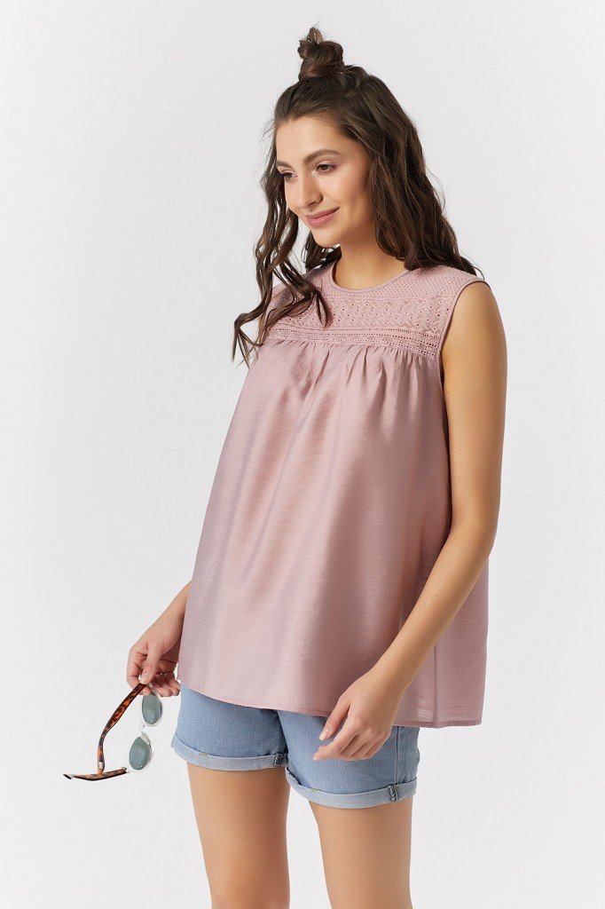 • Особенности: Топ расклешенного силуэта с кружевной кокеткой. Горловина округлой формы с застежкой на петлю и пуговицу по спинке. По переду и спинке выполнена наборка.