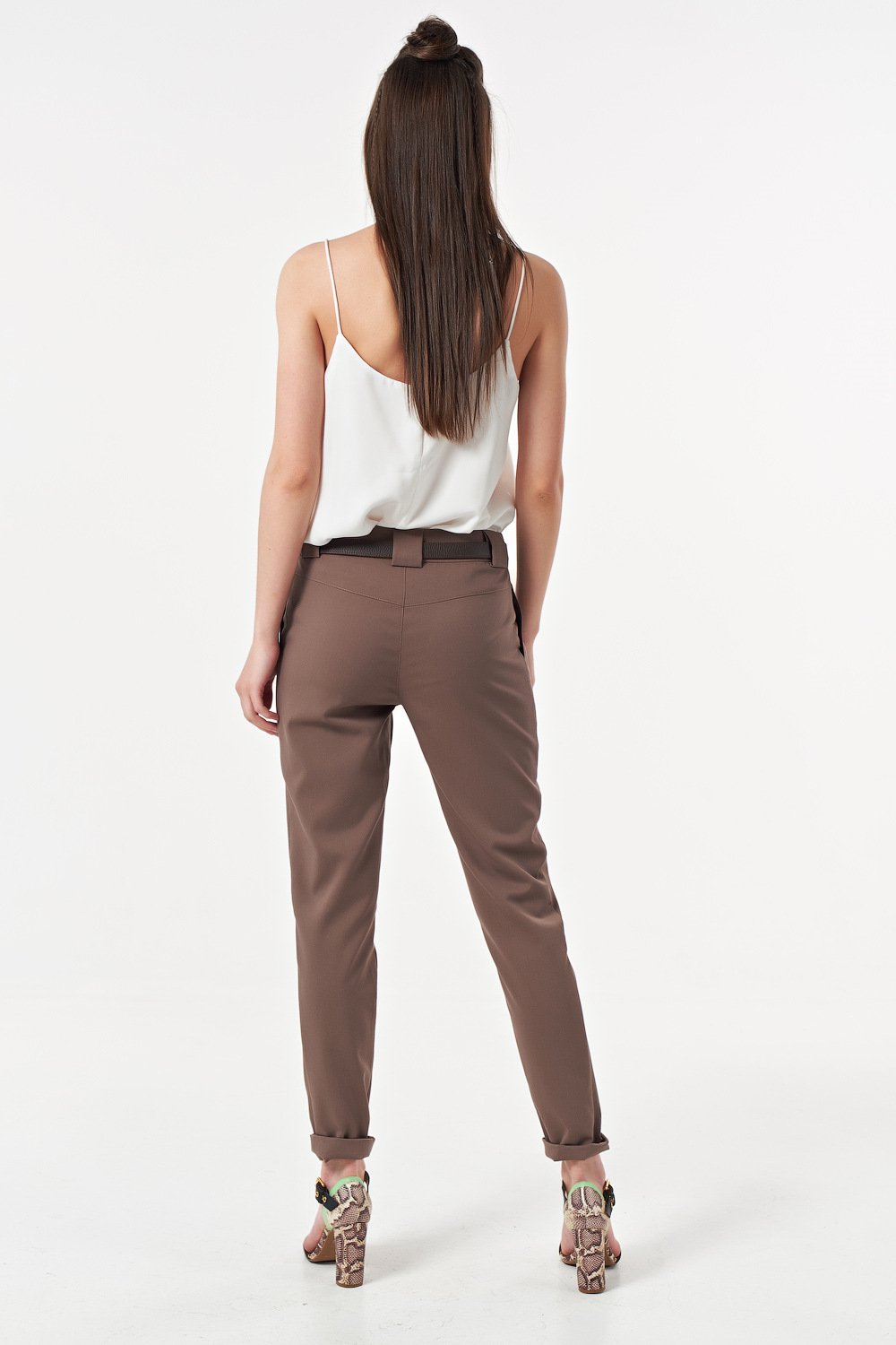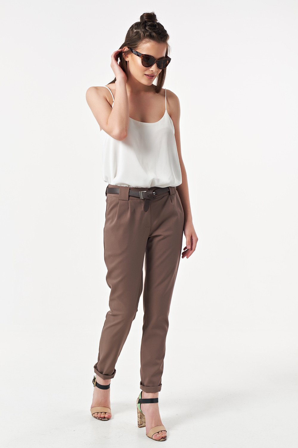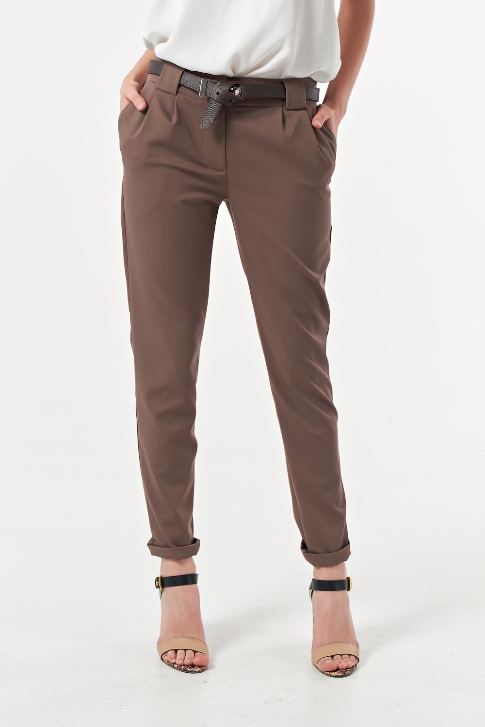 • Особенности: Брюки полуприлегающего силуэта заужены к низу. Детали: притачной пояс, широкие шлевки, защипы по низу - манжеты с отворотом. Ремень в комплект не входит.