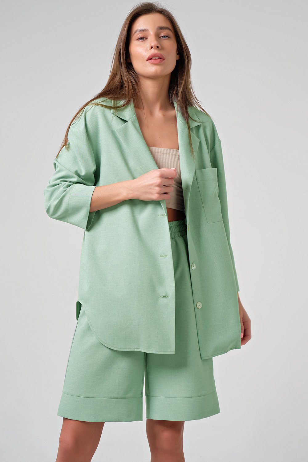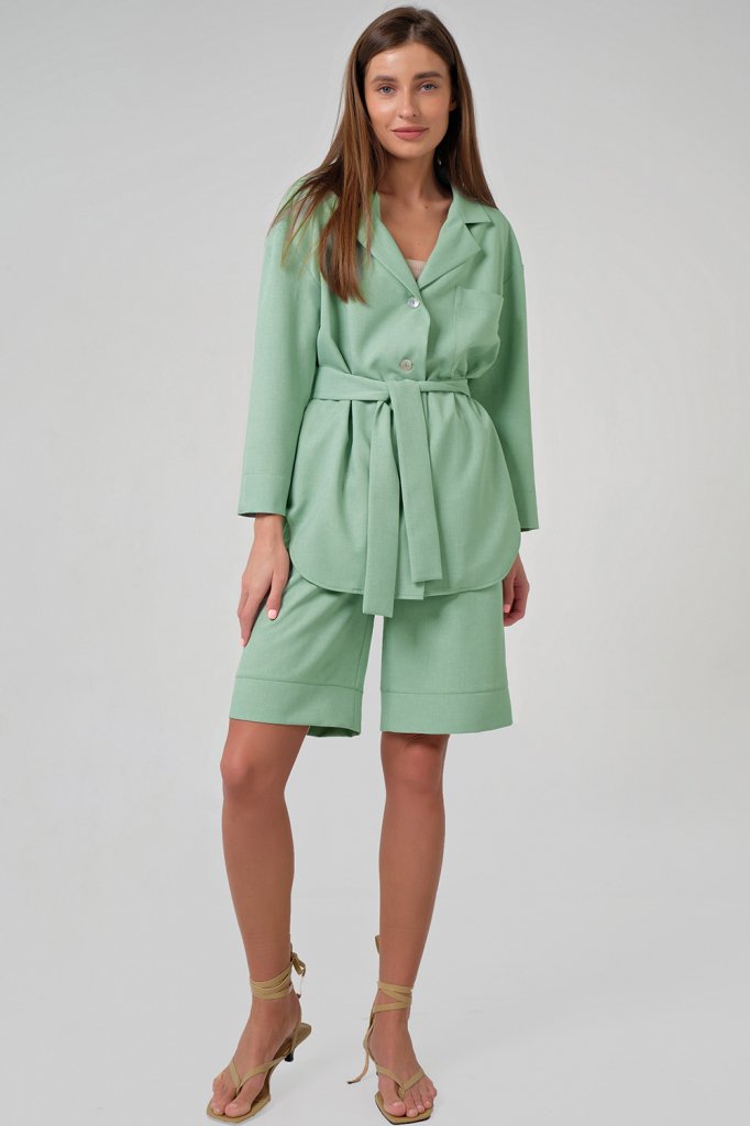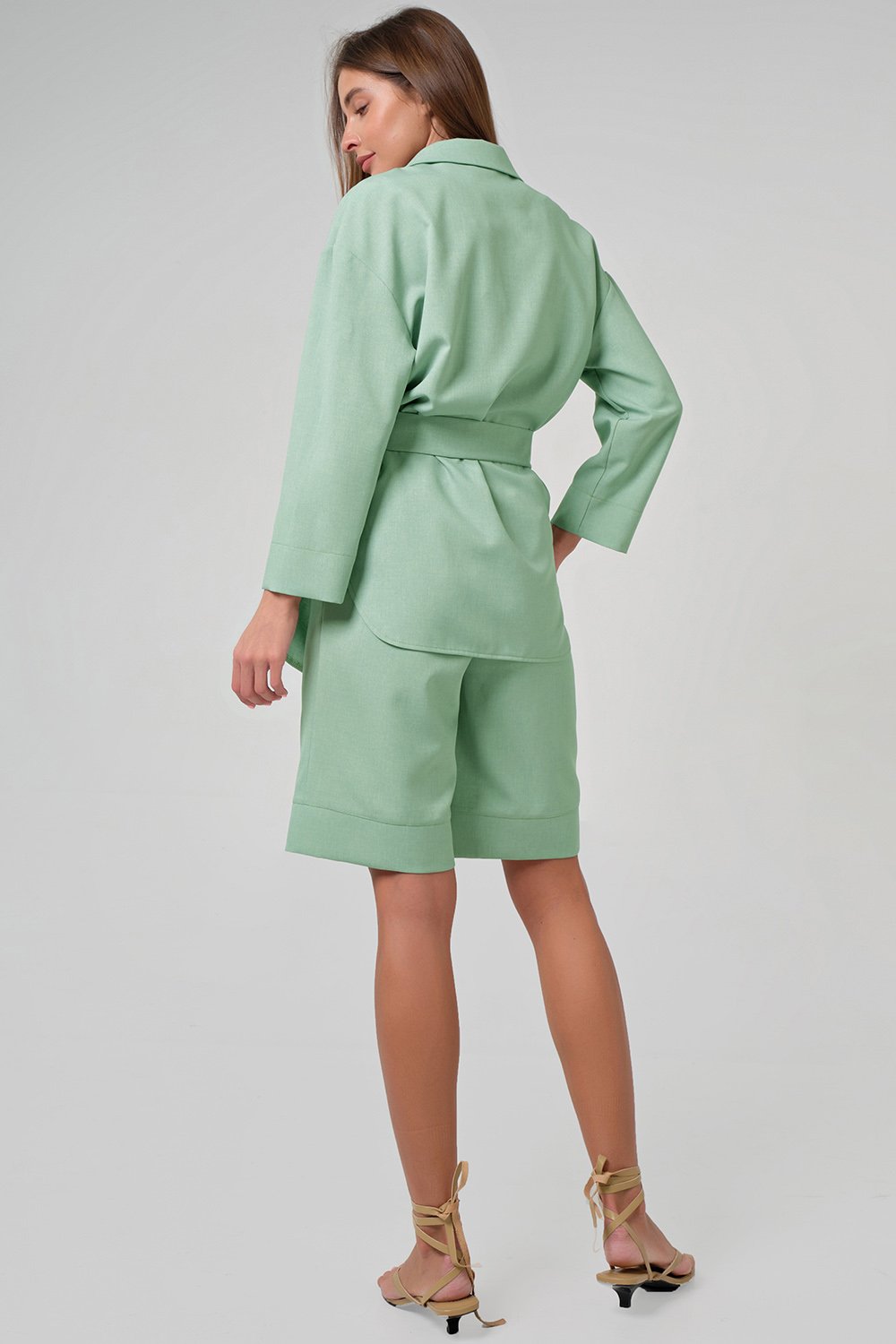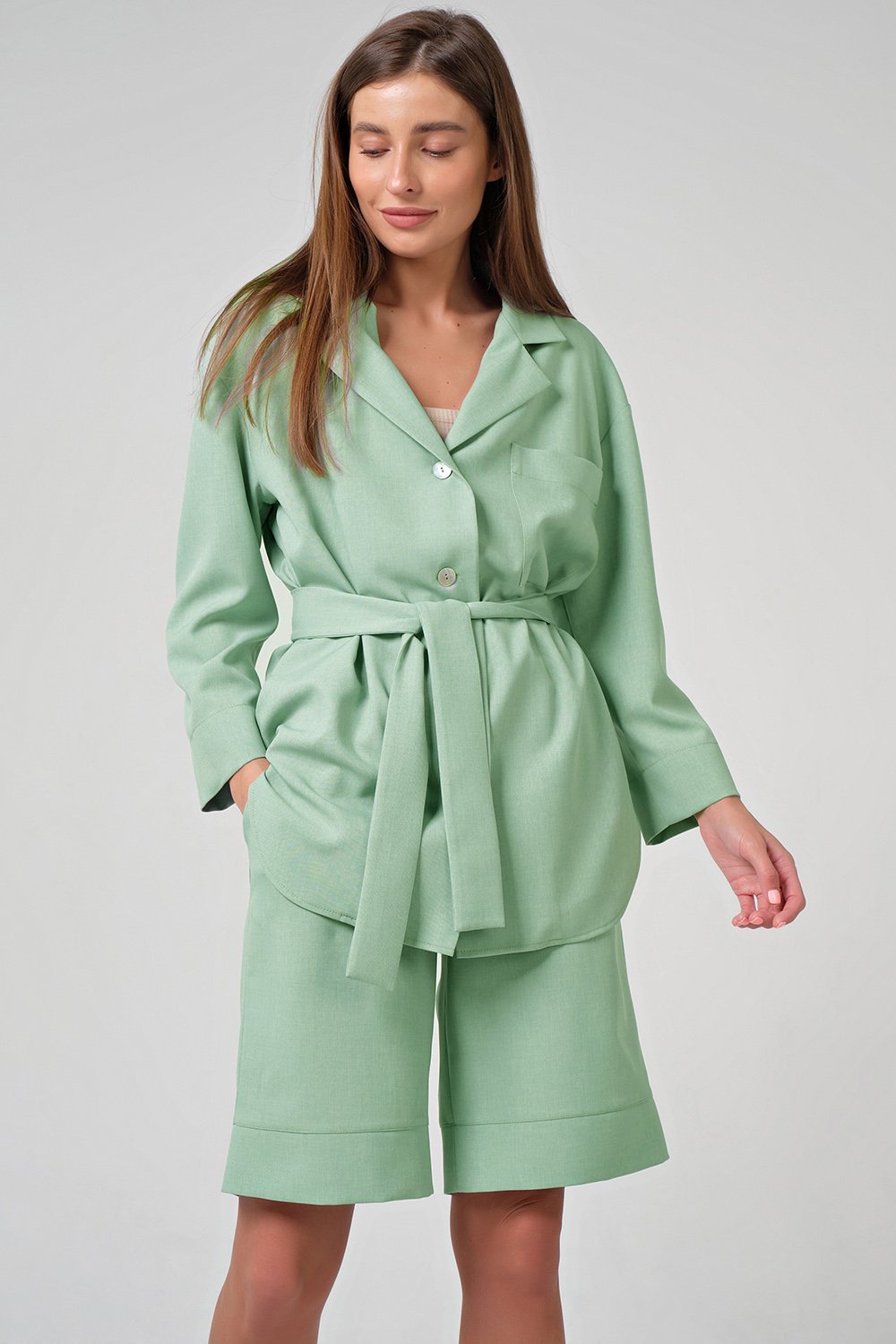 • Особенности: Костюм из рубашки и шорт из костюмной ткани. Детали рубашки: свободный силуэт, отложной воротник, спущенное плечо, втачной широкий рукав длиной 7/8 с подгибкой, накладной карман по переду, застежка на петли-пуговицы, съемный пояс. Детали шорт: примой силуэт, притачной пояс с резиной, боковые карманы, притачные манжеты по низу.