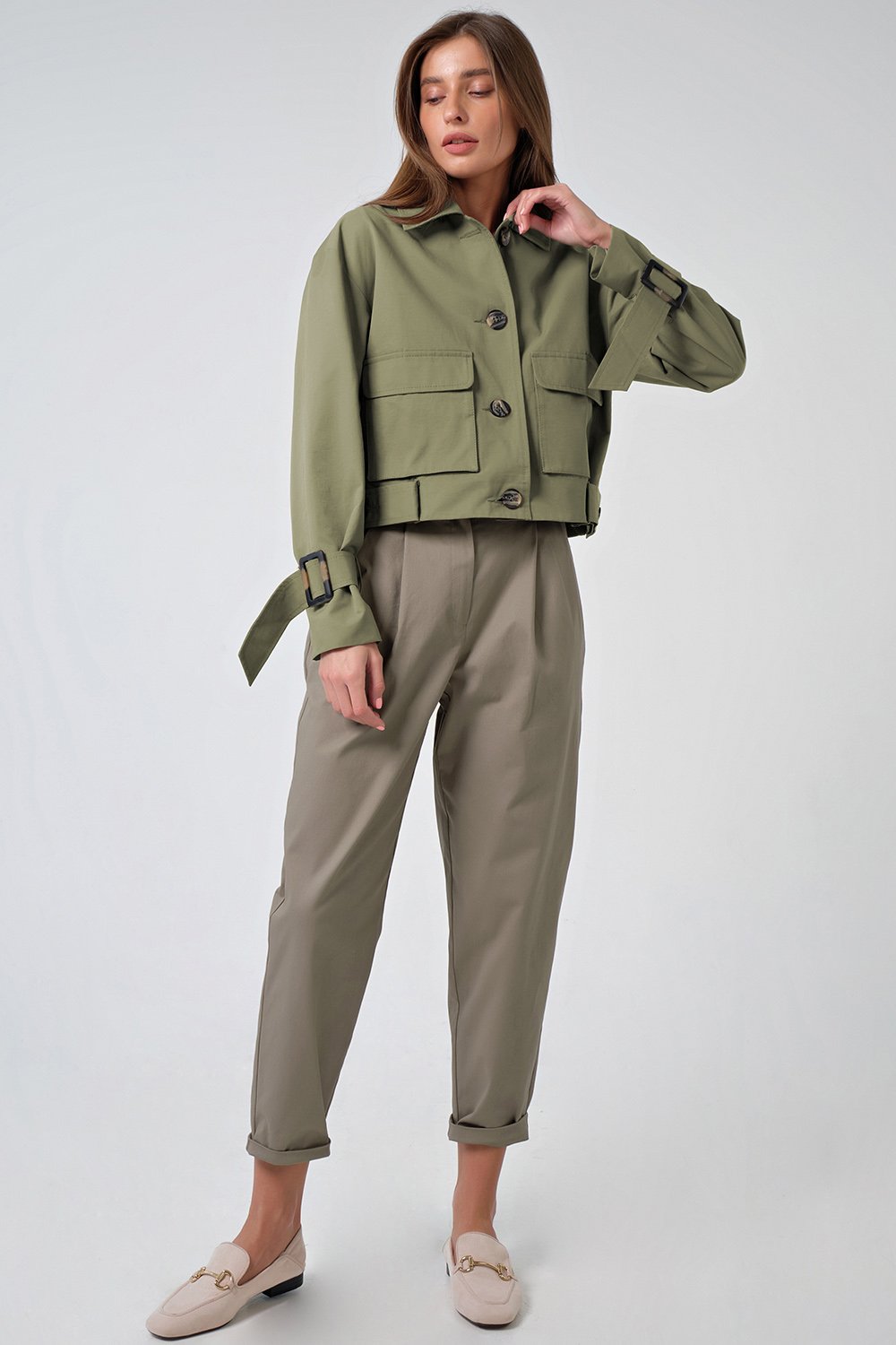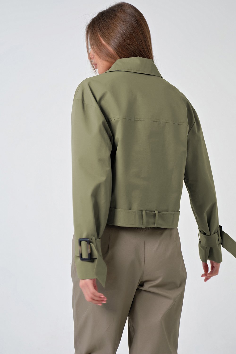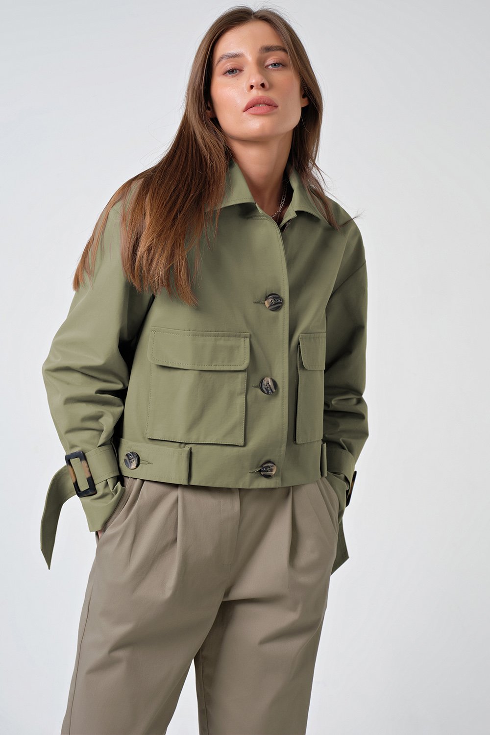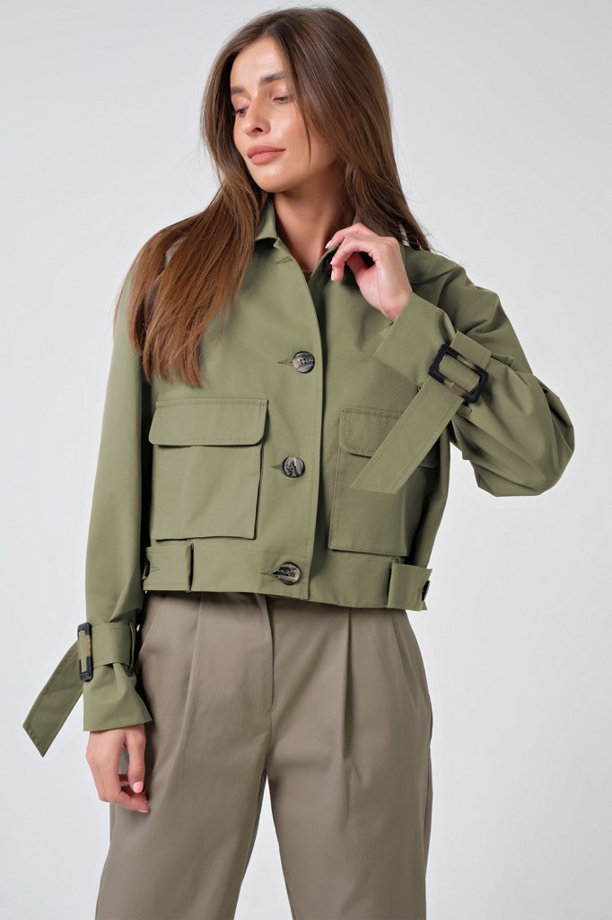 • Особенности: Ветровка прямого силуэта из плащевой ткани на подкладке. Детали: отложной воротник, спущенная линия плеча, втачной рукав со шлевками по низу и хлястиком с пряжкой, накладные объемные карманы с клапанами по переду, кокетка по спинке, шлевки по низу ветровки, пояс в комплекте. Застежка на петли-пуговицы.