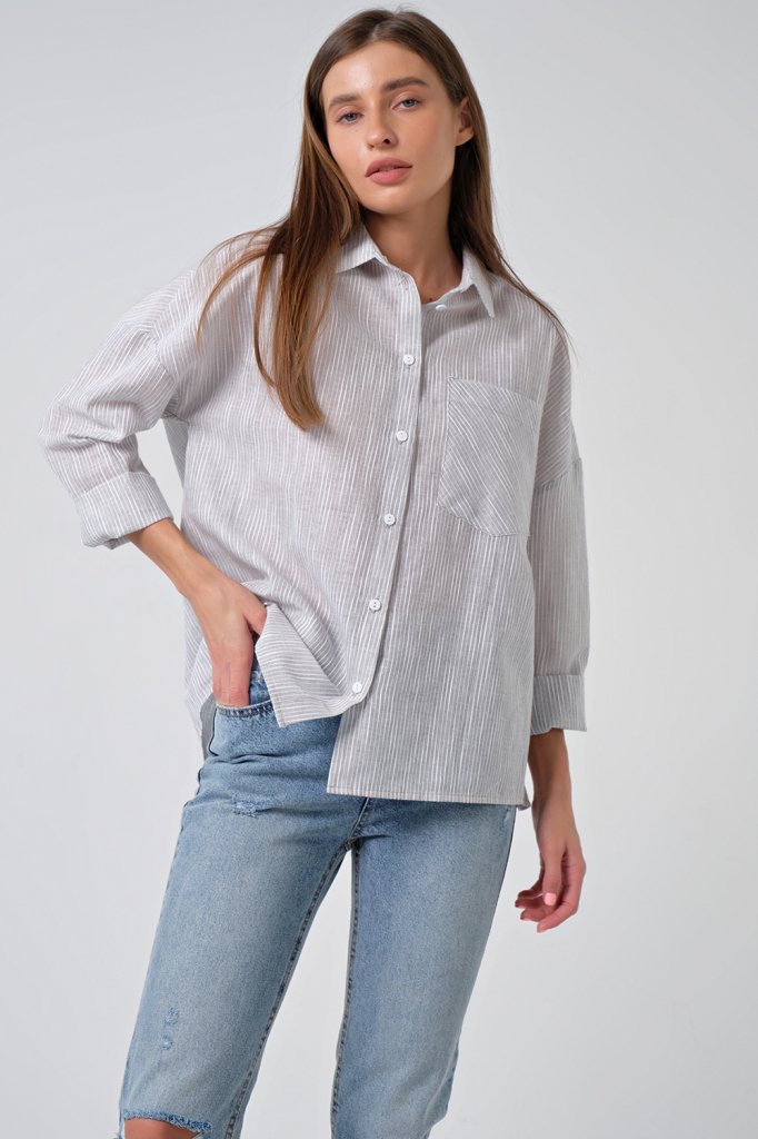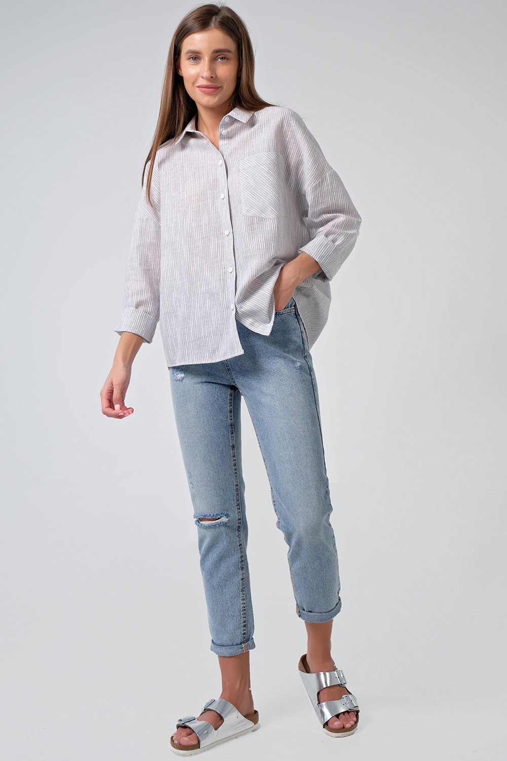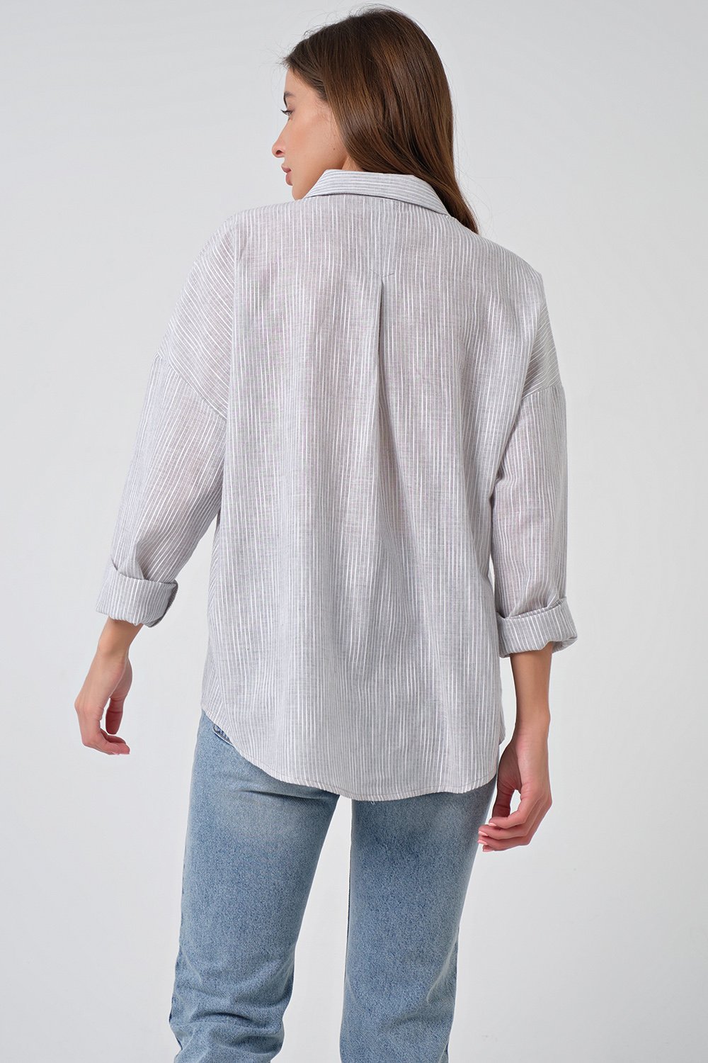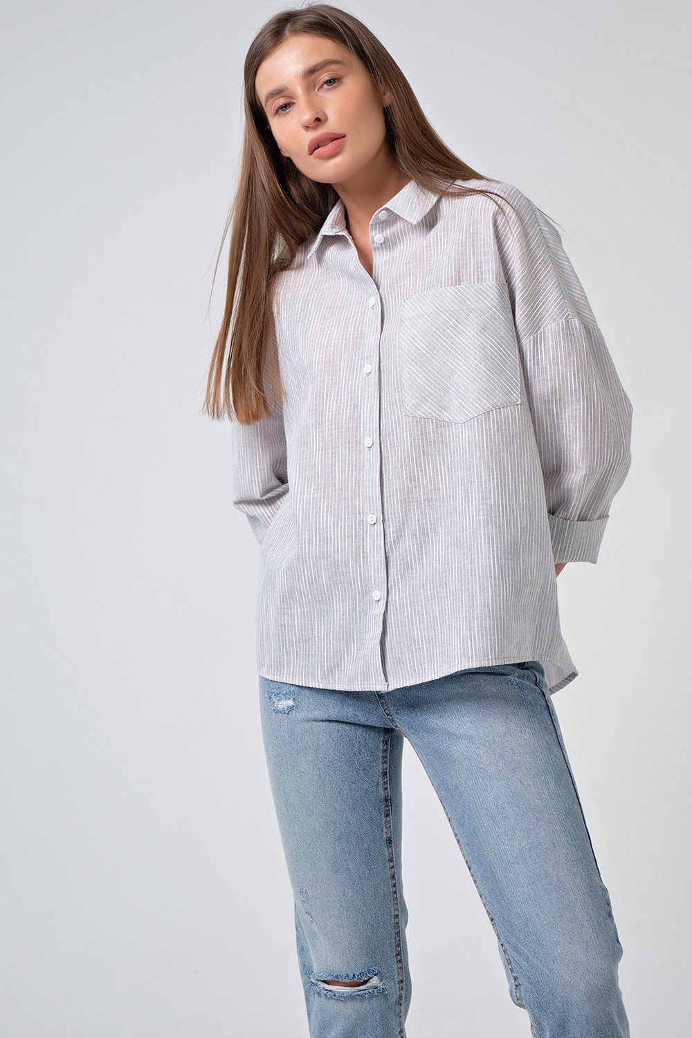 • Особенности: Рубашка из хлопковой ткани в полоску. Детали: отложной воротник на стойке, планка с застежкой на петли и пуговицы, накладной карман. Втачной рукав с рубашечной проймой. Спинка с удлинением.
