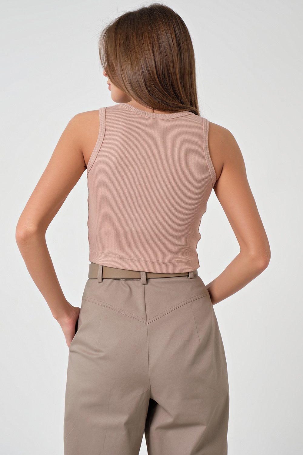 • Особенности: Топ прилегающего силуэта из кашкорсе. Детали: планка по переду, завышенная пройма, горловина и проймы обработаны окантовкой. Без застежки.