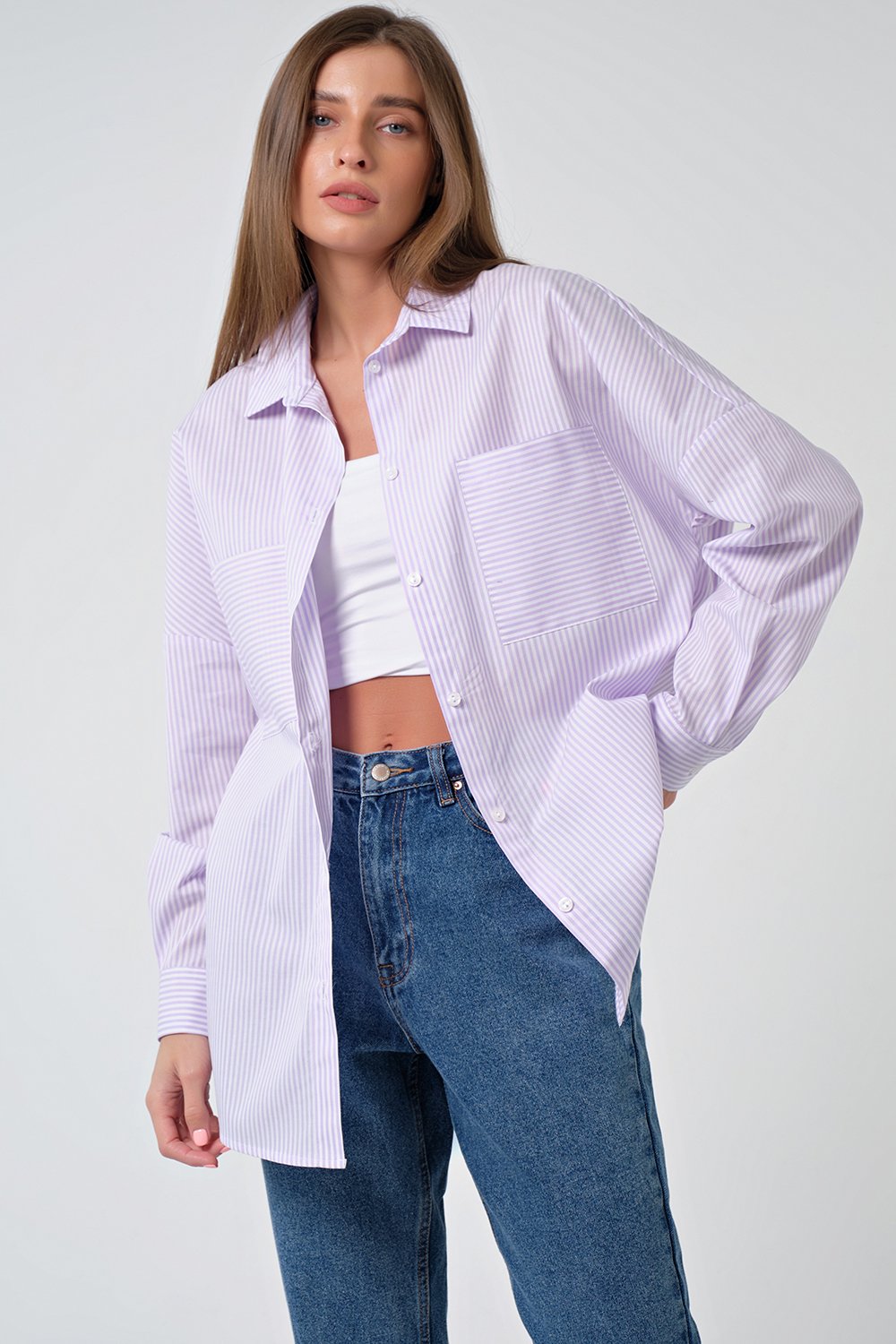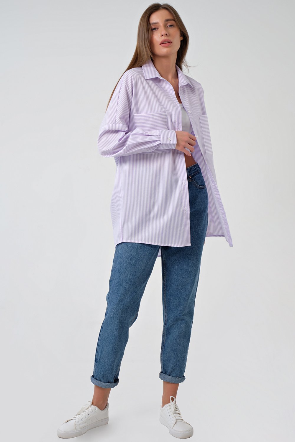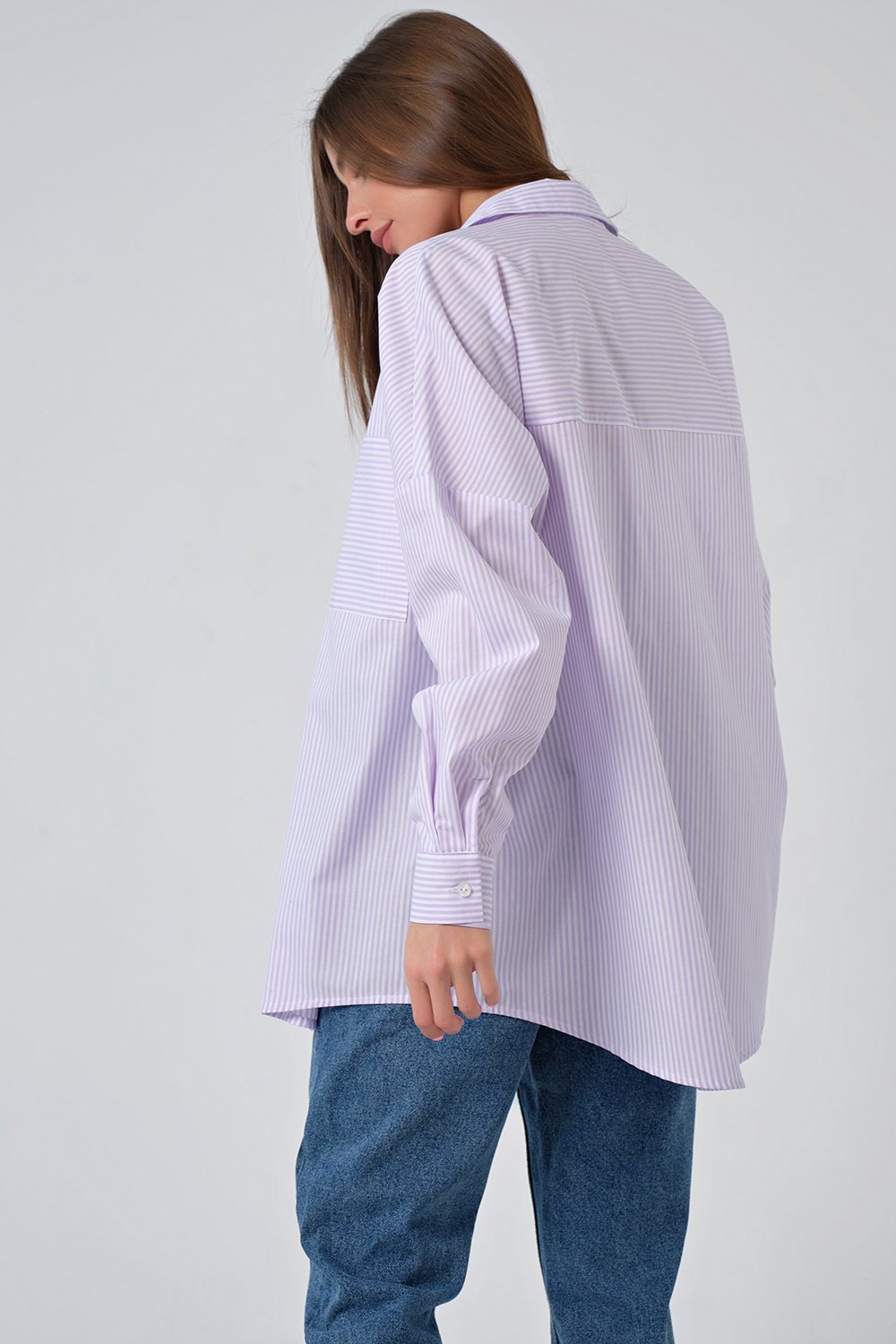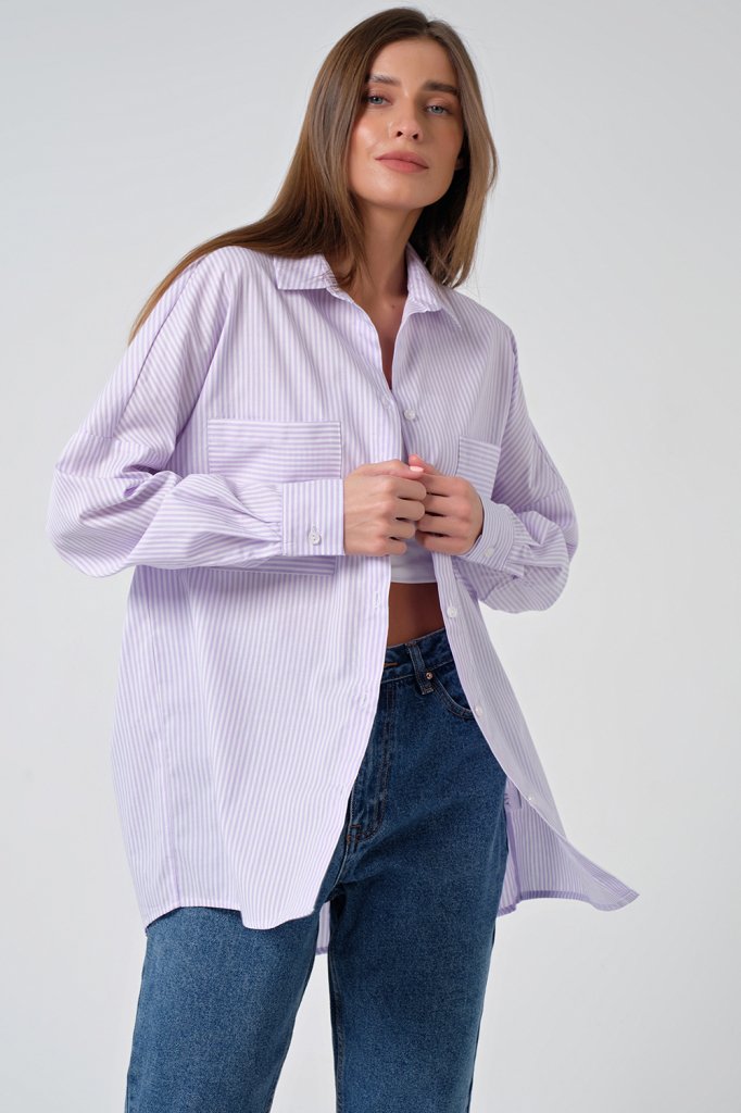 • Особенности: Рубашка из хлопковой ткани в полоску. Детали: отложной воротник на стойке, планка с застежкой на петли и пуговицы, накладные карманы. Втачной рукав с рубашечной проймой на манжете. Низ изделия криволинейный.