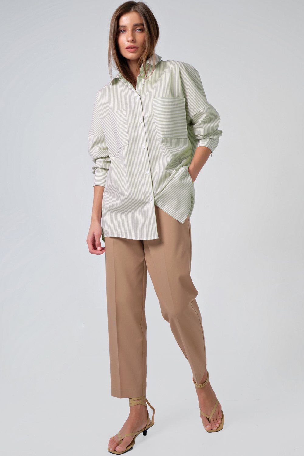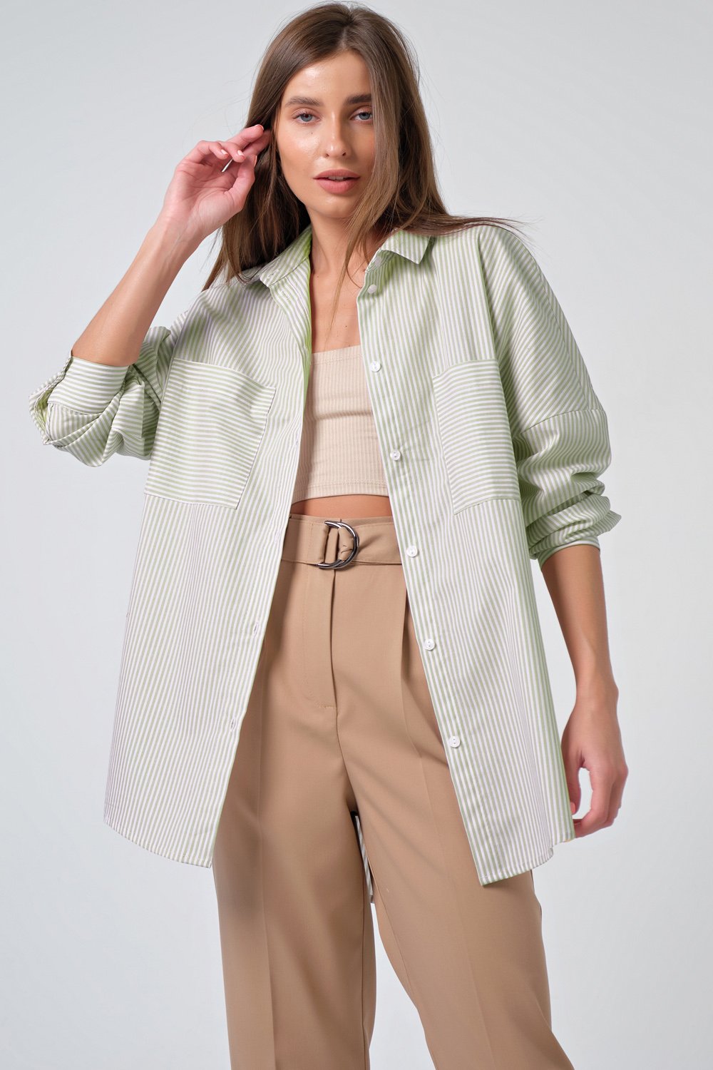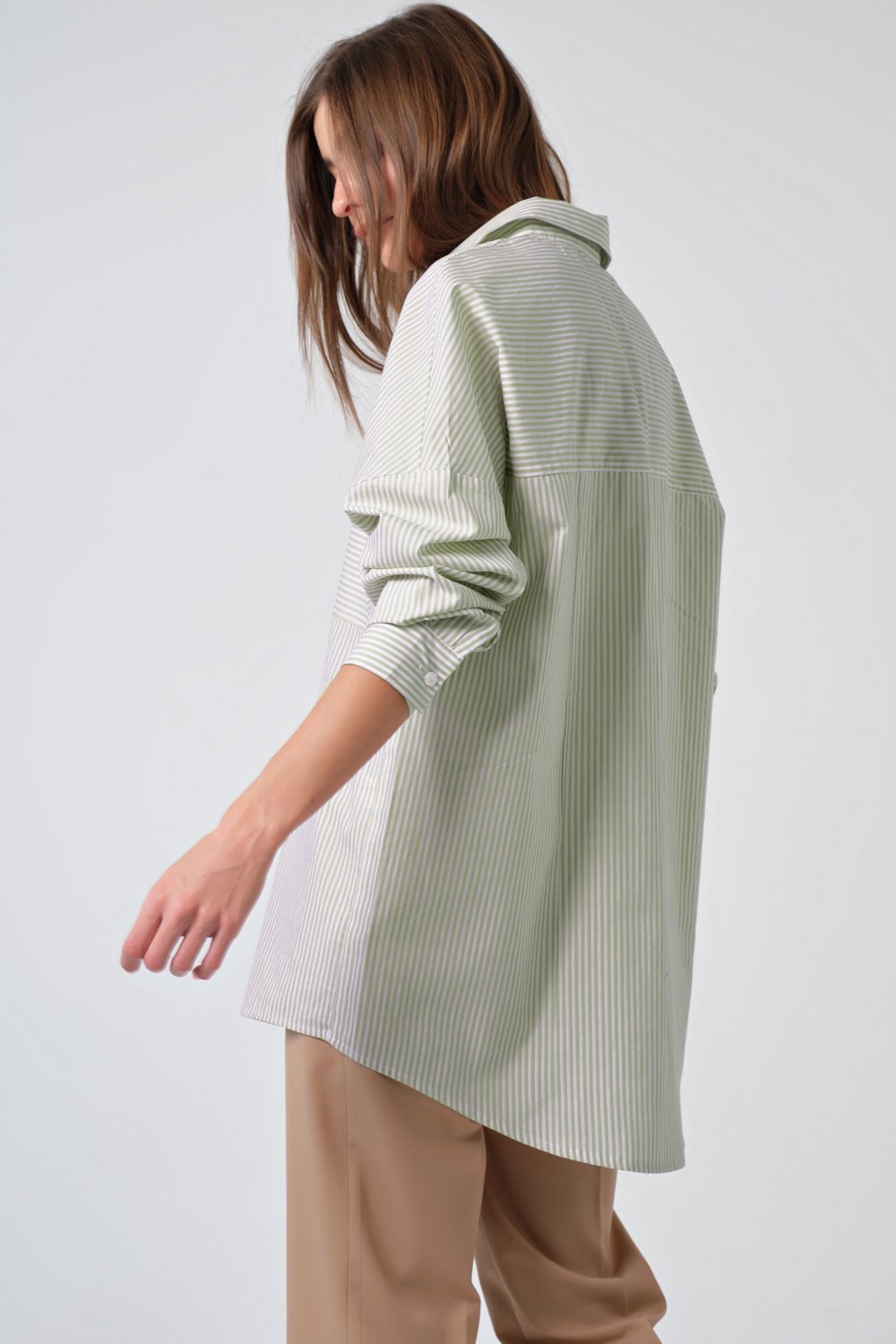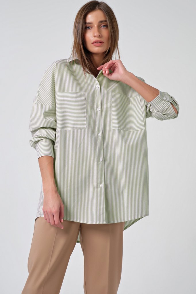 • Особенности: Рубашка из хлопковой ткани в полоску. Детали: отложной воротник на стойке планка с застежкой на петли и пуговицы накладные карманы. Втачной рукав с рубашечной проймой, на манжете. Низ изделия криволинейный.