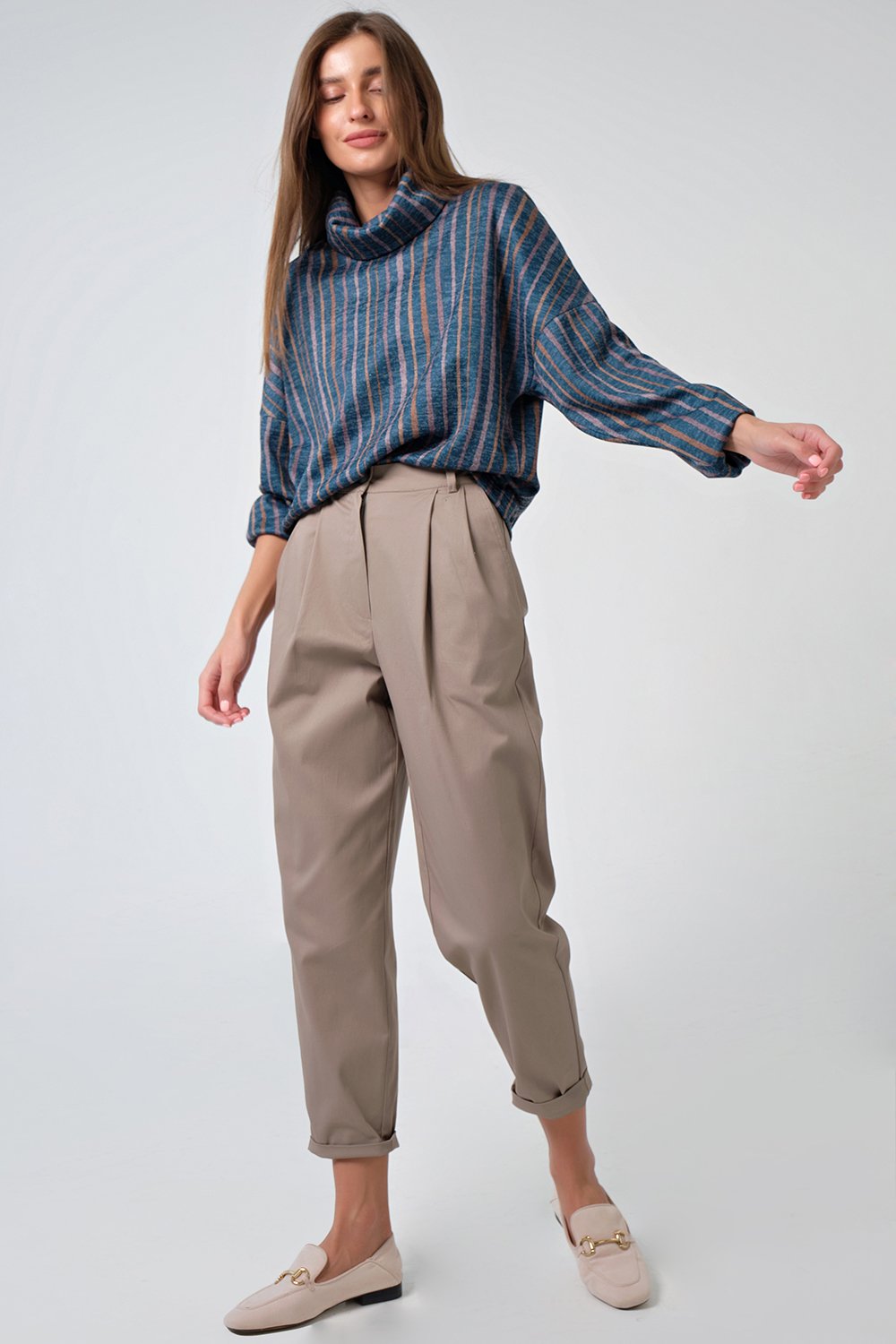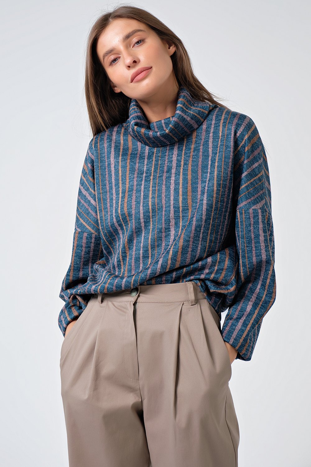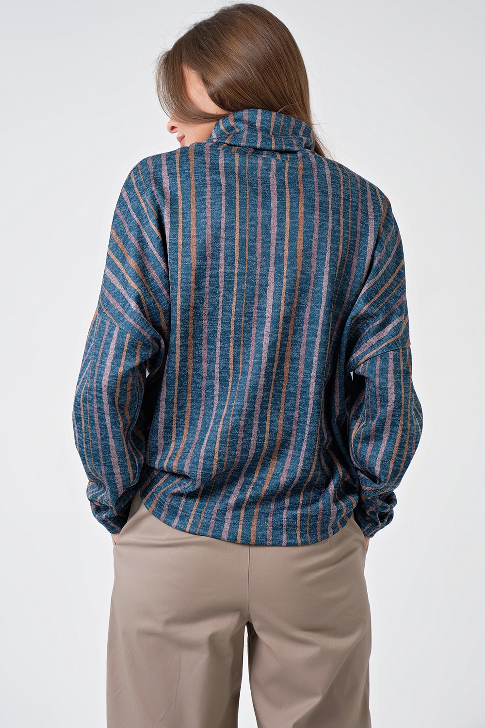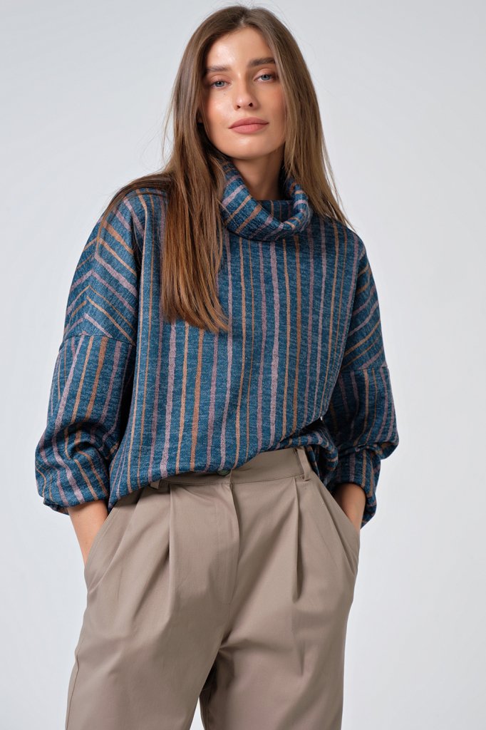 • Особенности: Джемпер прямого силуэта из утепленного трикотажа. Детали: высокий воротник-стойка, спущенная линия плеча, широкий рукав. Без застежки.