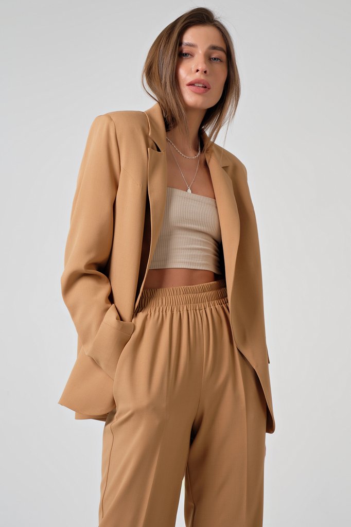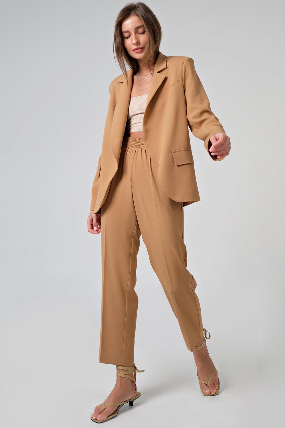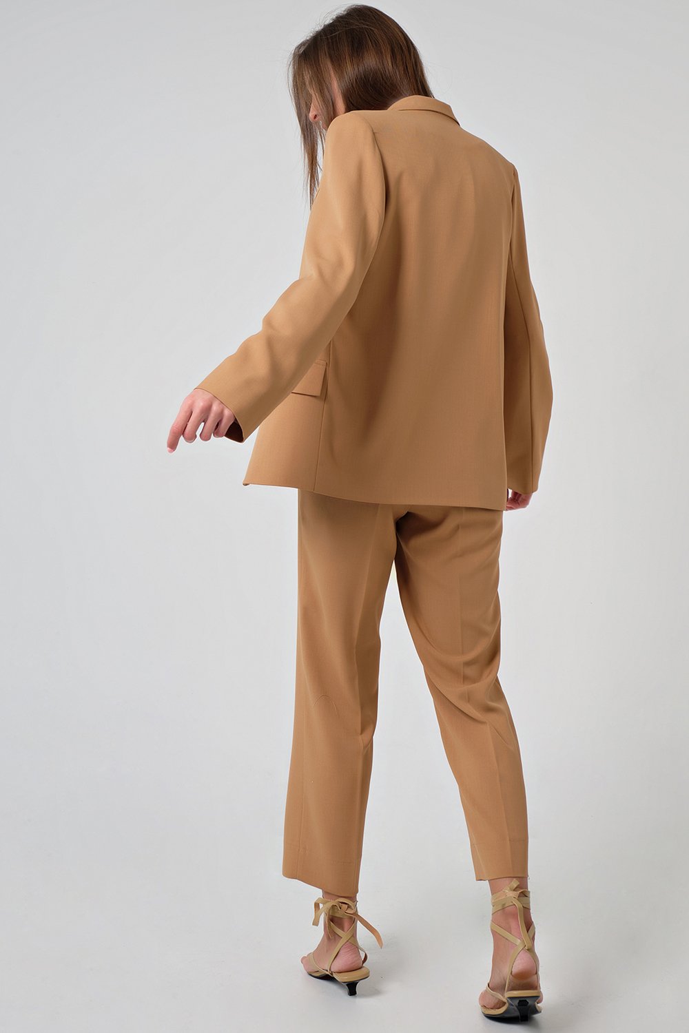 • Особенности: Костюм из жакета на подкладке и прямых брюк из костюмной ткани. Детали жакета: отложной воротник с лацканами, удлиненный расширенный лацкан, фигурная линия борта по низу, втачной двухшовный рукав, декоративные клапаны без застежки. Детали брюк: притачной пояс с резиной, боковые карманы без застежки.