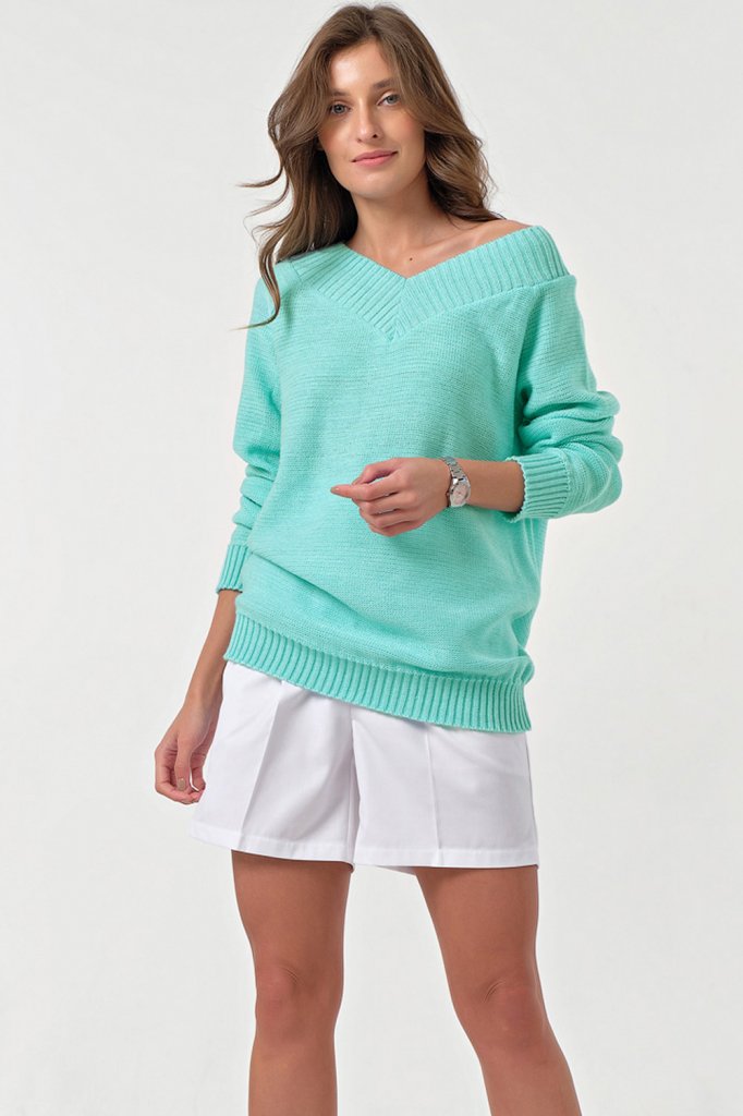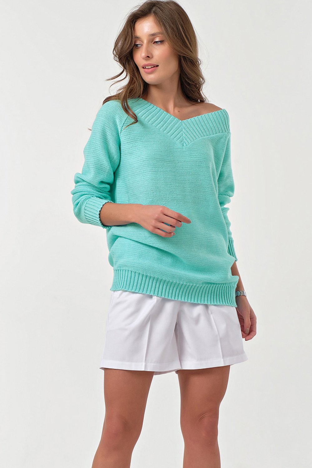 • Особенности: Вязаный джемпер выполнен из смесовой пряжи фактурным мягким способом. Рукав реглан с манжетами, глубокий V-образный вырез горловины оформлен широкой резинкой в рубчик.