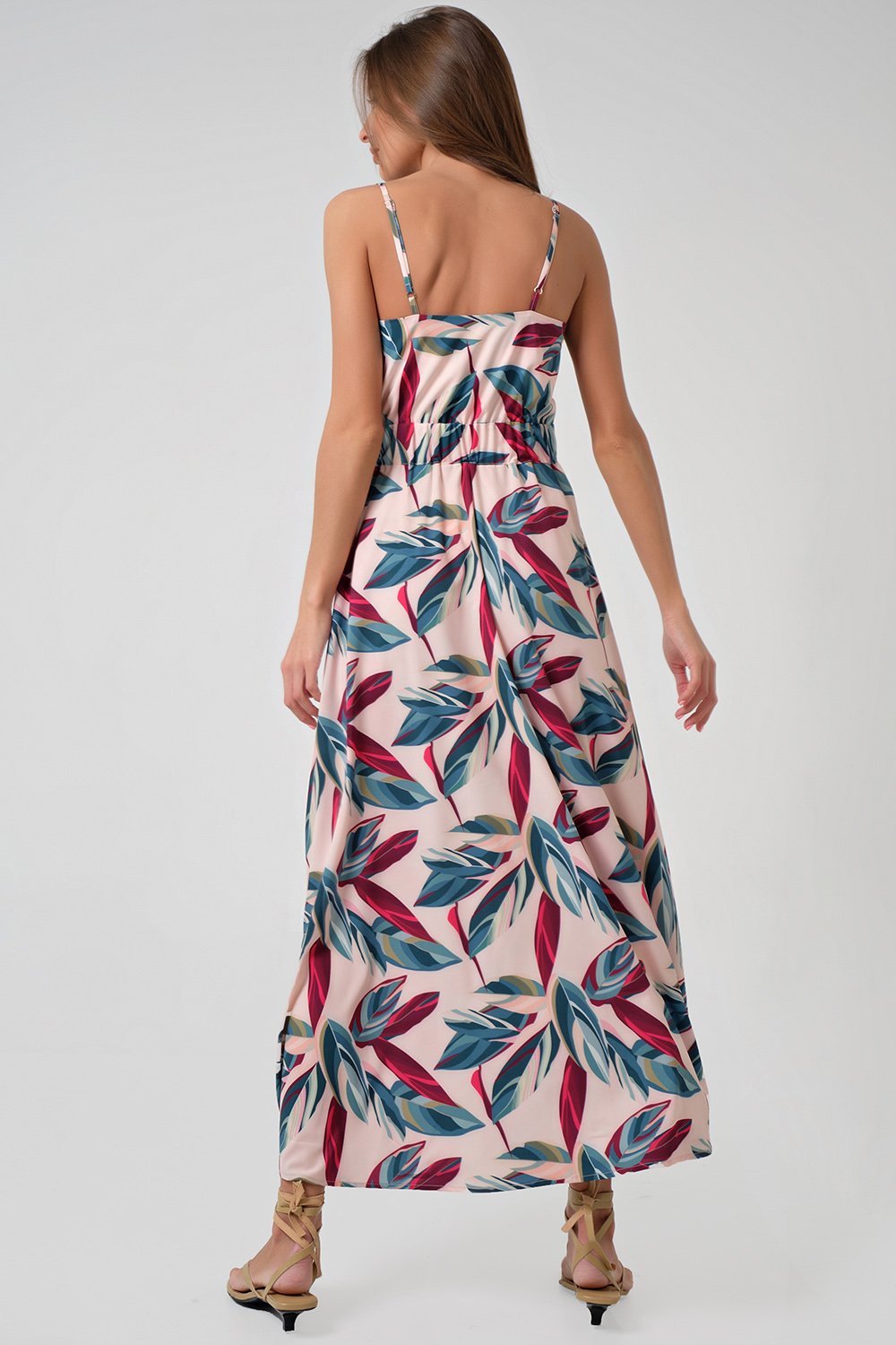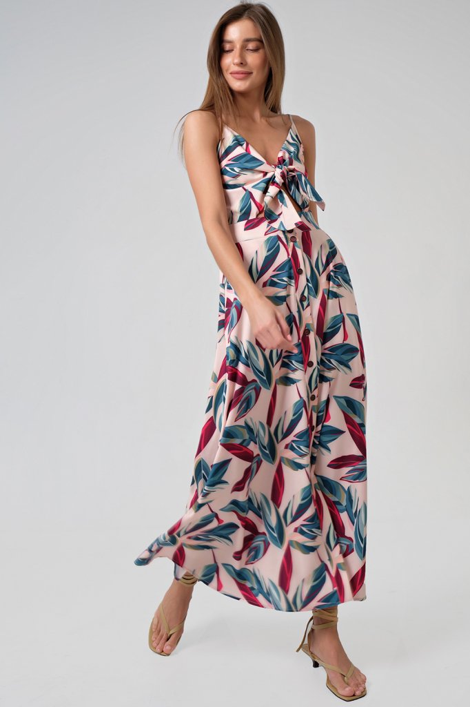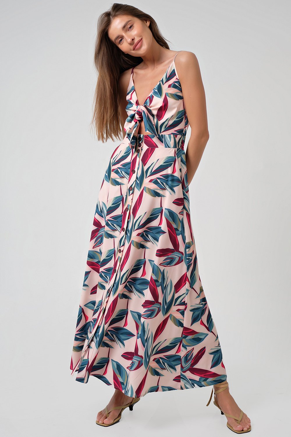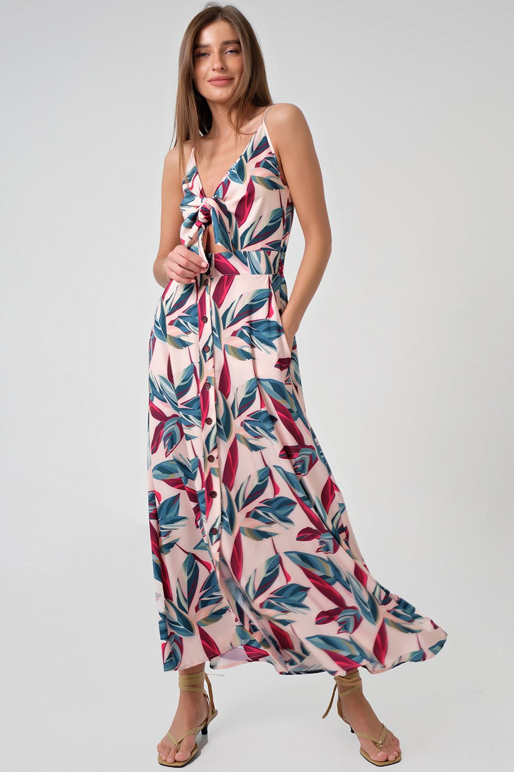 • Особенности: Платье полуприлегающего силуэта из плательной ткани. Детали: тонкие бретели с регуляторами, лиф переда с завязками, отрезное по линии талии со сборкой на резину по спинке, по переду пояс с застежкой на пуговицы, карманы в боковых швах, по переду юбки планка с застежкой на петли-пуговицы.