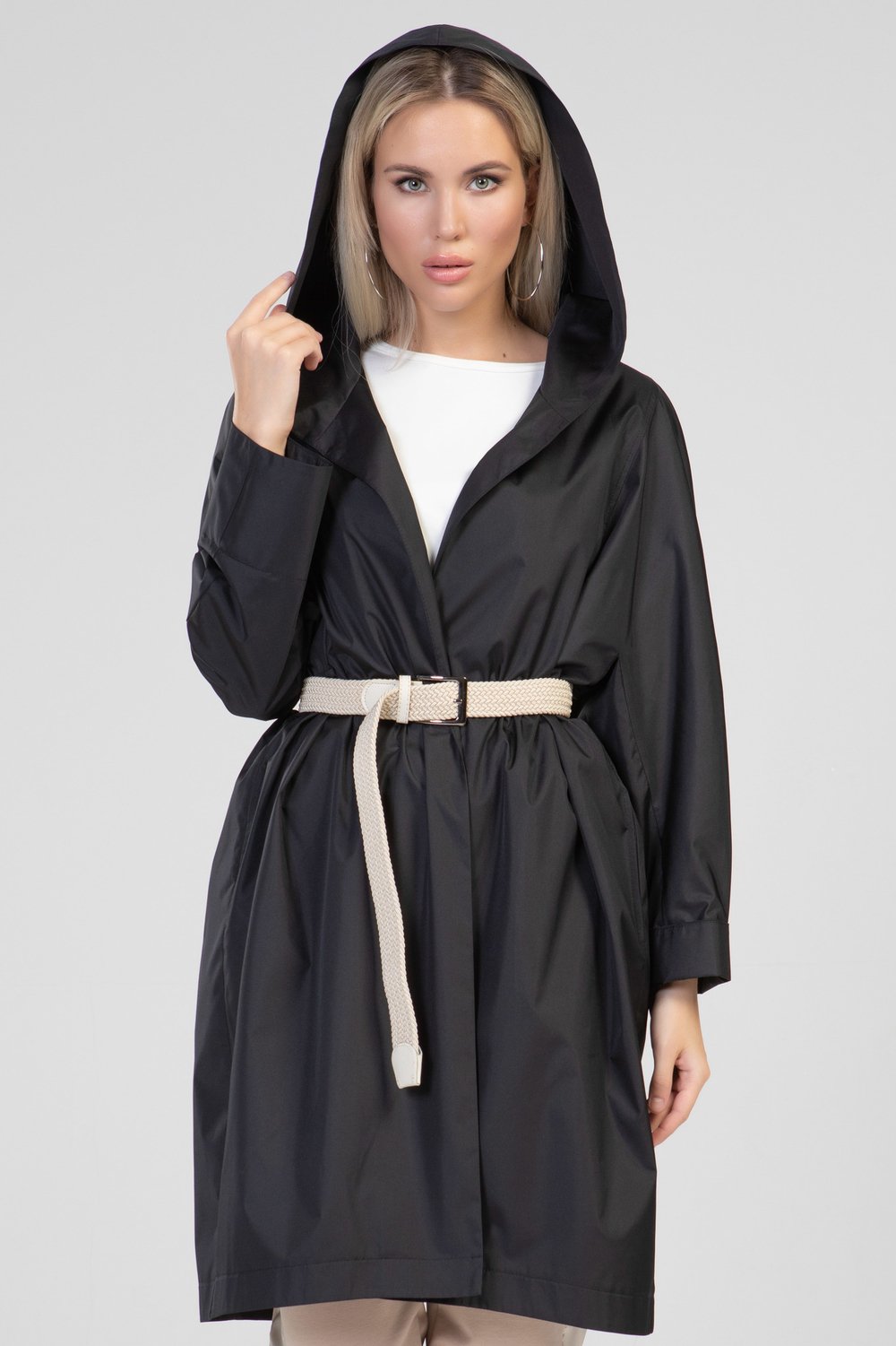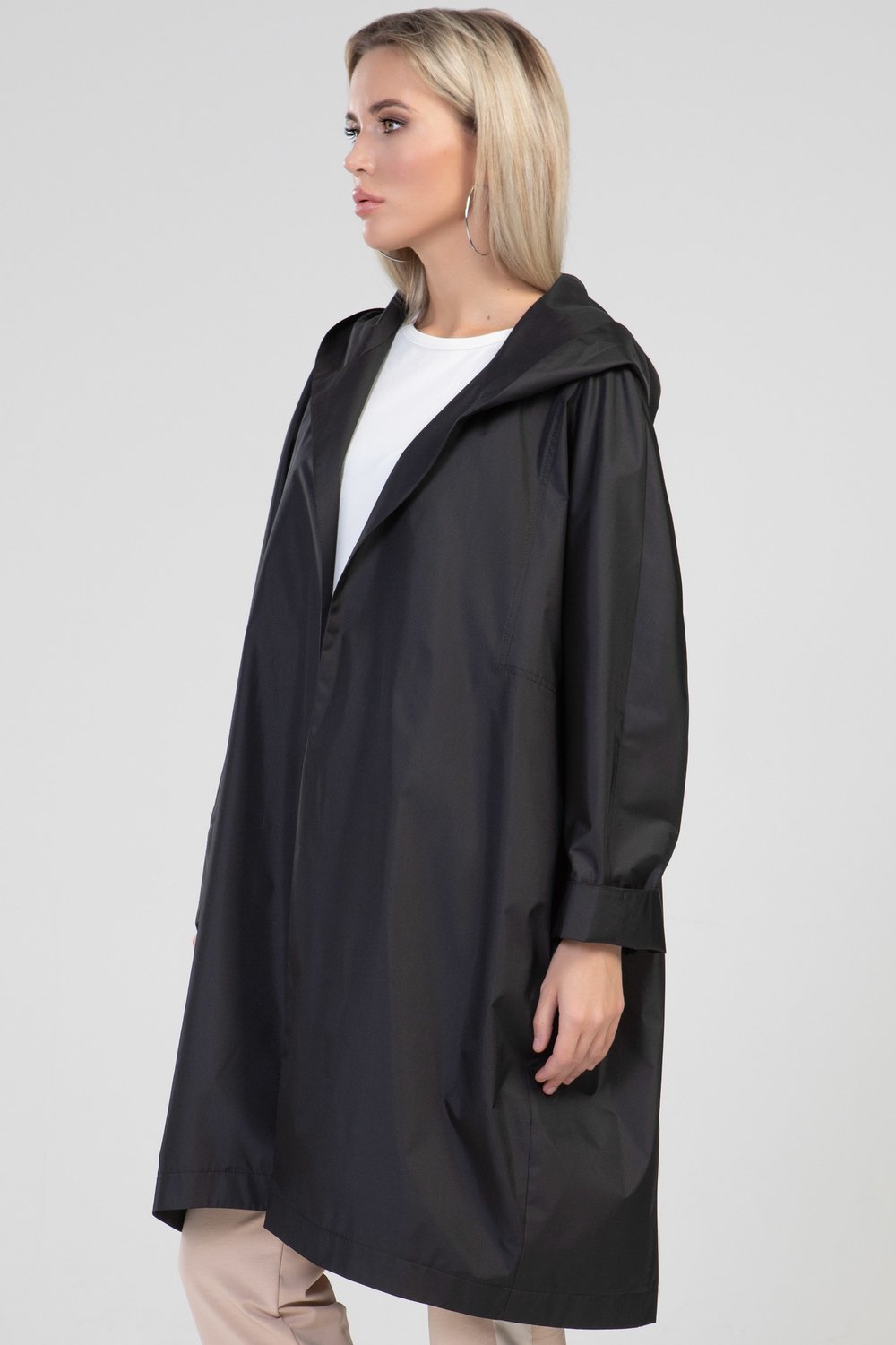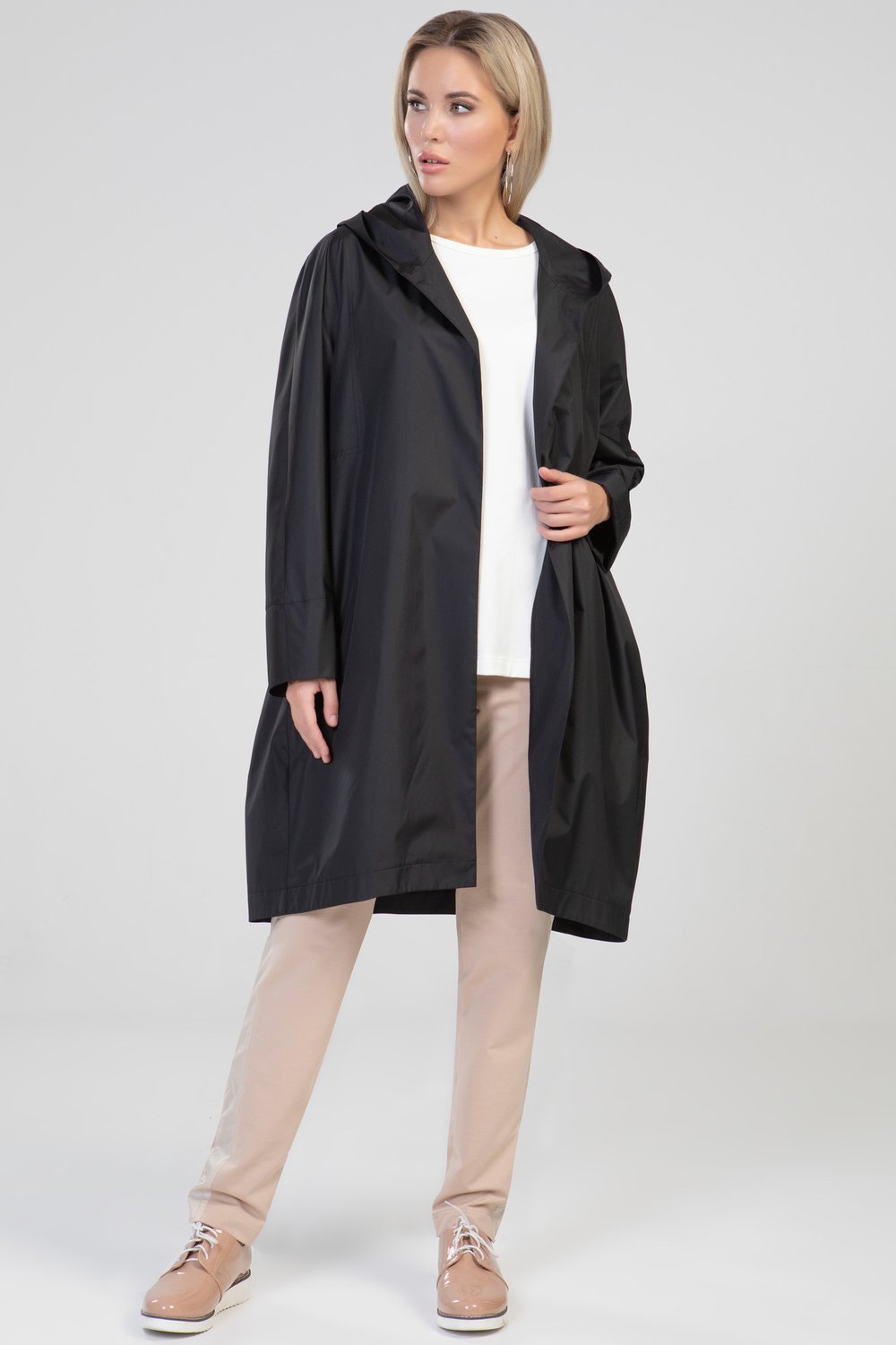 Плащ женский трапециевидного силуэта, разноуровневый, с центральной застежкой на три магнита, с карманами в боковых швах, с капюшоном. Перед и спинка с подрезами, рукав цельнокроеный длинный. Посередине спинки вертикально выполнена аппликация из прозрачной пленки. Цвет черный.Характеристики: