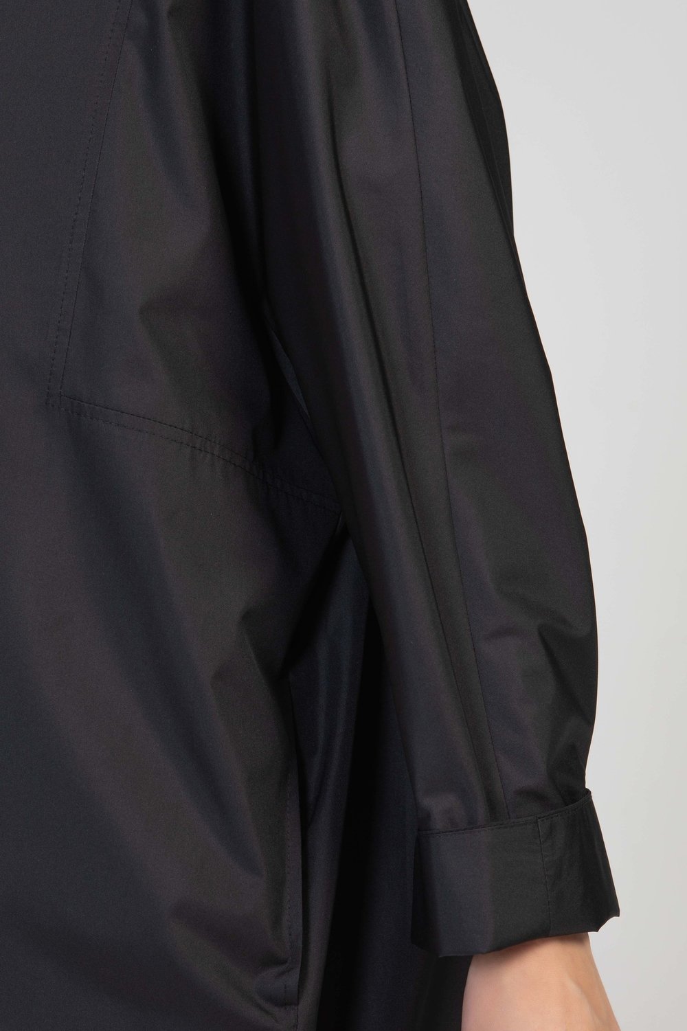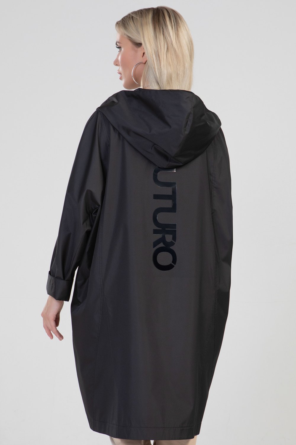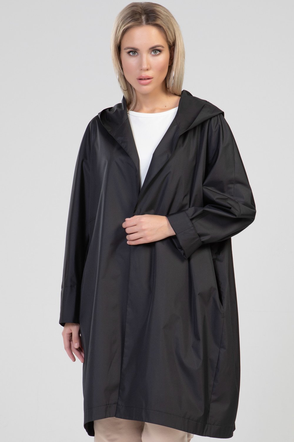 Плащ женский трапециевидного силуэта, разноуровневый, с центральной застежкой на три магнита, с карманами в боковых швах, с капюшоном. Перед и спинка с подрезами, рукав цельнокроеный длинный. Посередине спинки вертикально выполнена аппликация из прозрачной пленки. Цвет черный.Характеристики: