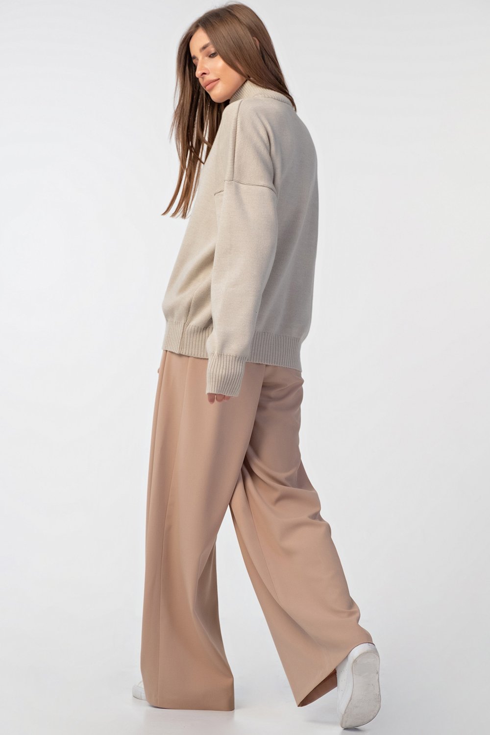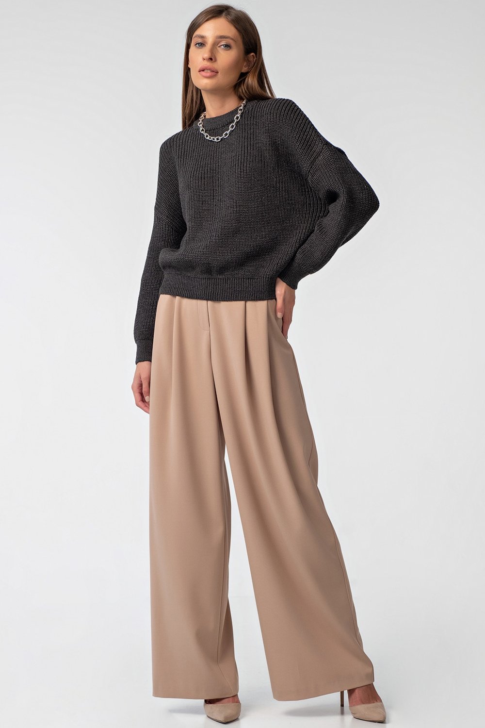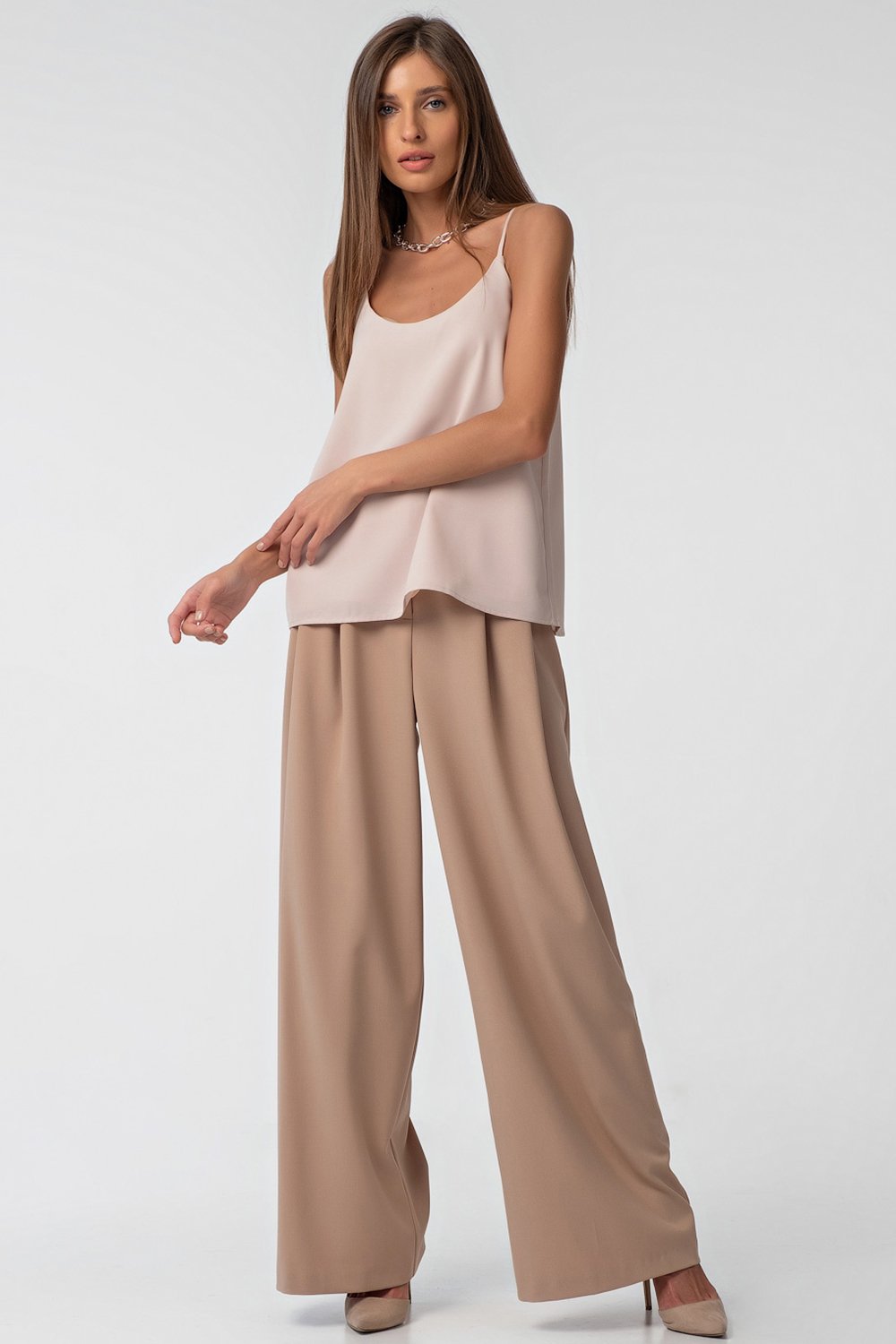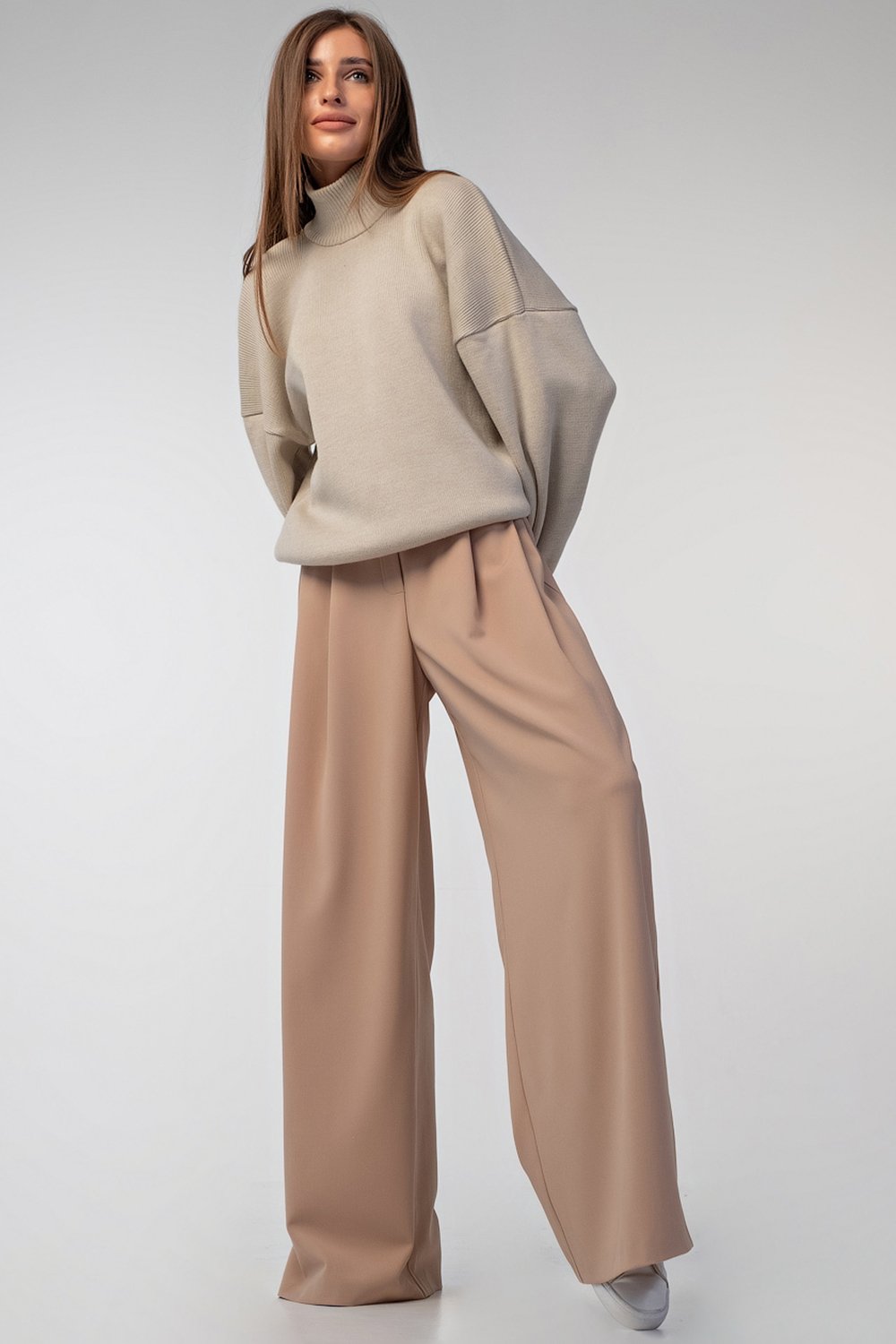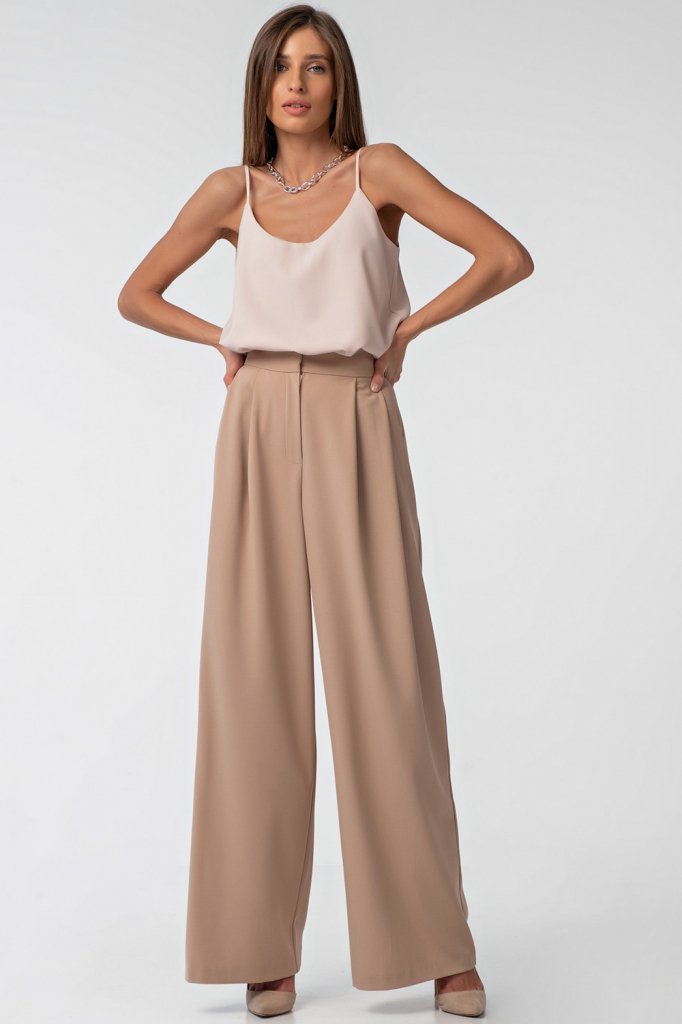 • Особенности: Брюки палаццо из костюмной ткани. Детали: притачной пояс с застежкой на крючок, две глубокие складки по переду, застежка на молнию.