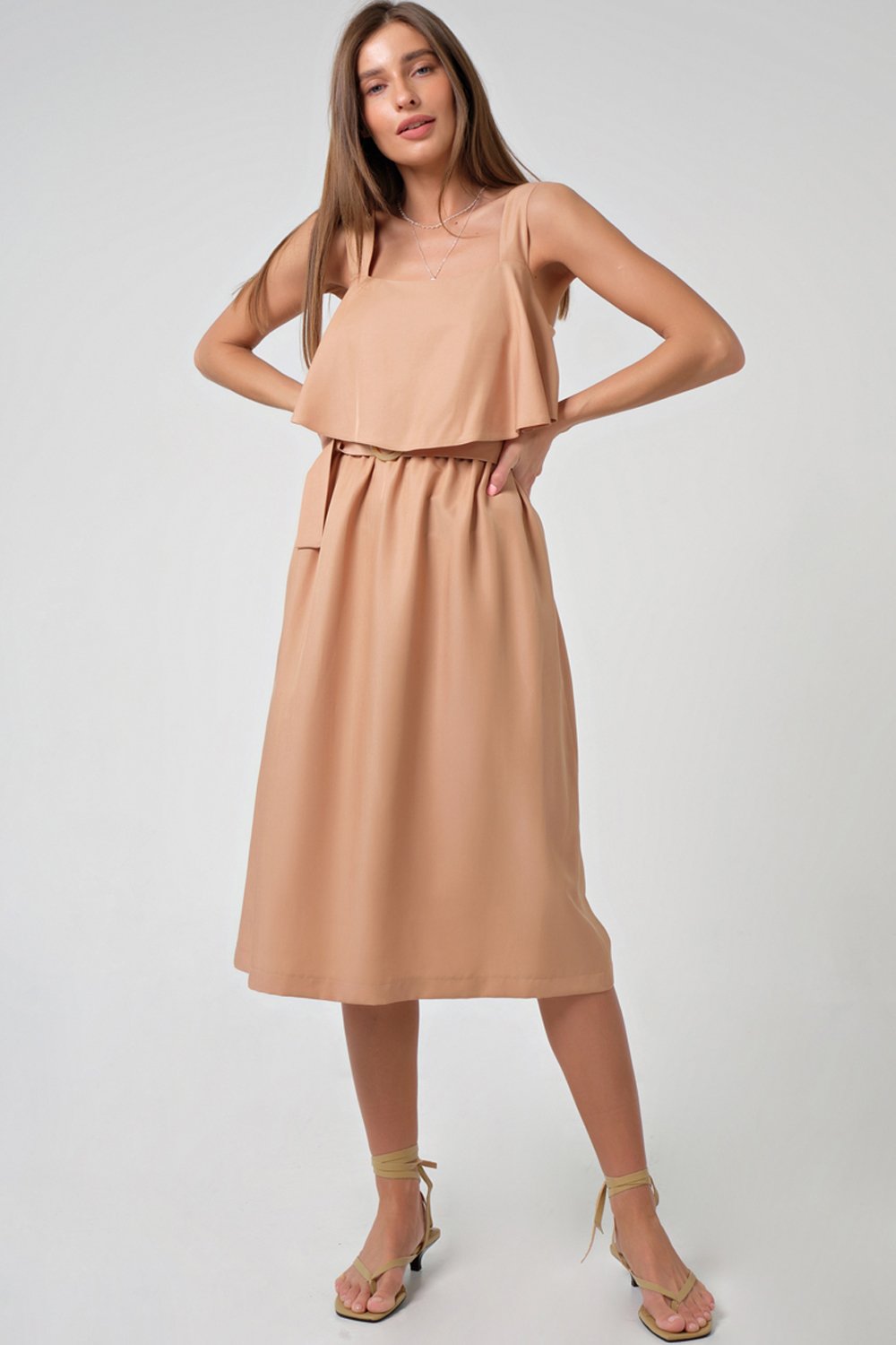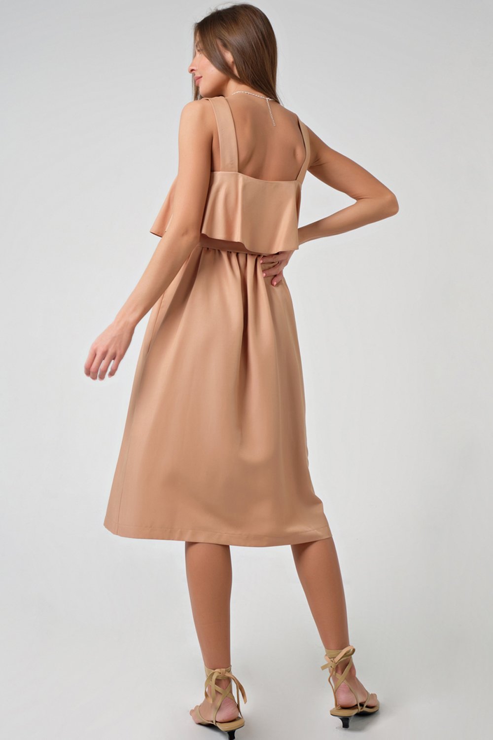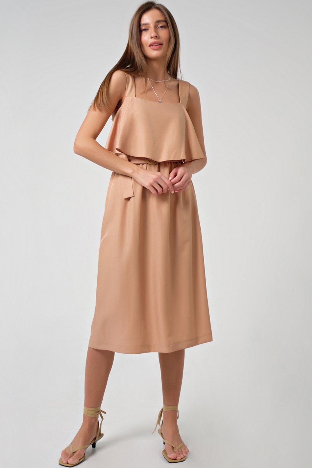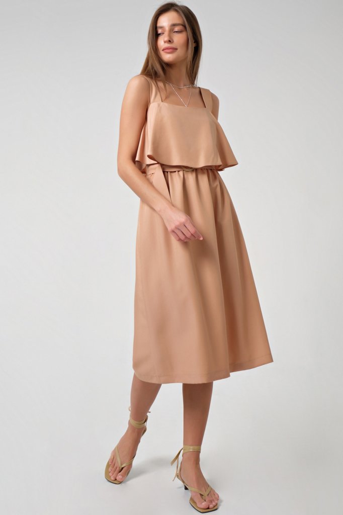 • Особенности: Платье полуприлегающего силуэта из плательной ткани. Детали: отлетная кокетка верха, широкие бретели, сборка по талии на резинку, съемный пояс с пряжкой в комплекте.