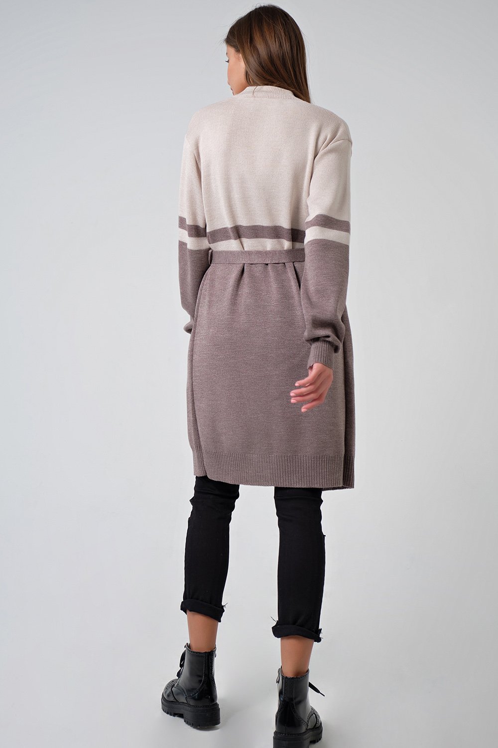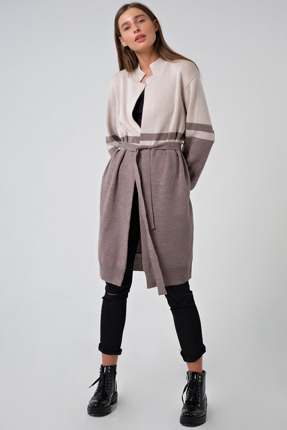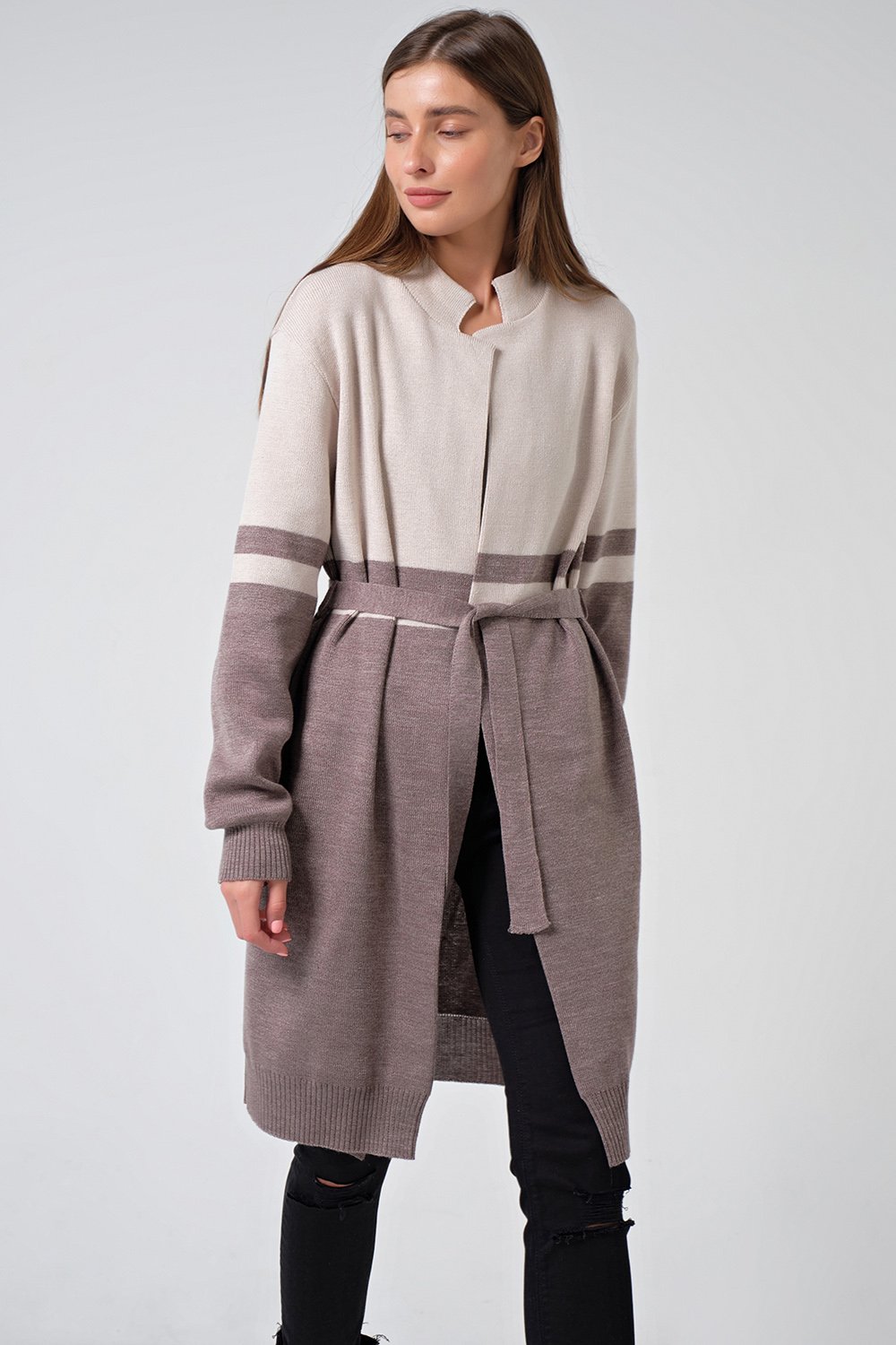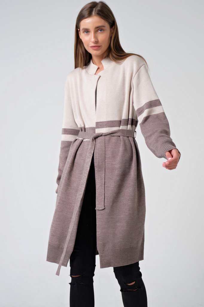• Особенности: Мягкий и плотный вязаный двухцветный кардиган на поясе. Изготовлен из смесовой пряжи хлопка и шерсти. Силуэт прямой. Рукава и низ изделия оформлены резинкой в рубчик.