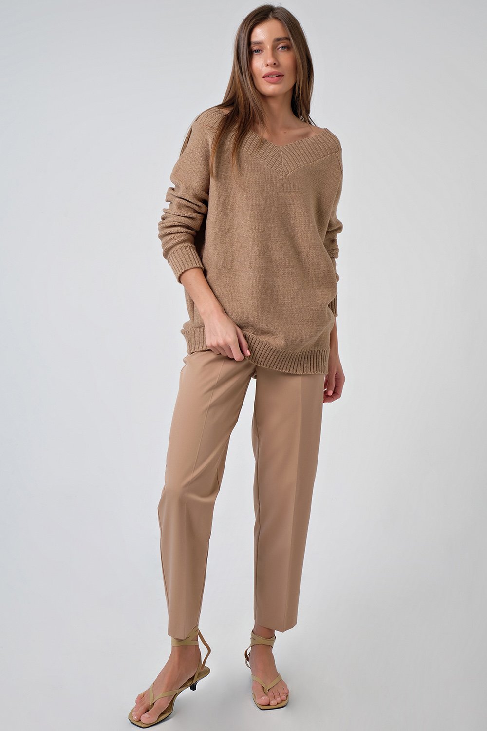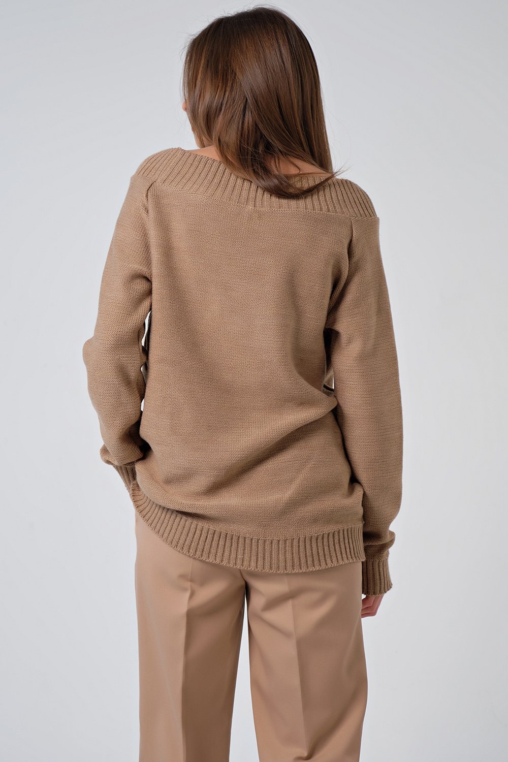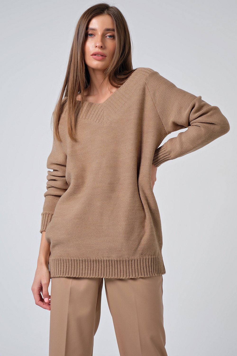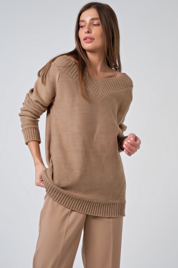• Особенности: Вязаный джемпер выполнен из смесовой пряжи фактурным мягким способом. Рукав реглан с манжетами глубокий V-образный вырез горловины оформлен широкой резинкой в рубчик.
