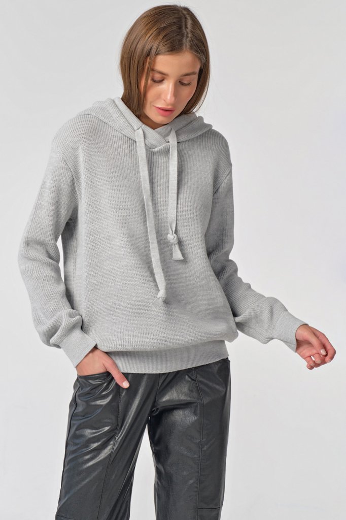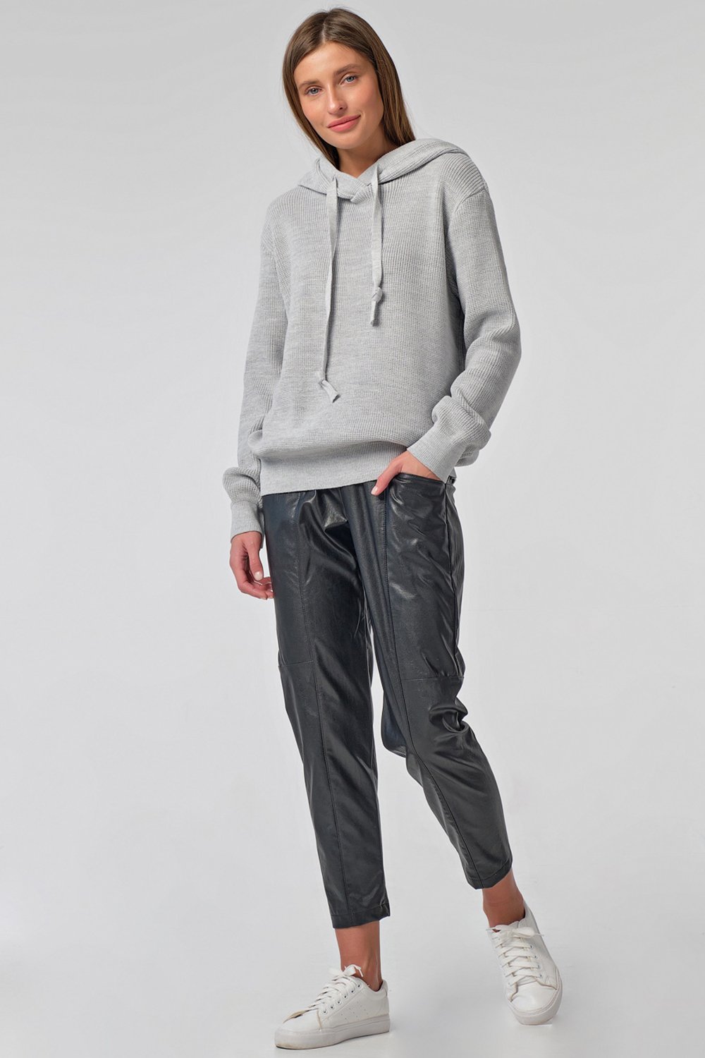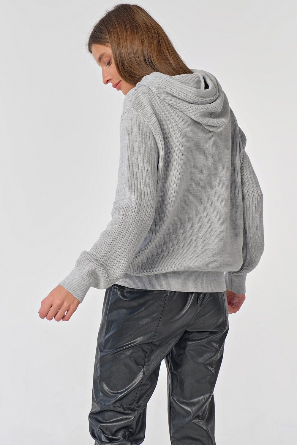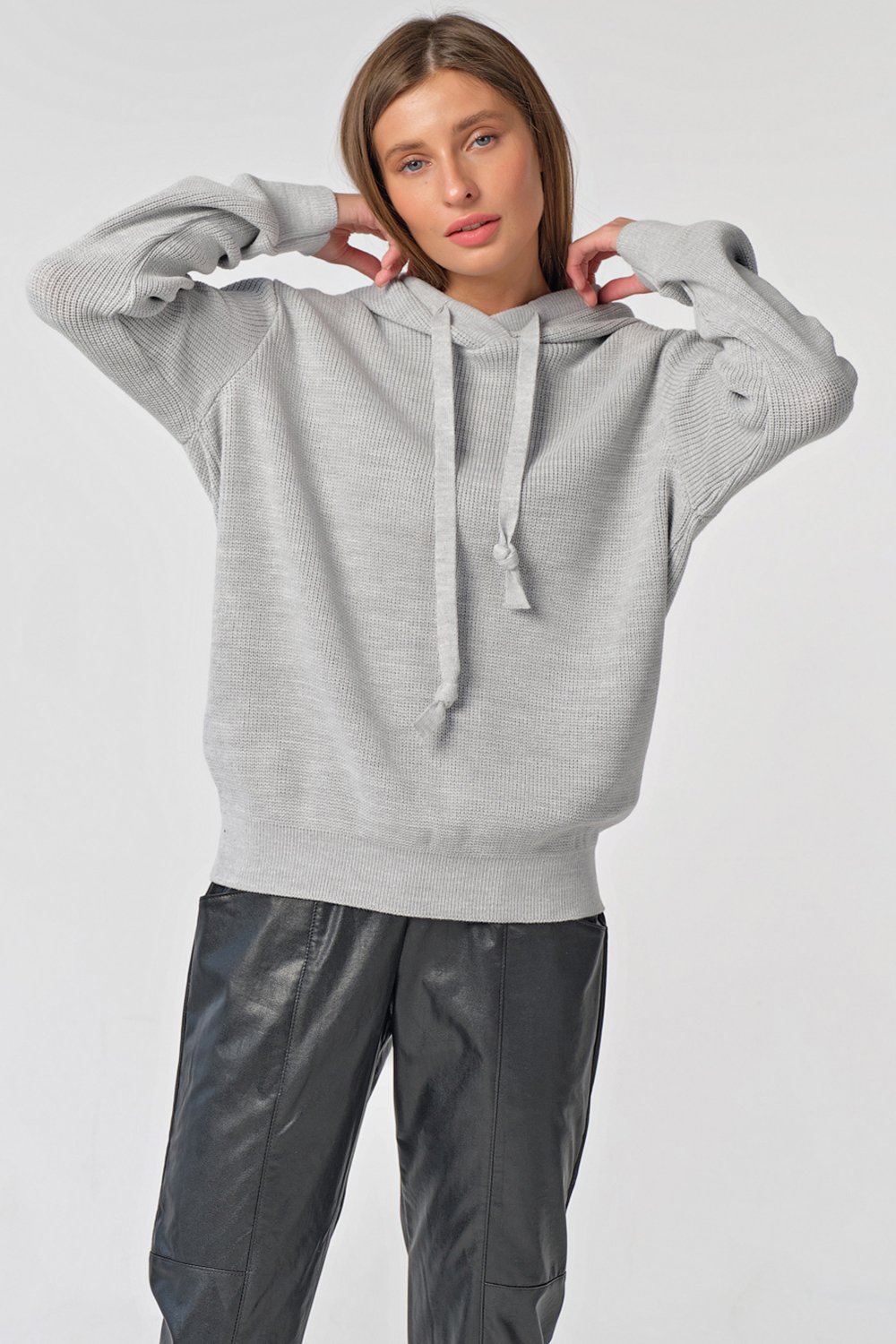 • Особенности: Объемный вязаный джемпер выполнен с капюшоном с вязаным шнуром. Низ изделия и рукавов выполнены резинкой в рубчик.