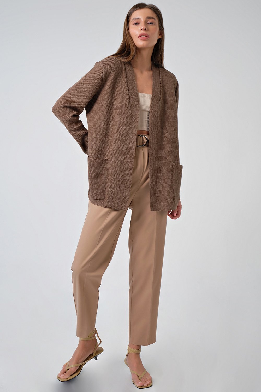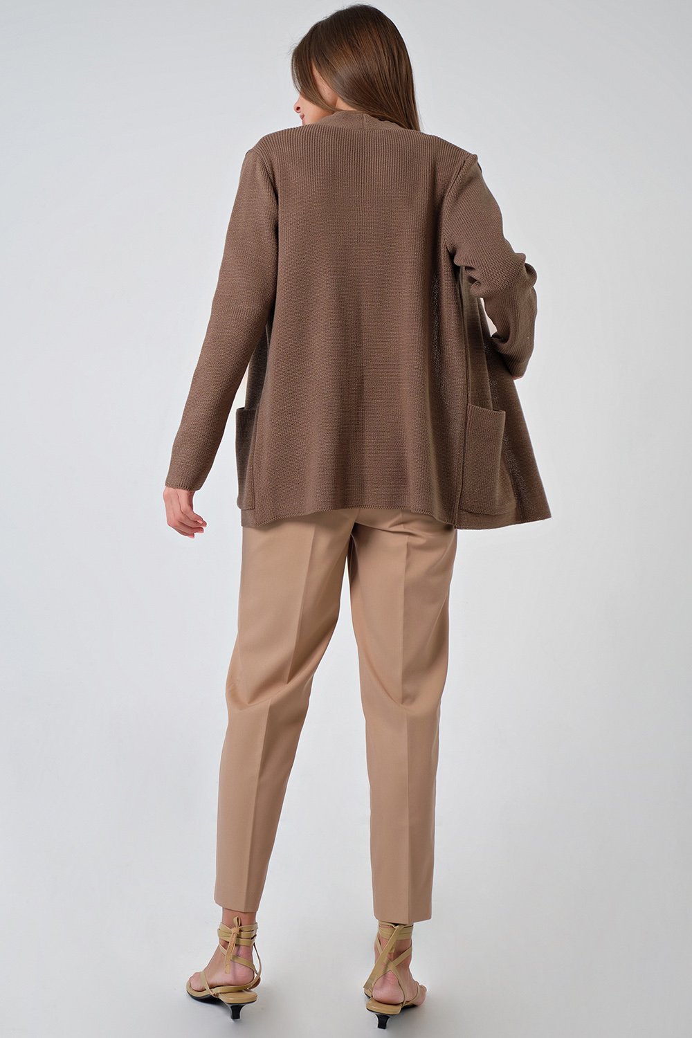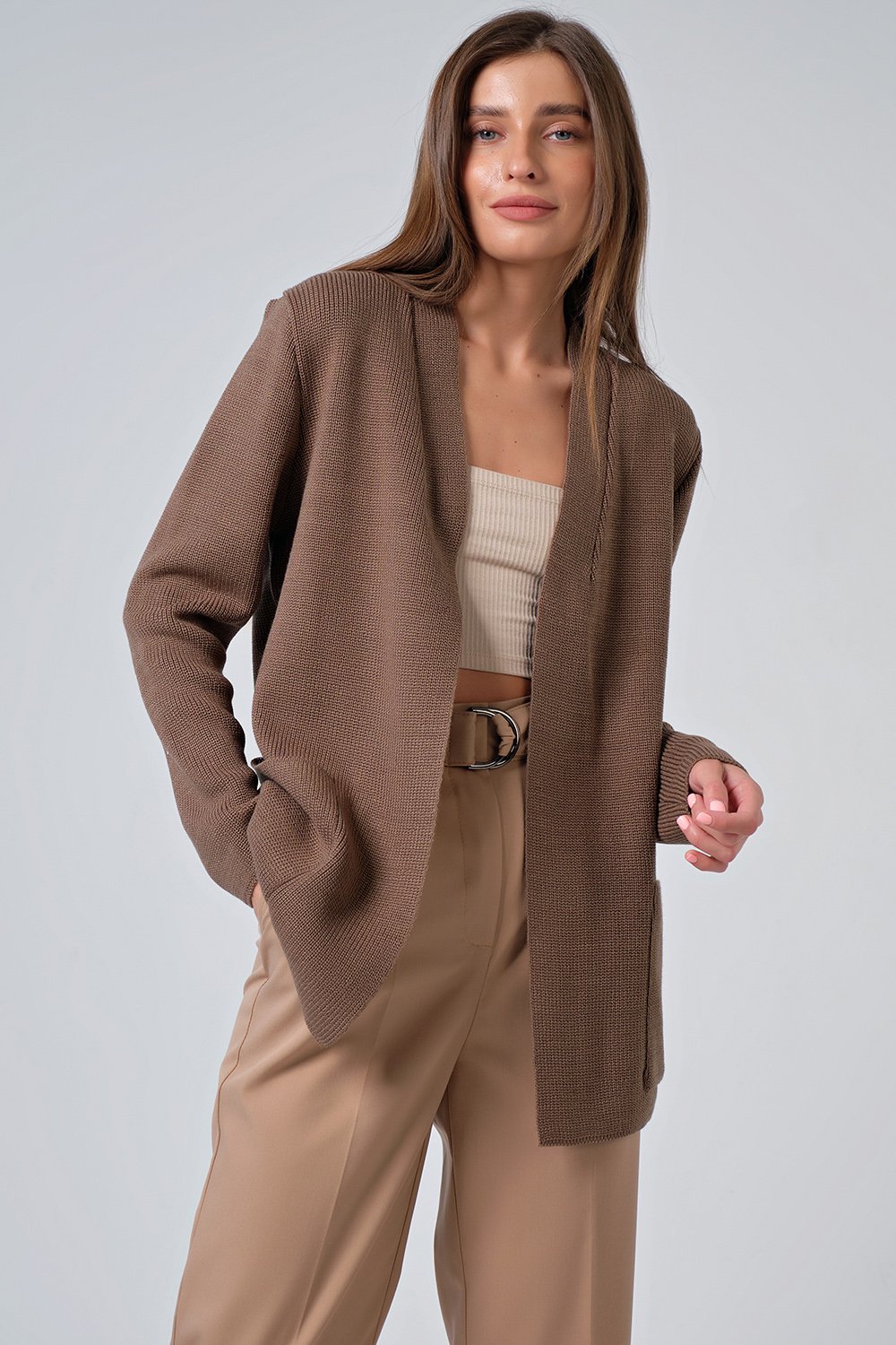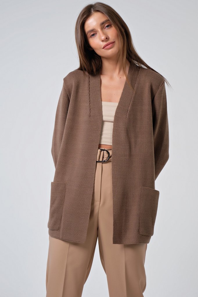 • Особенности: Вязаный кардиган прямого силуэта с карманами выполнен фактурной вязкой из пряжи с содержанием хлопка дополнен декоративной выточкой по переду.