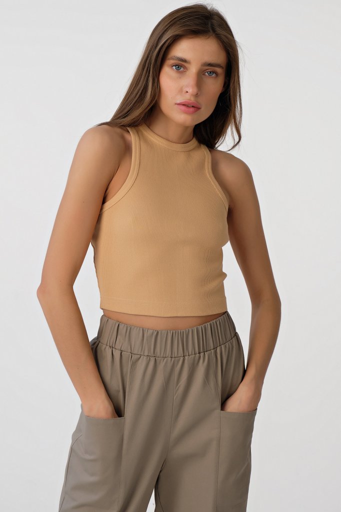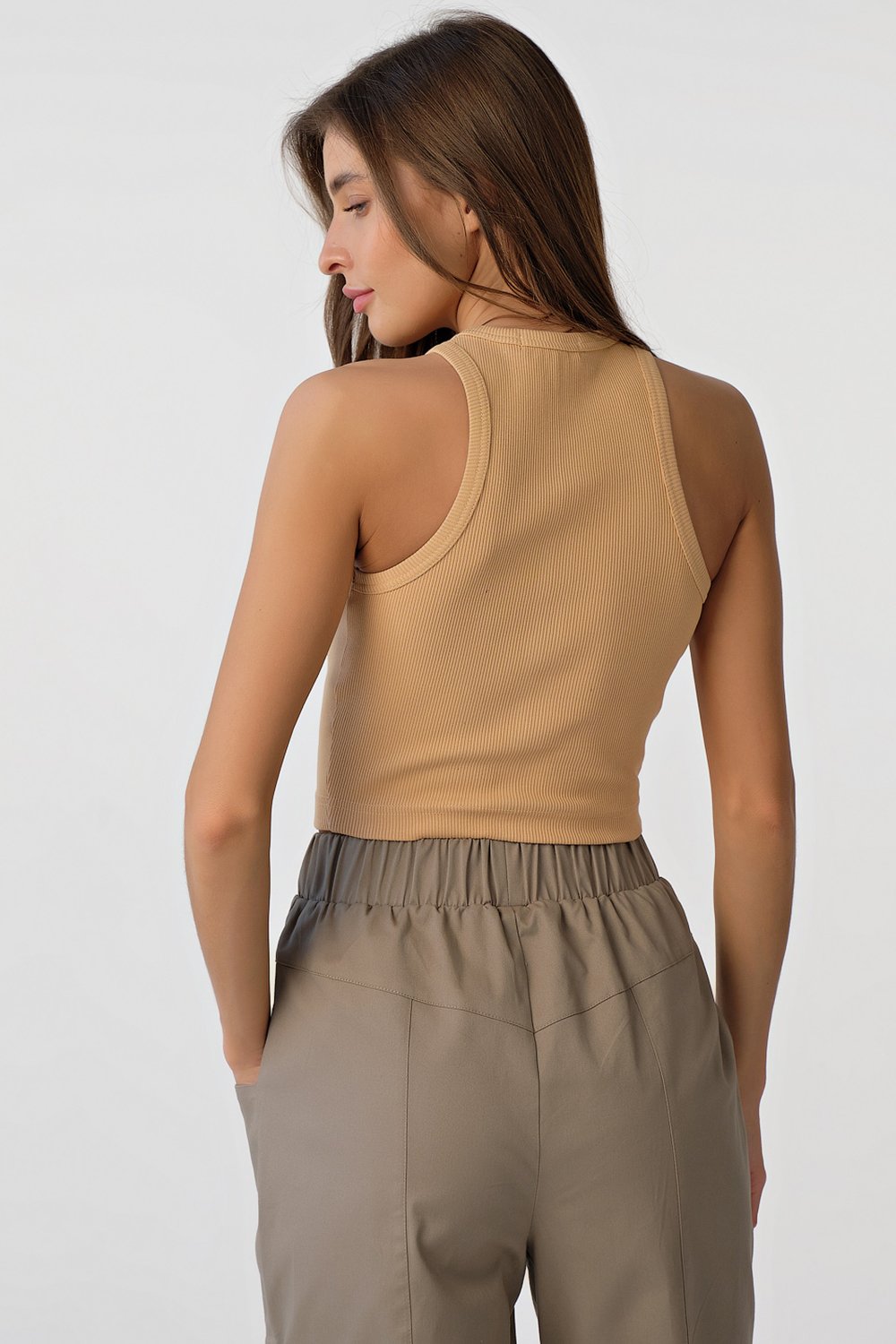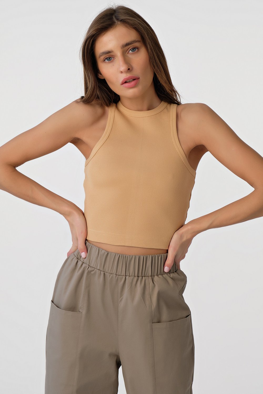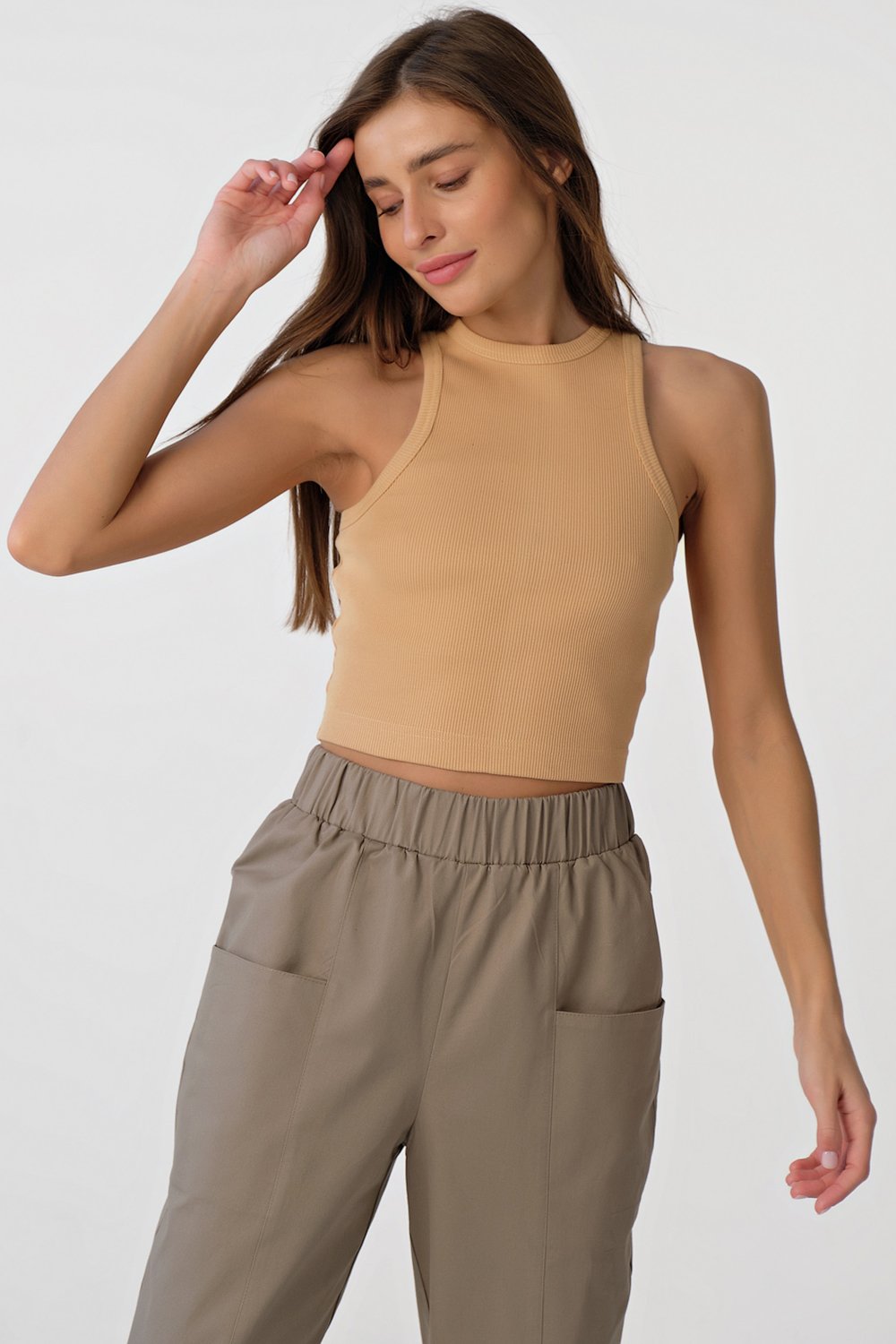 • Особенности: Укороченный топ из кашкорсе. Детали: завышенная пройма проймы и горловина обработаны окантовкой. Без застежки.