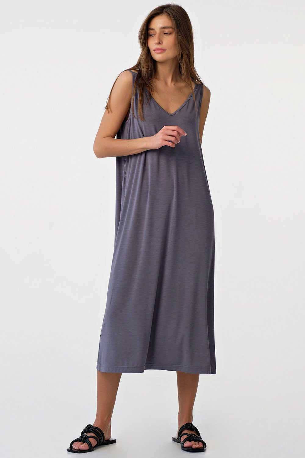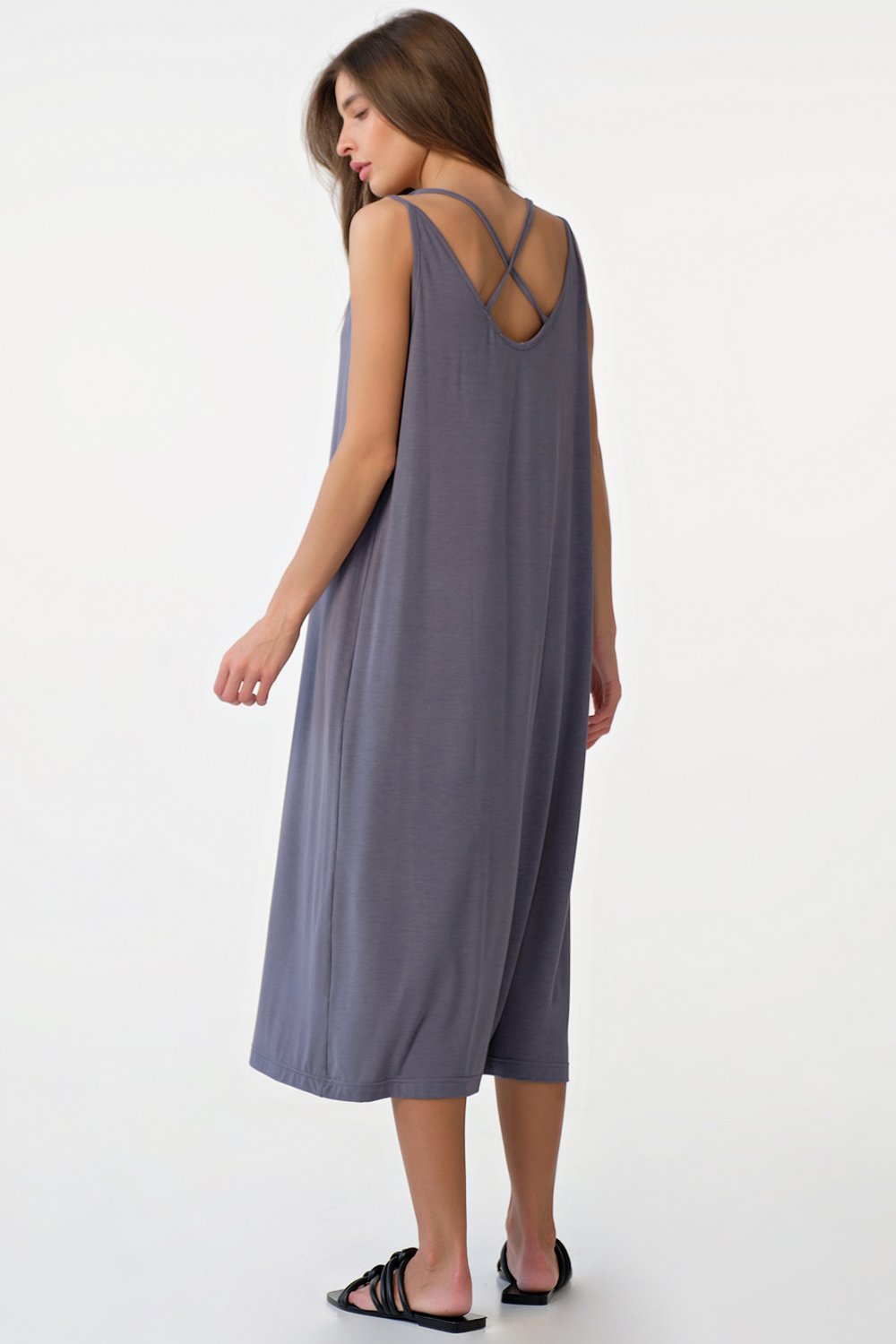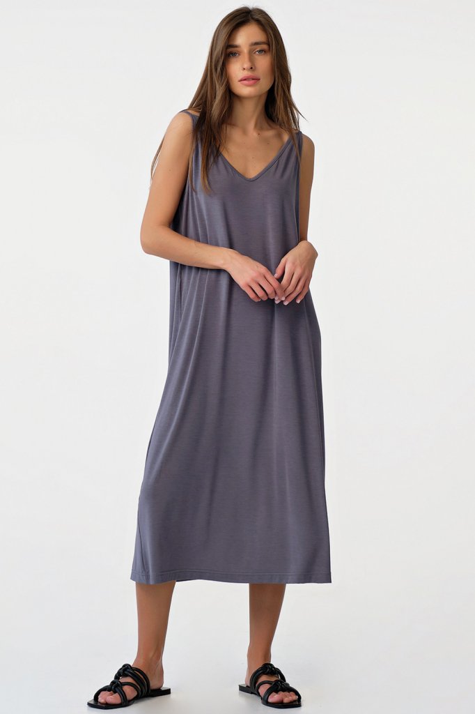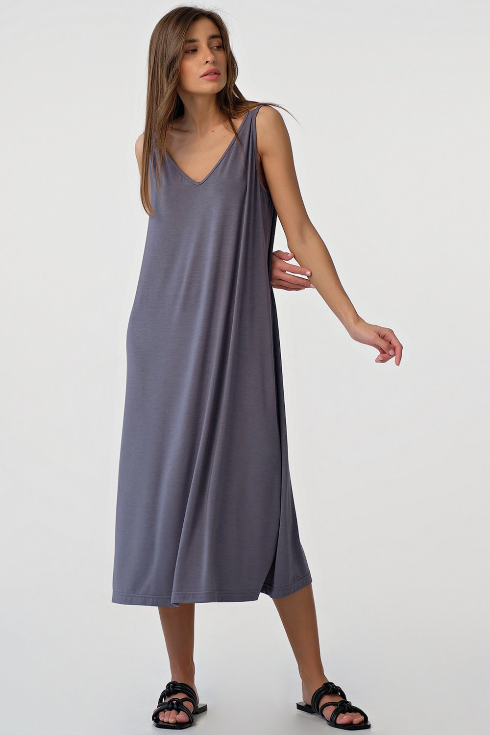 • Особенности: Платье расклешенного силуэта из трикотажа. Детали:V-образный вырез по переду и спинке тонкие бретели с перекрестным креплением на спинке. Без застежки.