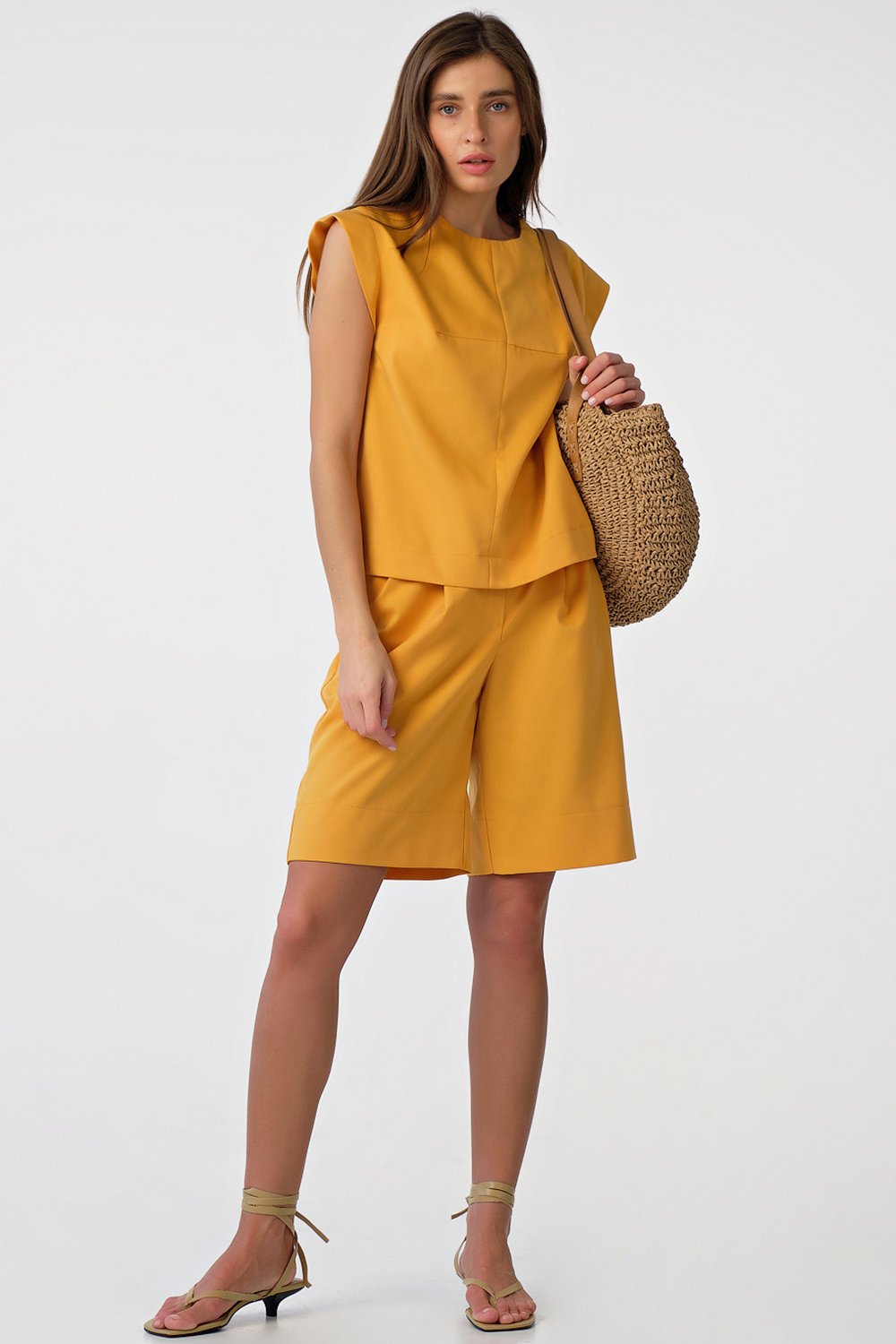 • Особенности: Топ прямого силуэта из костюмной ткани. Детали: вертикальное сечение по переду, нагрудные вытачки от центрального шва, горловина обработана обтачкой, рукав-крылышко, широкая подгибка по низу. Застежка на молнию по спинке.