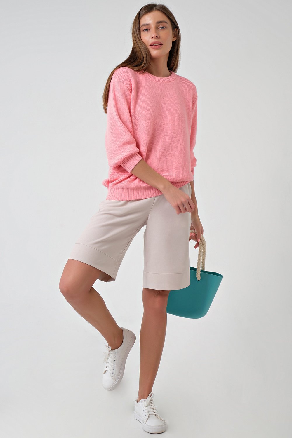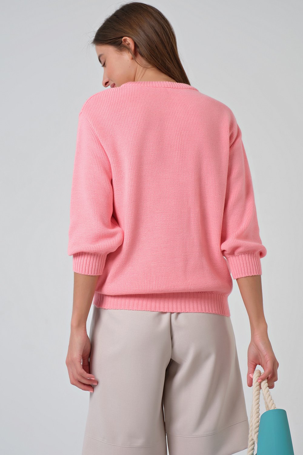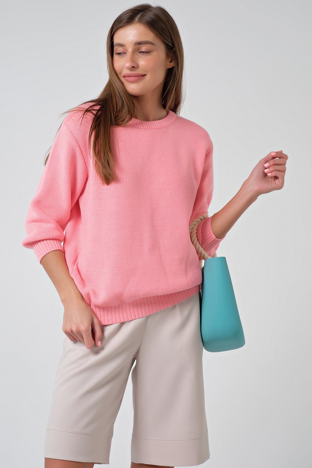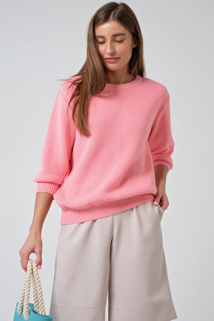 • Особенности: Вязаный джемпер с рукавами 3/4 на манжете. Низ изделия, рукава, воротник оформлены резинкой в рубчик.