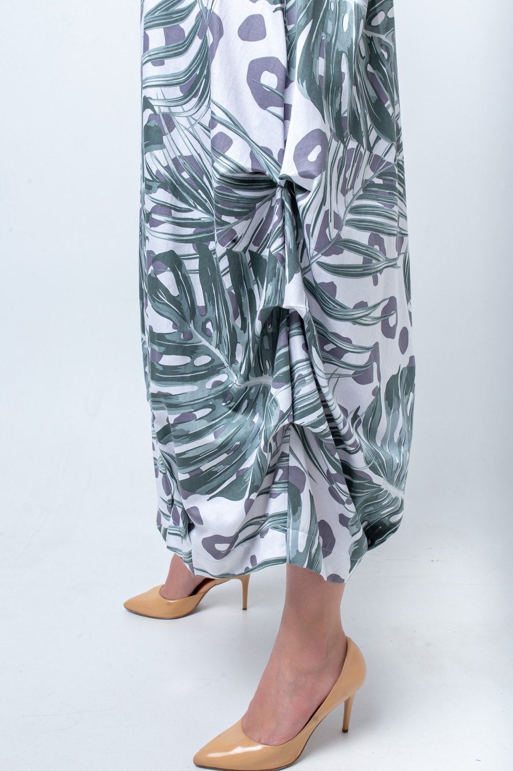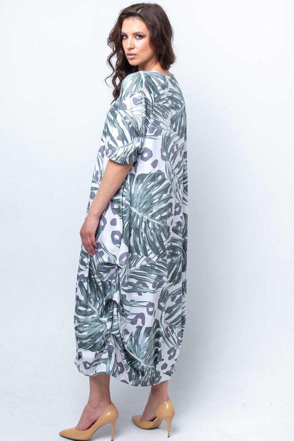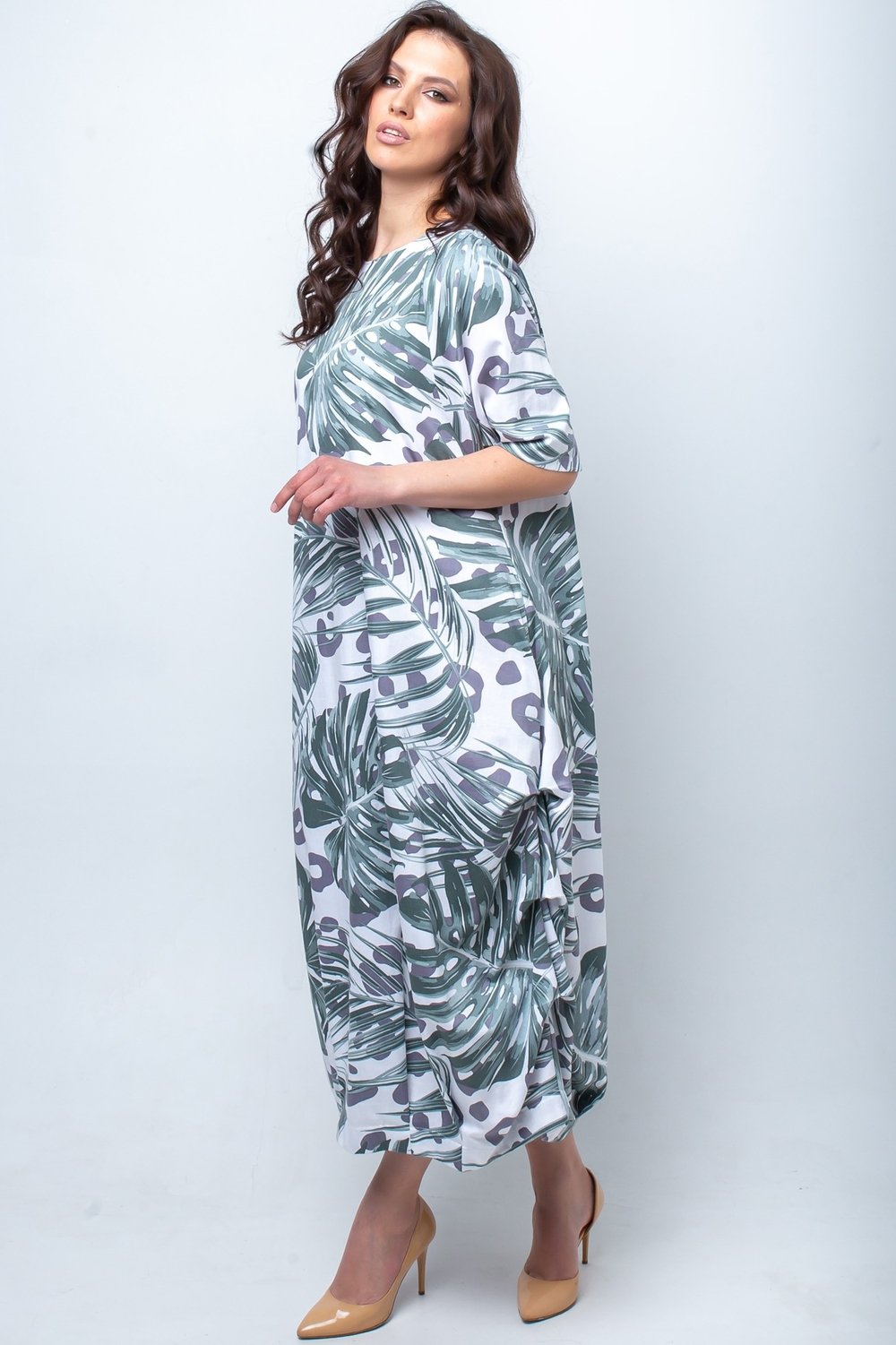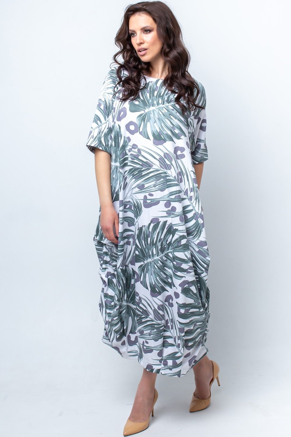 Платье женское трапециевидного силуэта, с карманами и складками в боковых швах. Горловина круглая, рукав втачной, короткий.Характеристики: