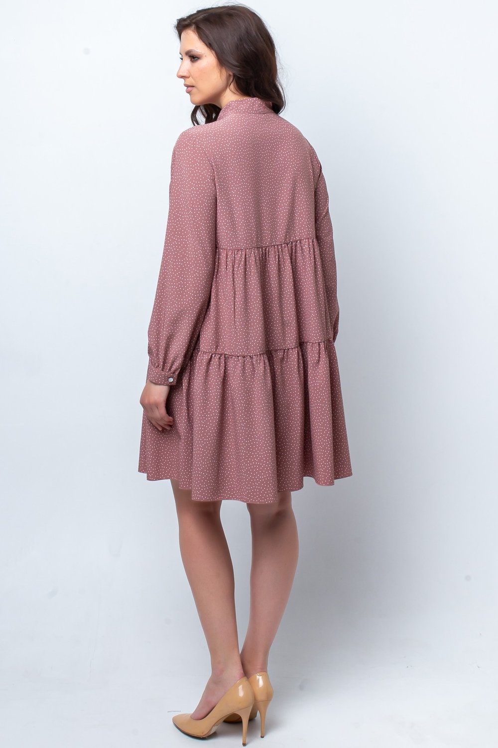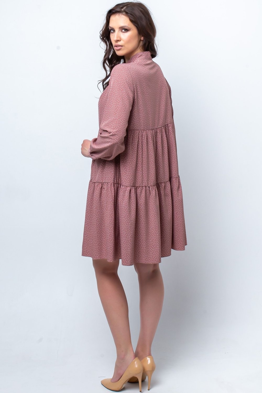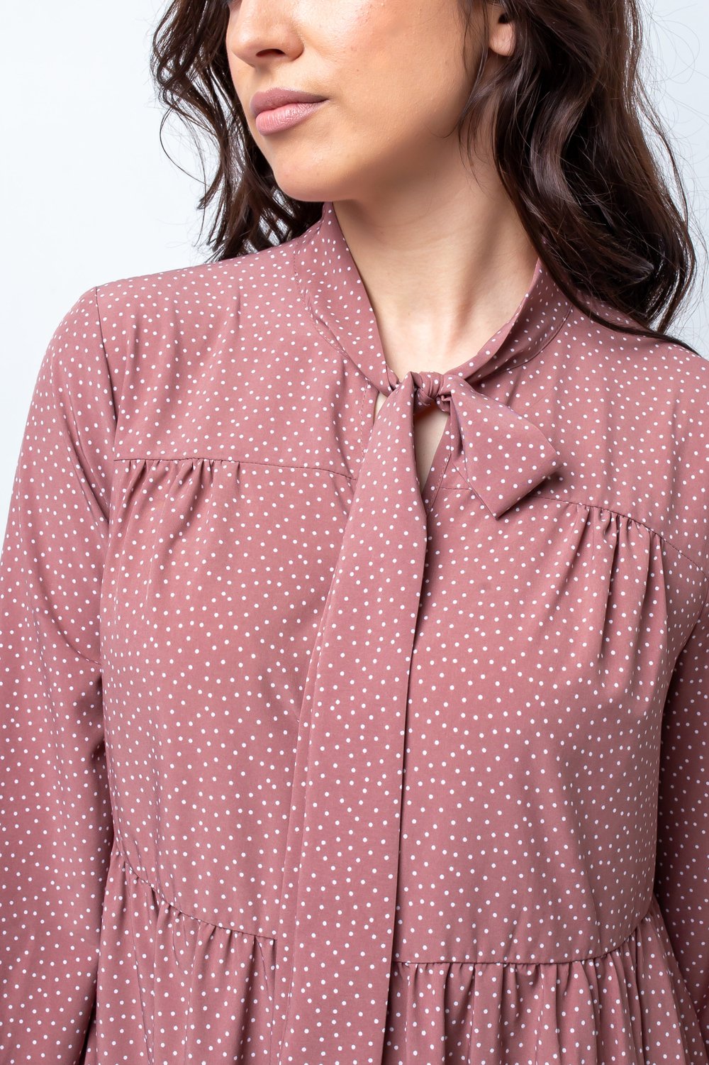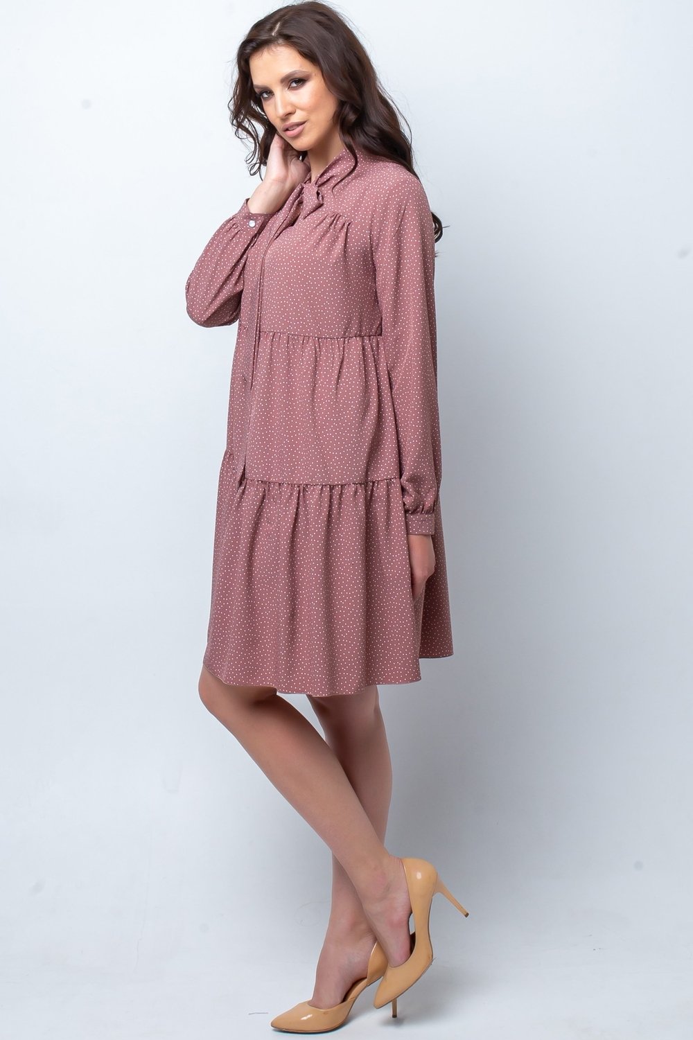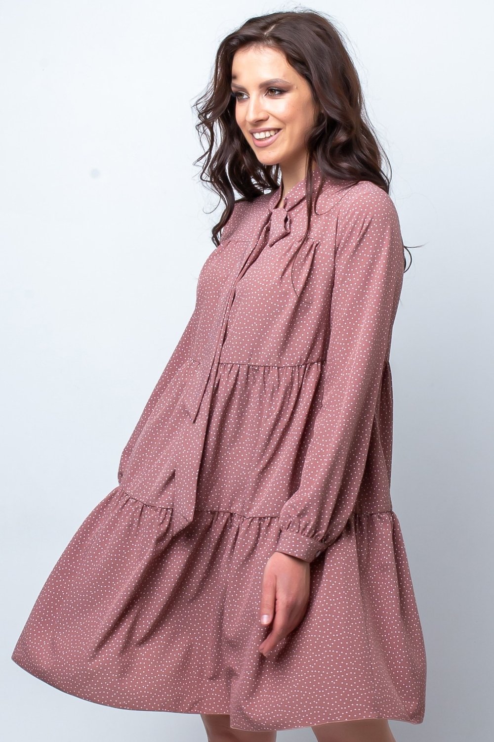 Платье женское трапециевидного силуэта, отрезное выше линии талии. Нижняя часть переда и спинки из двух воланов, собранных в сборку. Верхняя часть переда с кокеткой. Горловина v образная с притачным воротником- галстуком, завязывающимся на бант. Рукав втачной, длинный, по низу на притачной манжете, застегивающейся на петлю и пуговицу. Платье без подкладки.