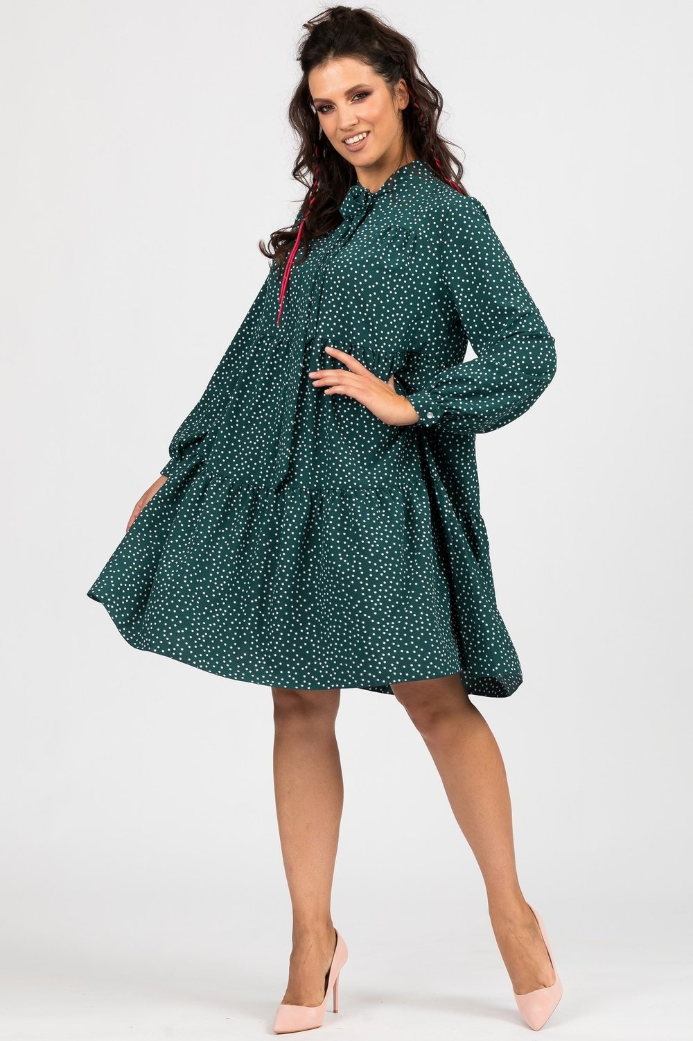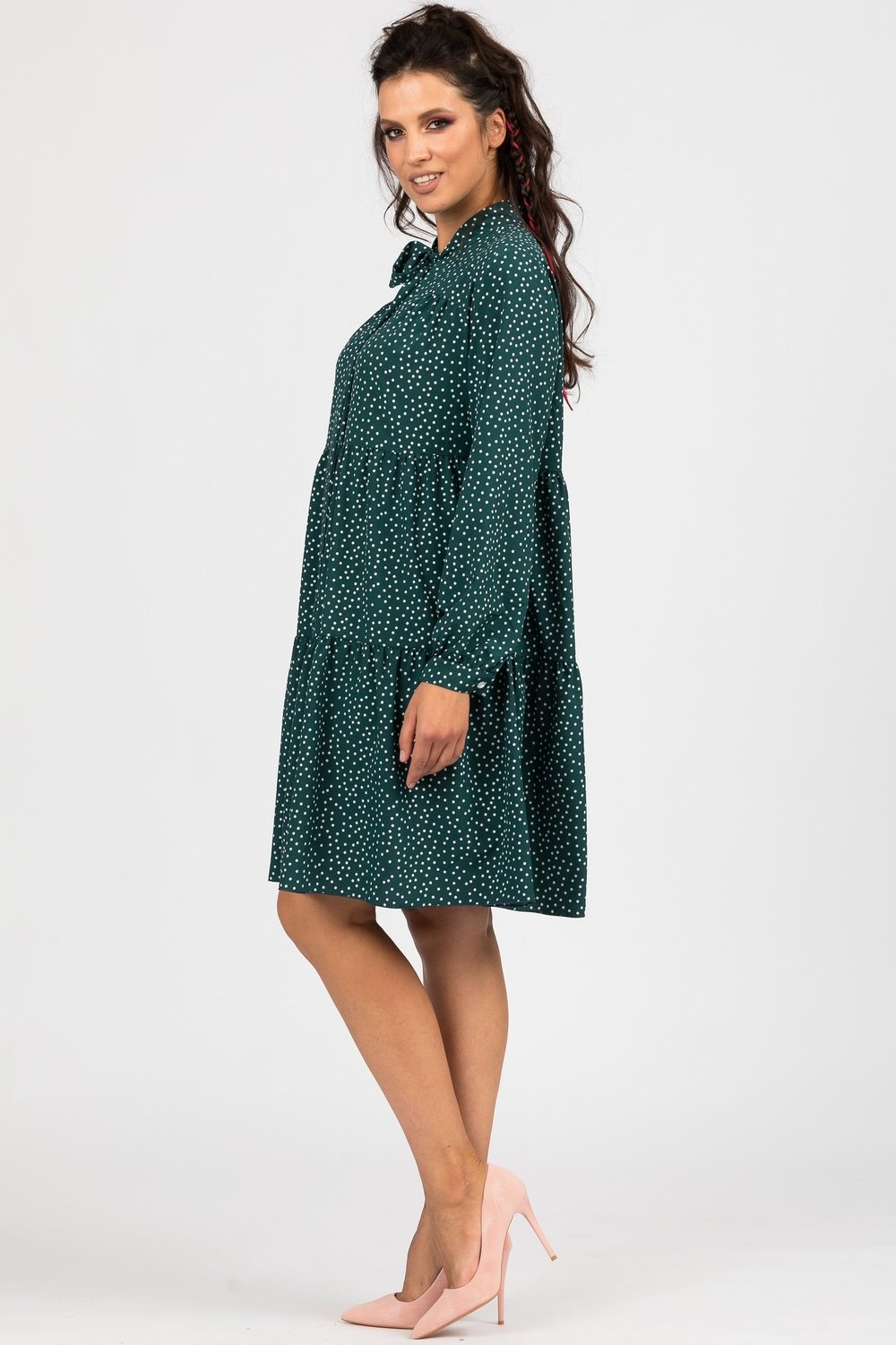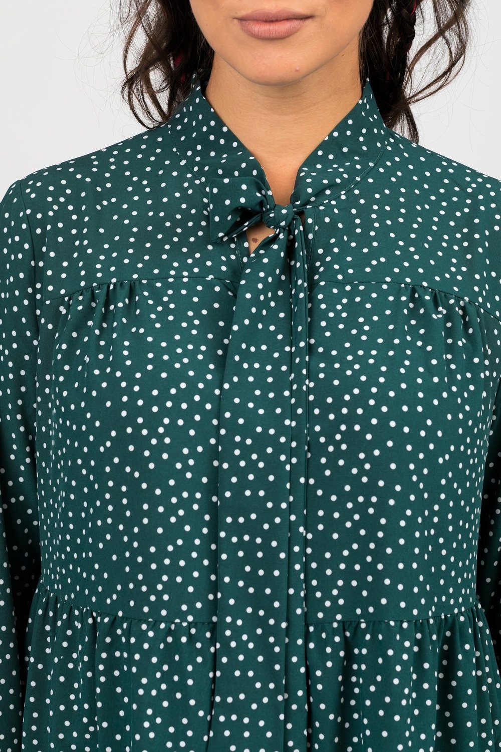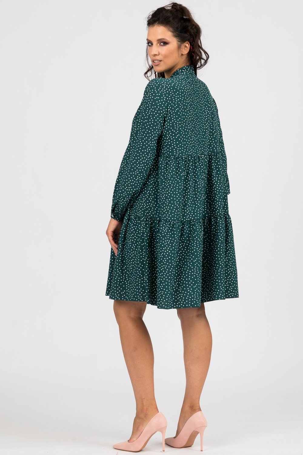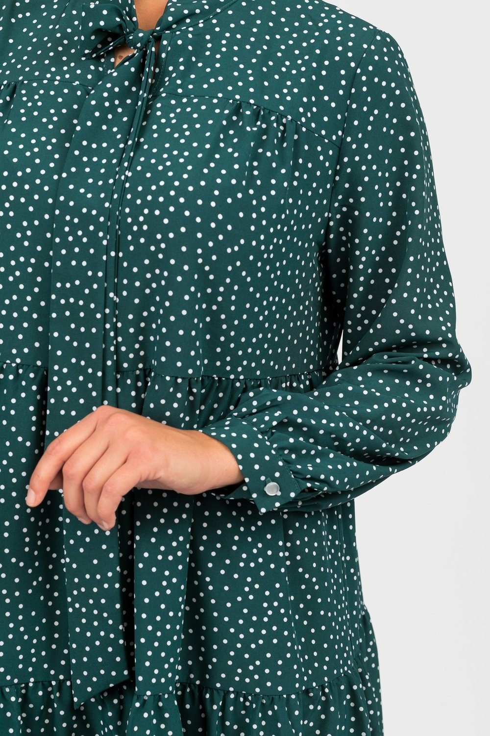 Платье женское трапециевидного силуэта, отрезное выше линии талии. Нижняя часть переда и спинки из двух воланов, собранных в сборку. Верхняя часть переда с кокеткой. Горловина v образная с притачным воротником- галстуком, завязывающимся на бант. Рукав втачной, длинный, по низу на притачной манжете, застегивающейся на петлю и пуговицу. Платье без подкладки.