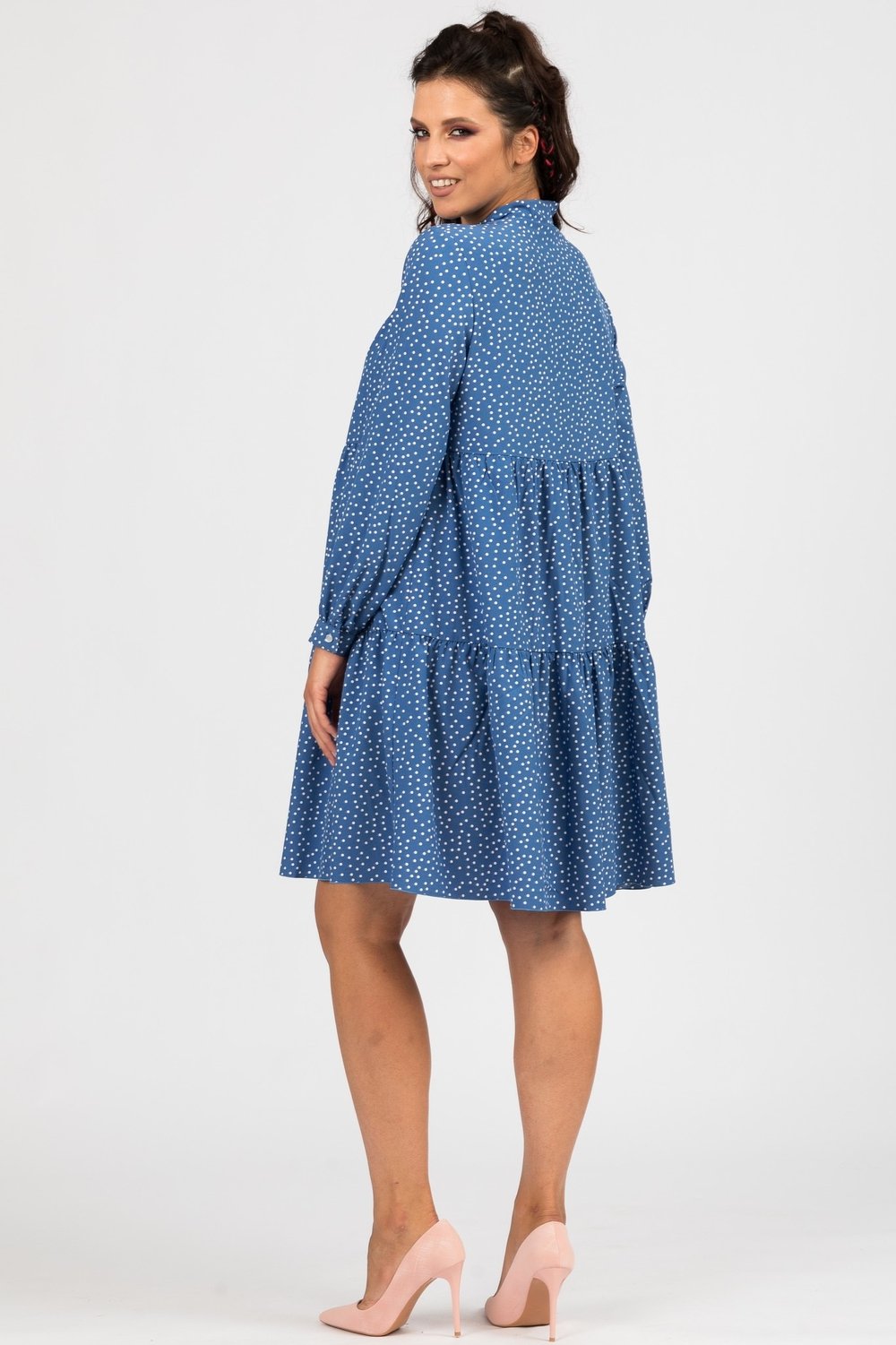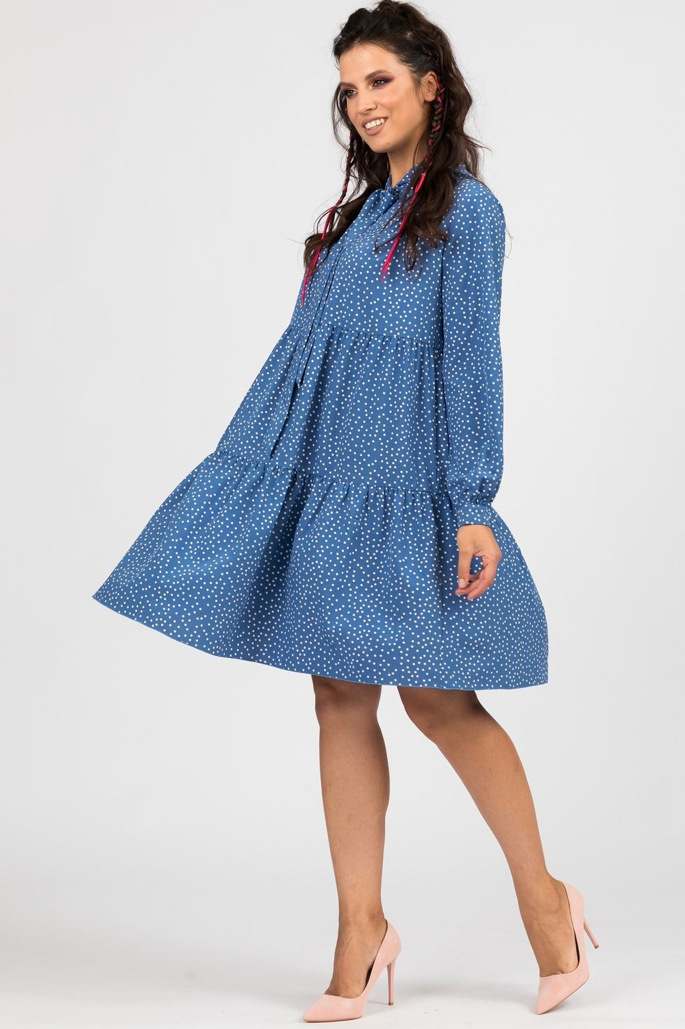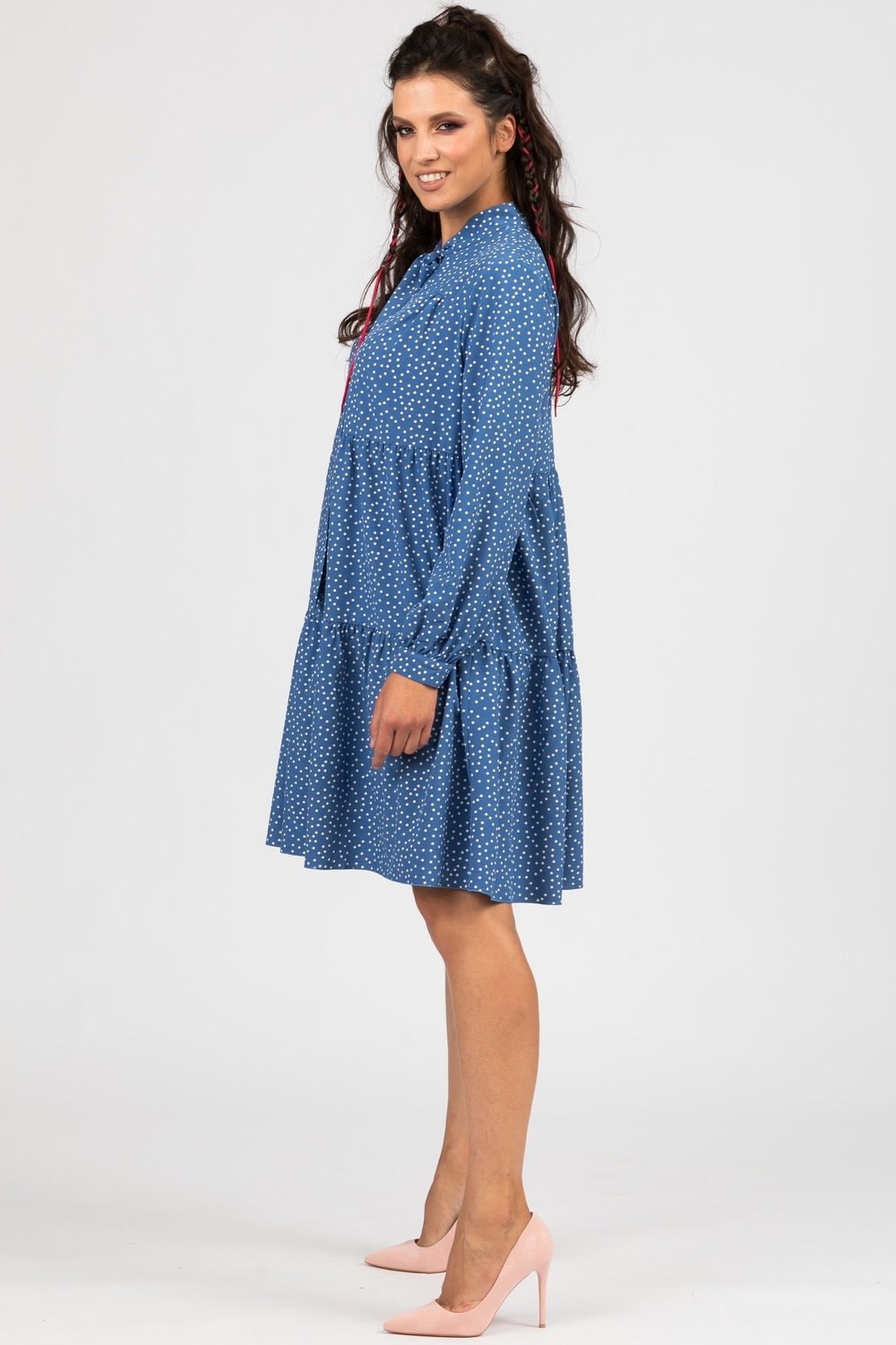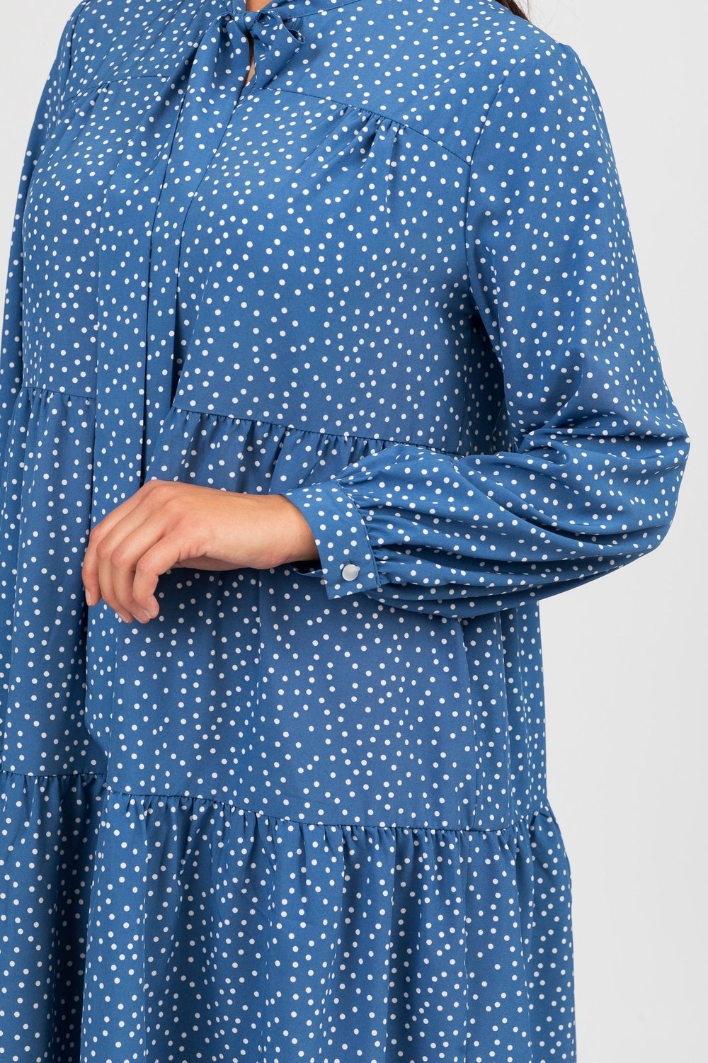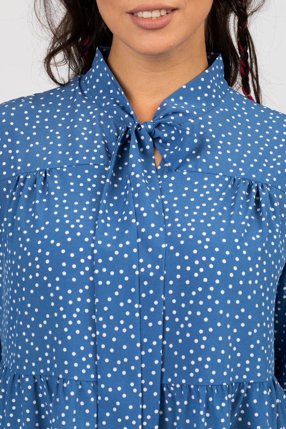 Платье женское трапециевидного силуэта, отрезное выше линии талии. Нижняя часть переда и спинки из двух воланов, собранных в сборку. Верхняя часть переда с кокеткой. Горловина v образная с притачным воротником- галстуком, завязывающимся на бант. Рукав втачной, длинный, по низу на притачной манжете, застегивающейся на петлю и пуговицу. Платье без подкладки.Характеристики: