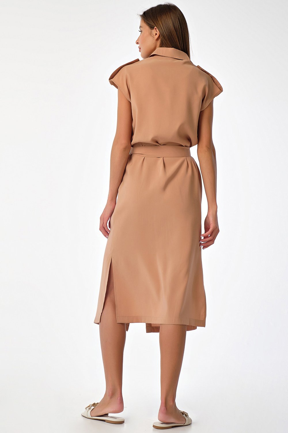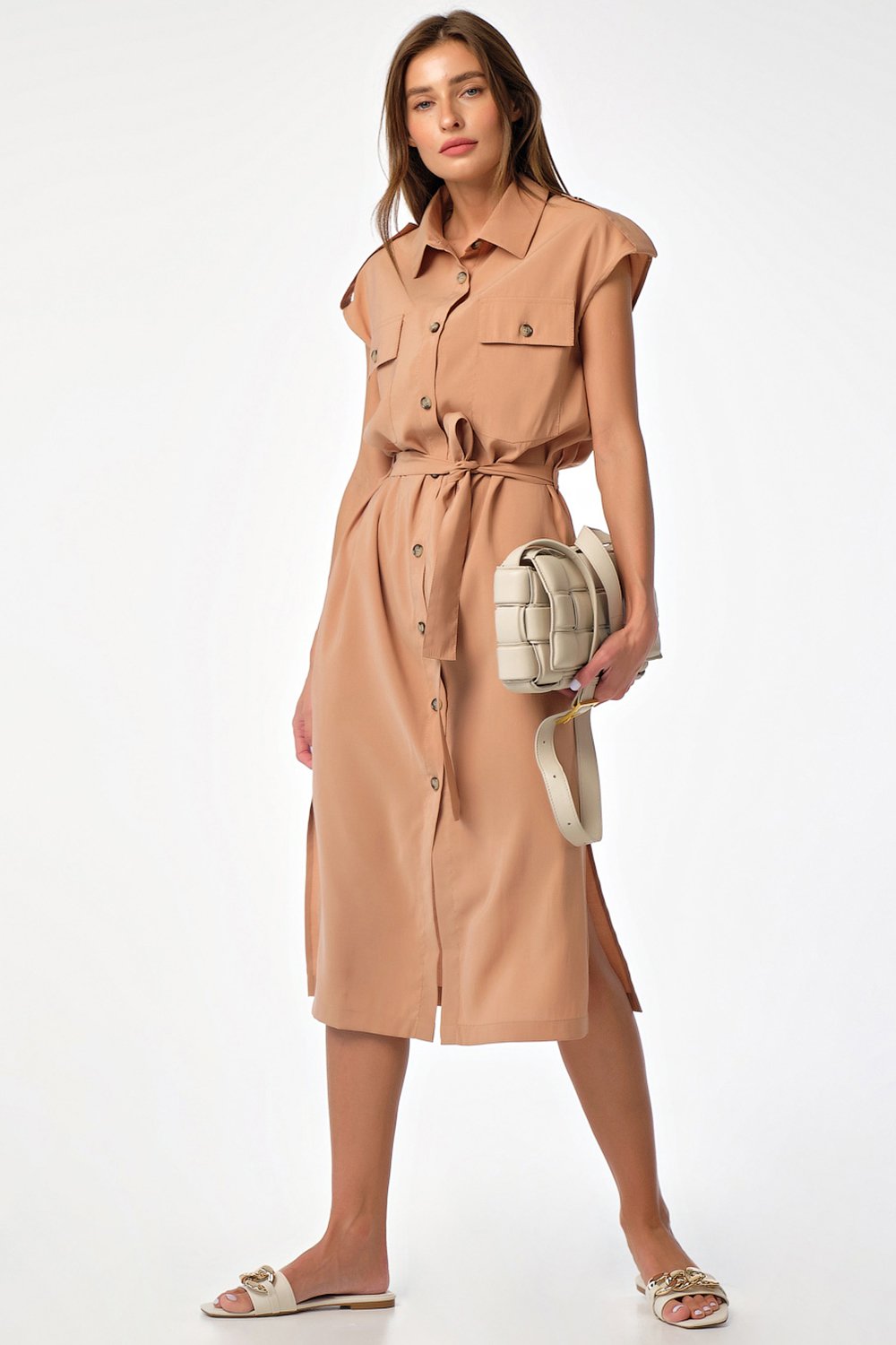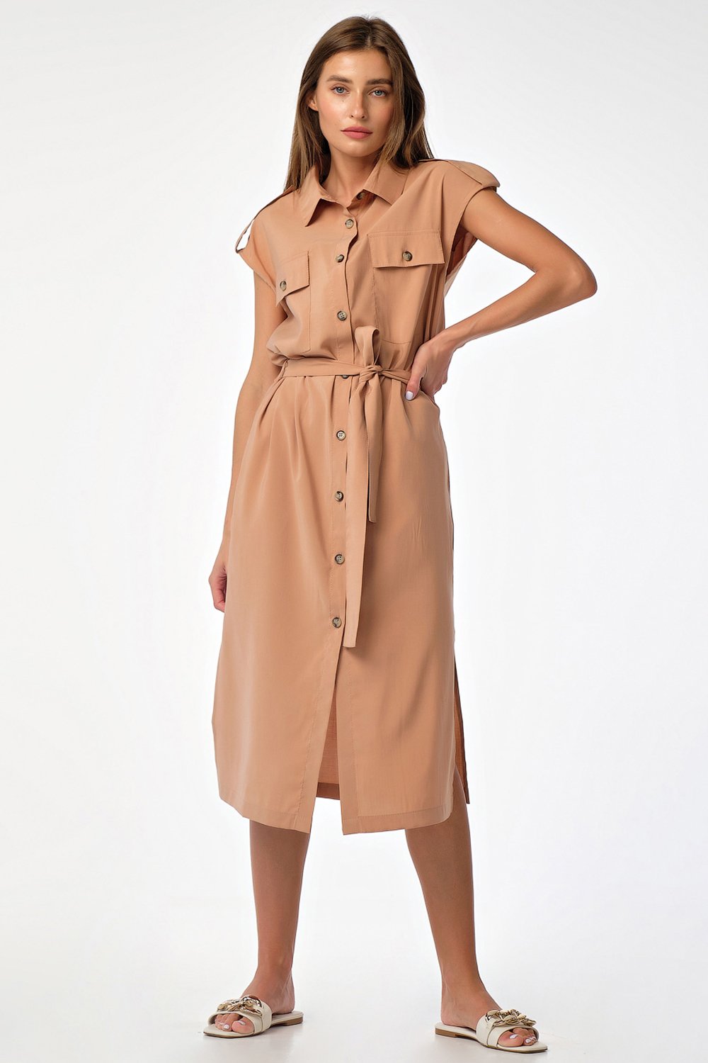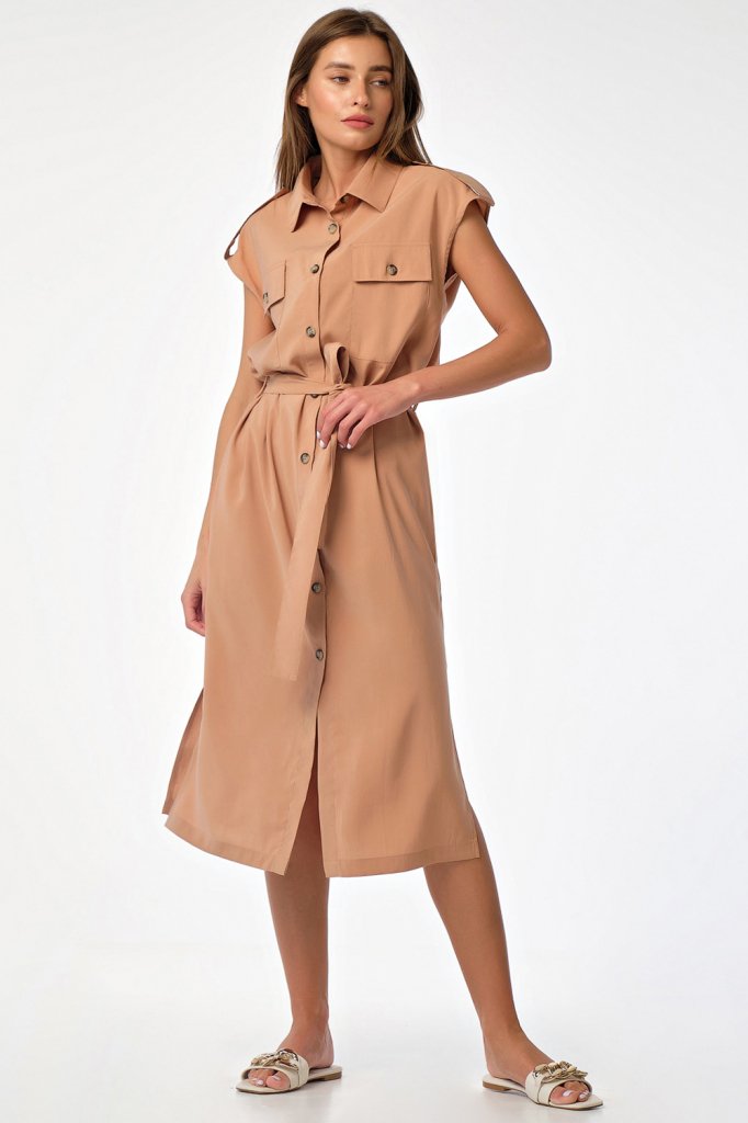 • Особенности: Платье прямого силуэта из плательной ткани. Детали: отложной воротник с цельновыкроенный стойкой спущенная линия плеча паты-погоны по плечевым накладные карманы с клапанами по переду карманы и разрезы в боковых швах съемный пояс. Застежка на петли-пуговицы по переду.