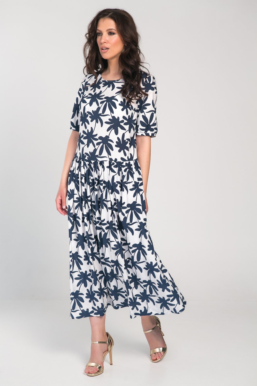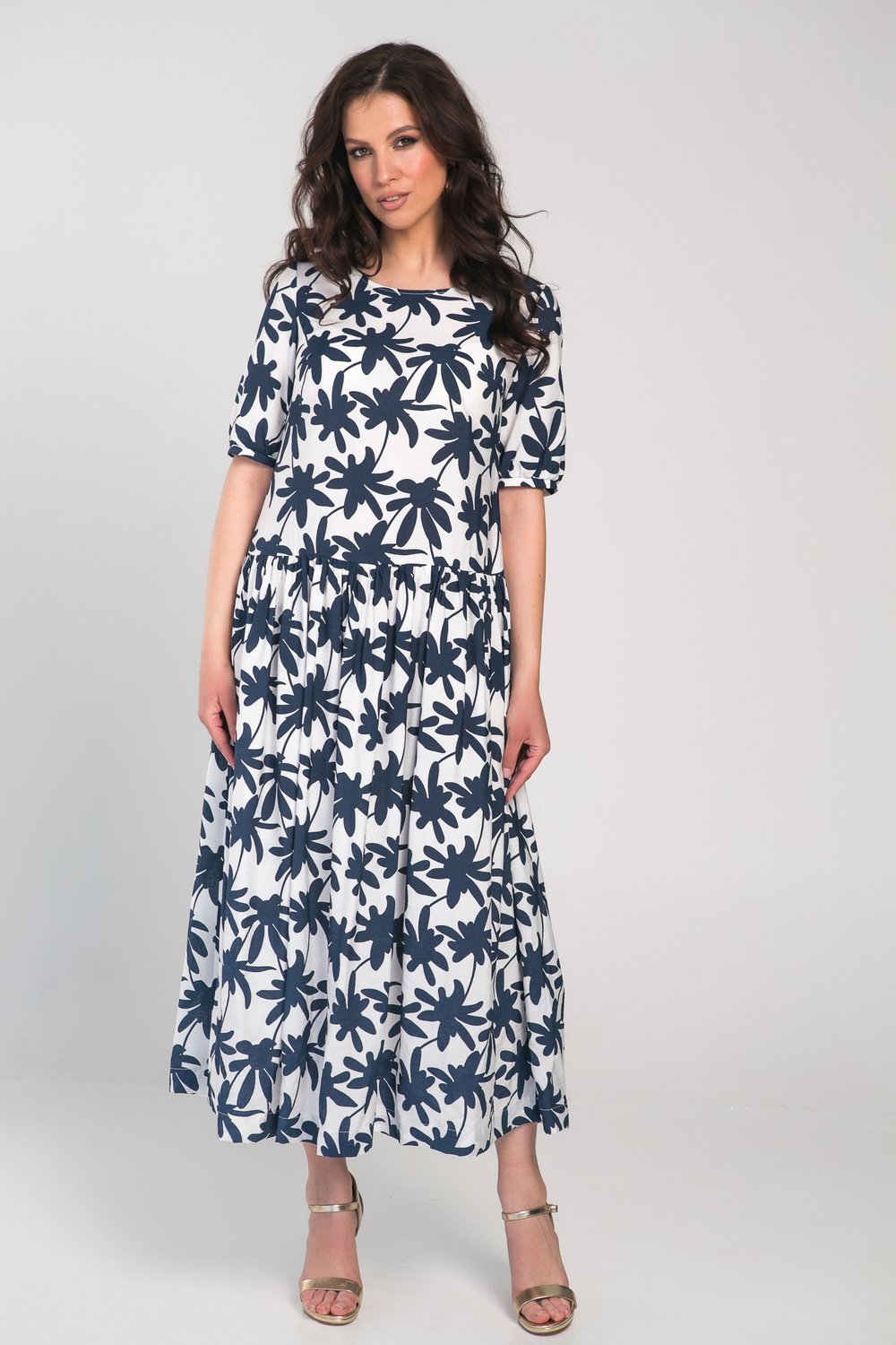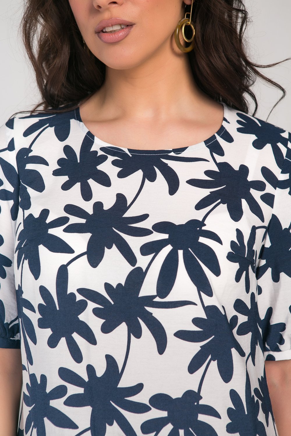 Платье прямого силуэта, отрезное выше линии бедер. Горловина круглая. Рукав втачной, короткий, по низу на притачной манжете. Нижняя часть переда и спинки по шву притачивания собрана в сборку.Характеристики: