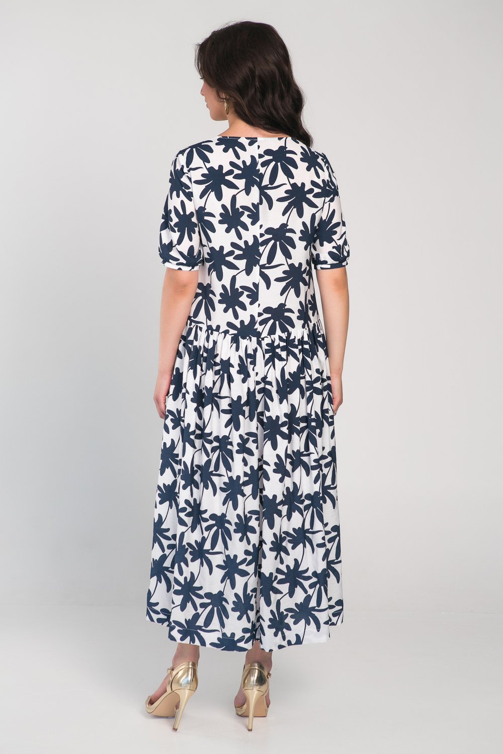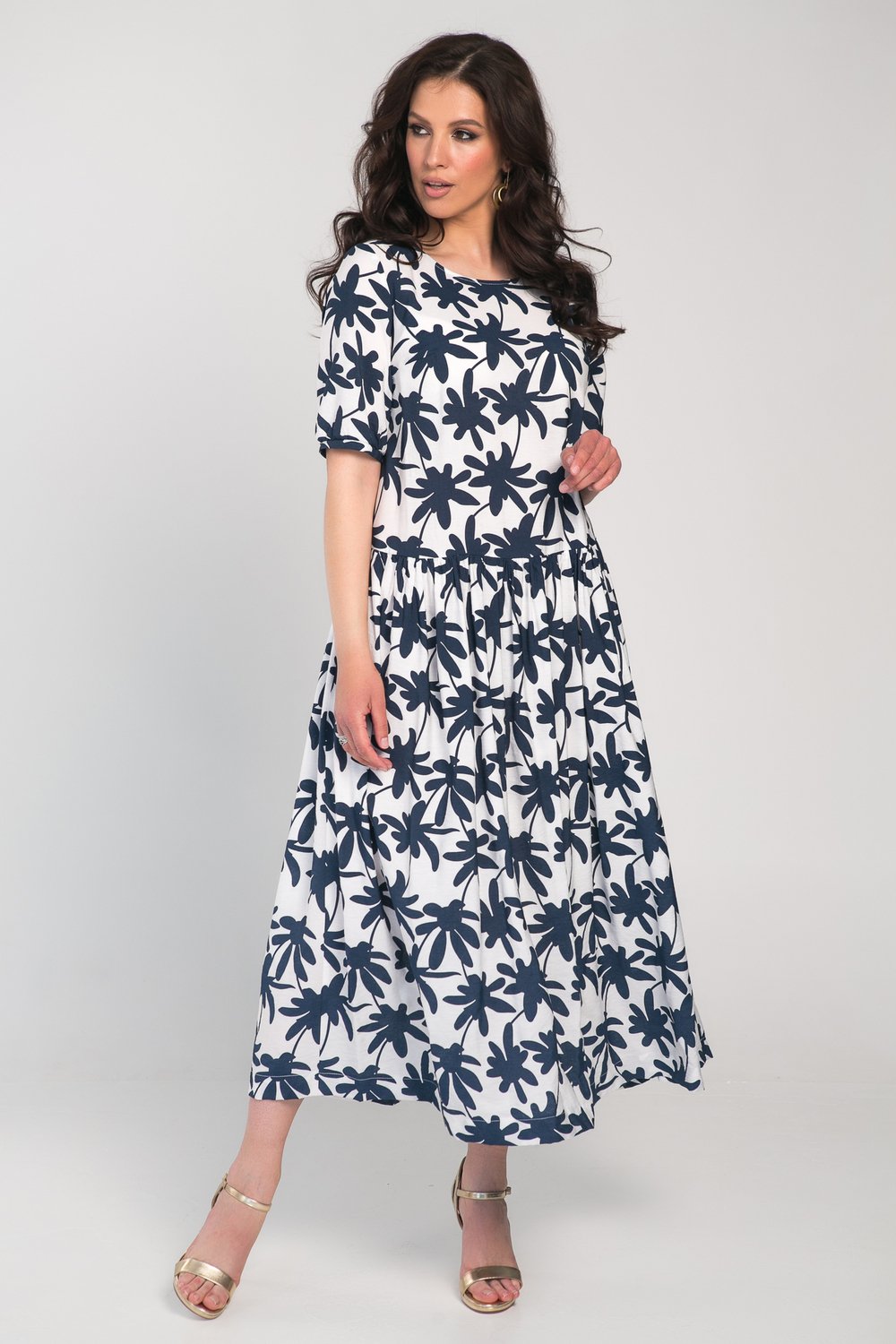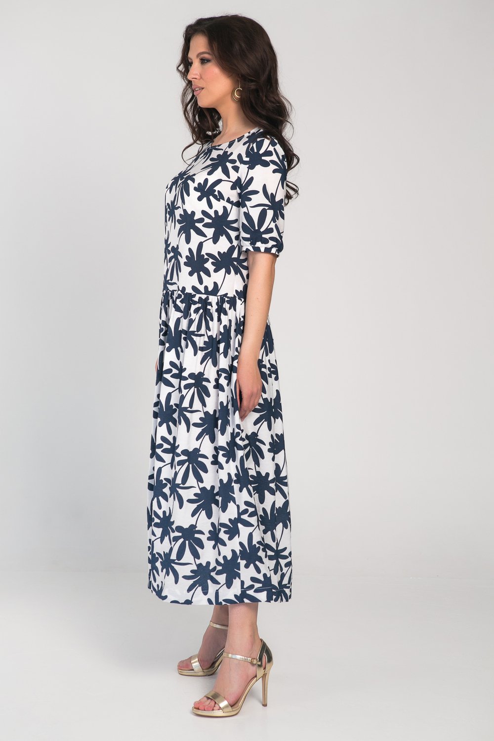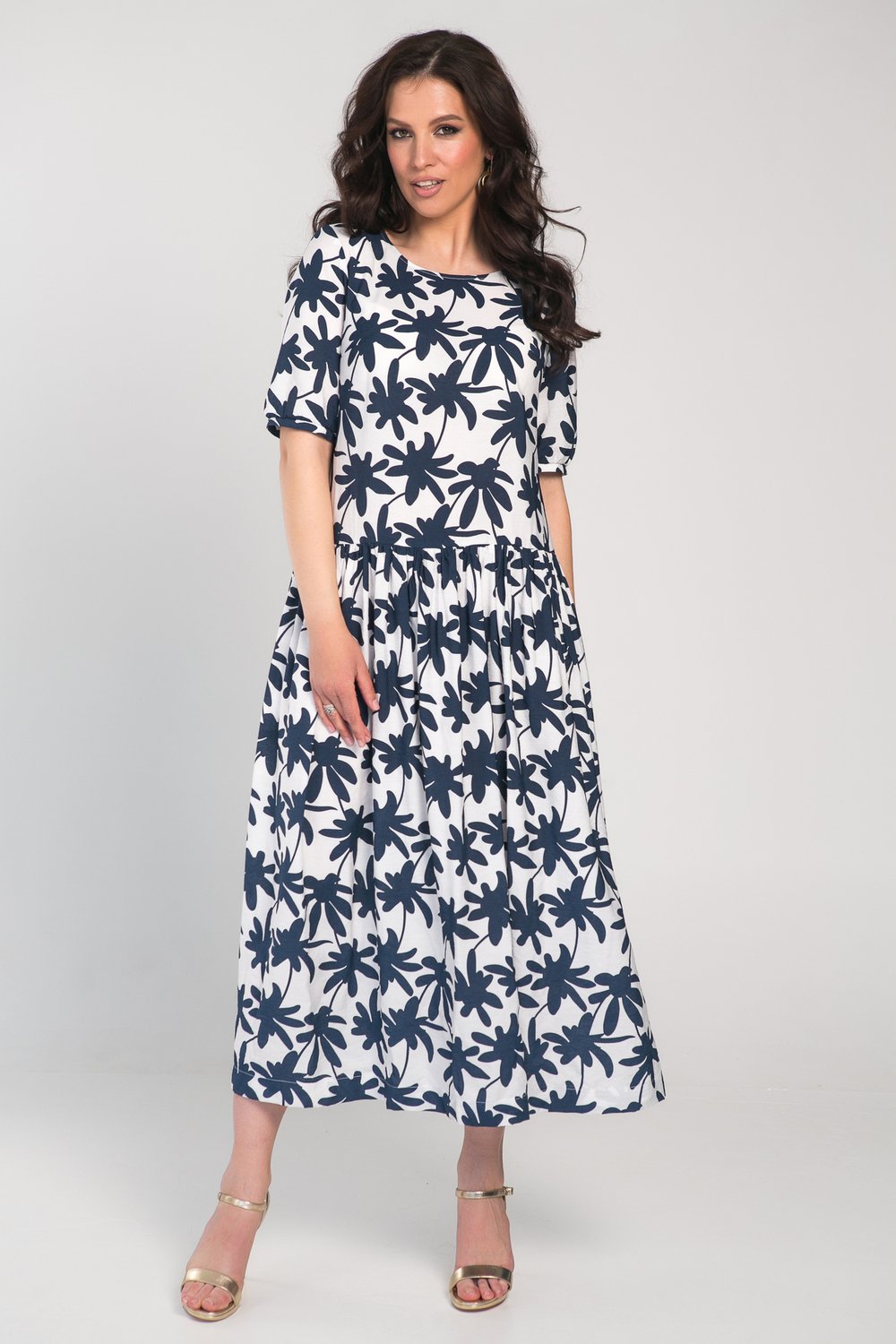 Платье прямого силуэта, отрезное выше линии бедер. Горловина круглая. Рукав втачной, короткий, по низу на притачной манжете. Нижняя часть переда и спинки по шву притачивания собрана в сборку.Характеристики: