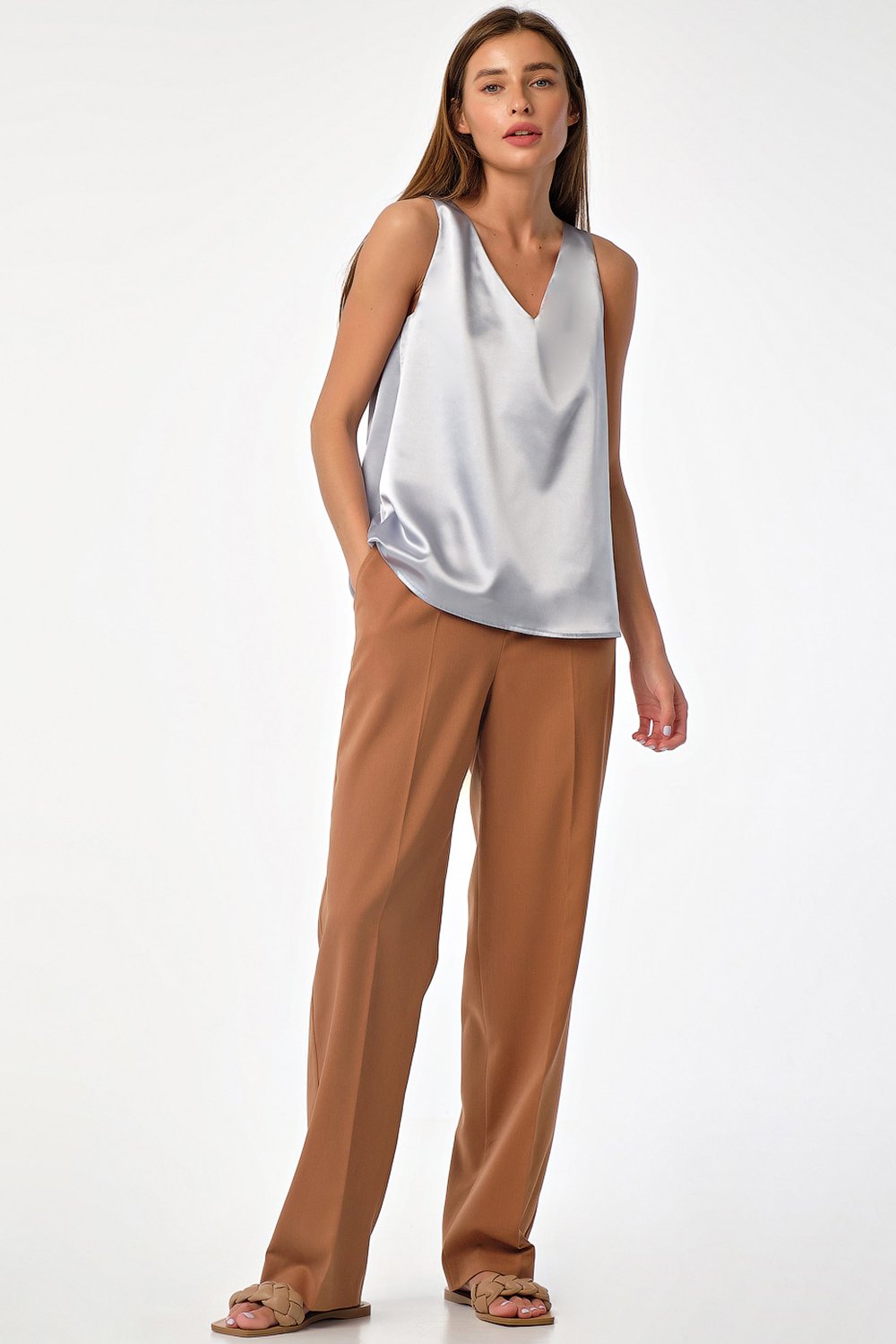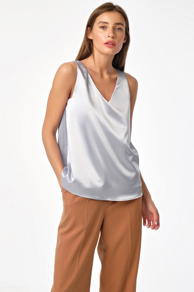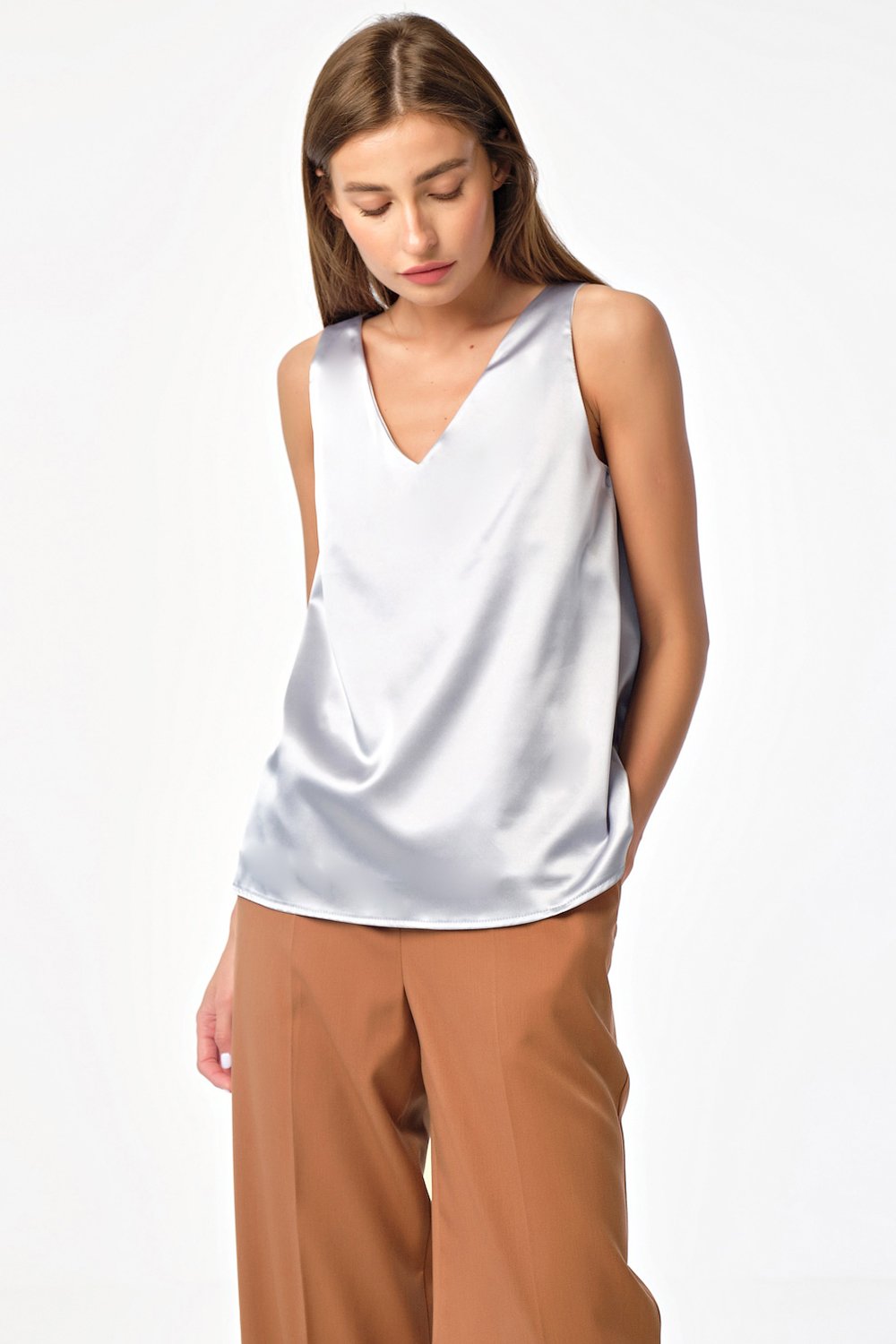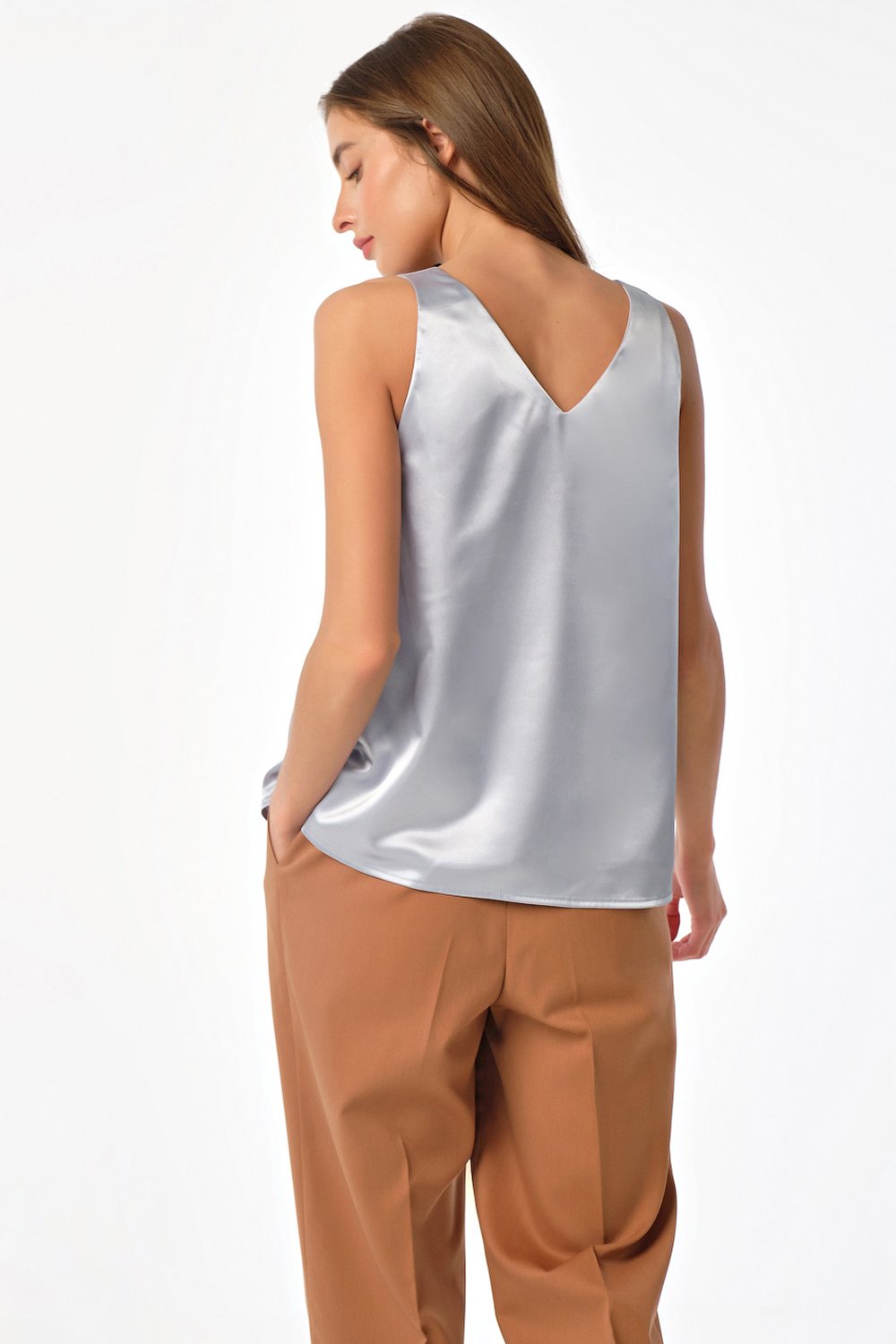 • Особенности: Топ свободного силуэта из атласной ткани на подкладке. Детали: глубокий V-образный вырез по переду и спинке.
