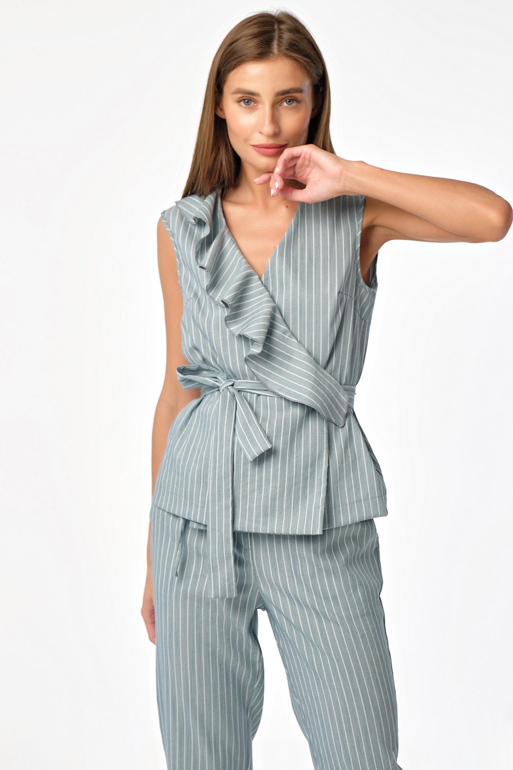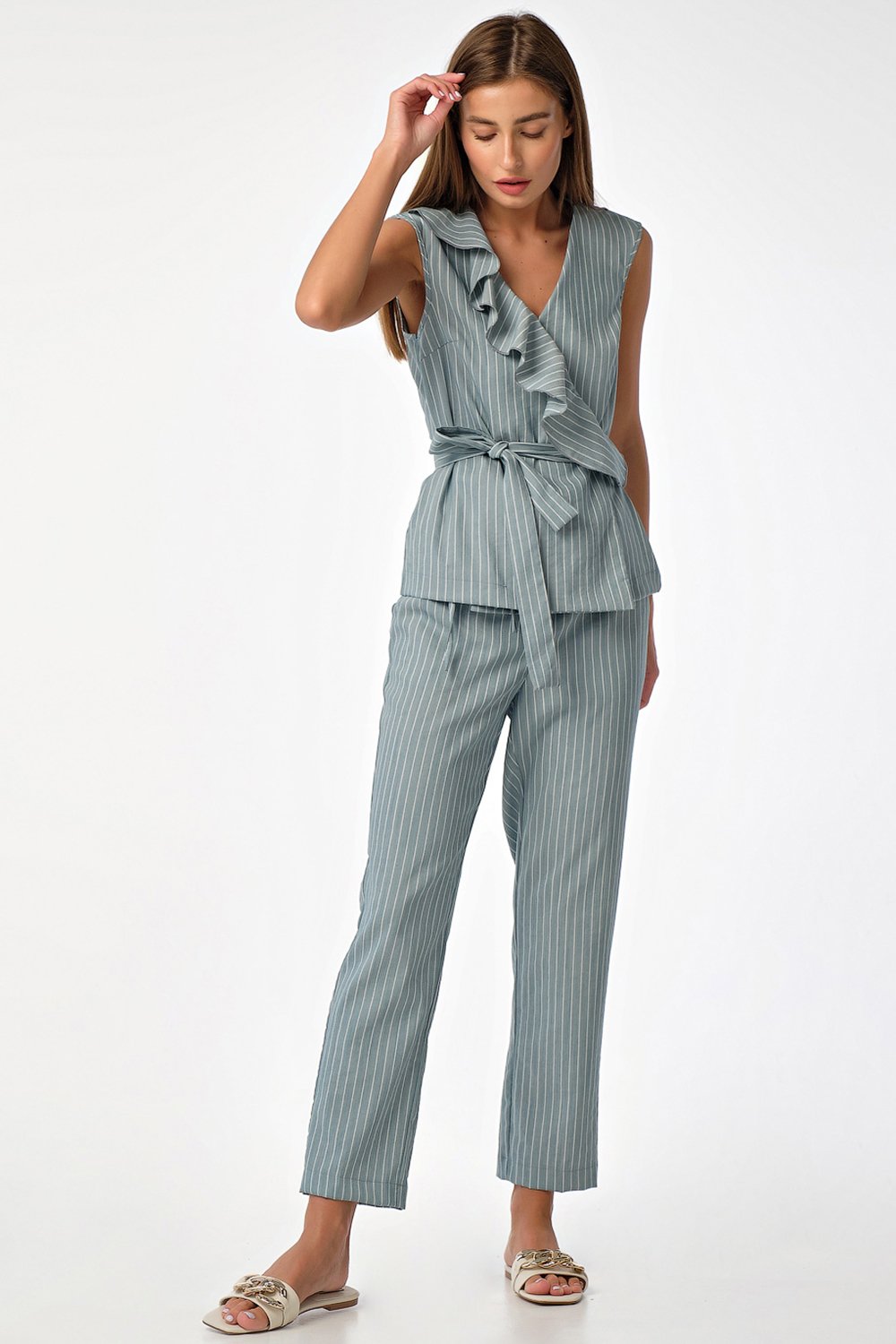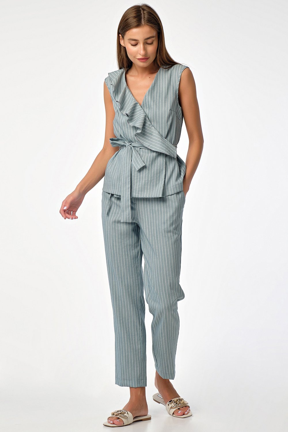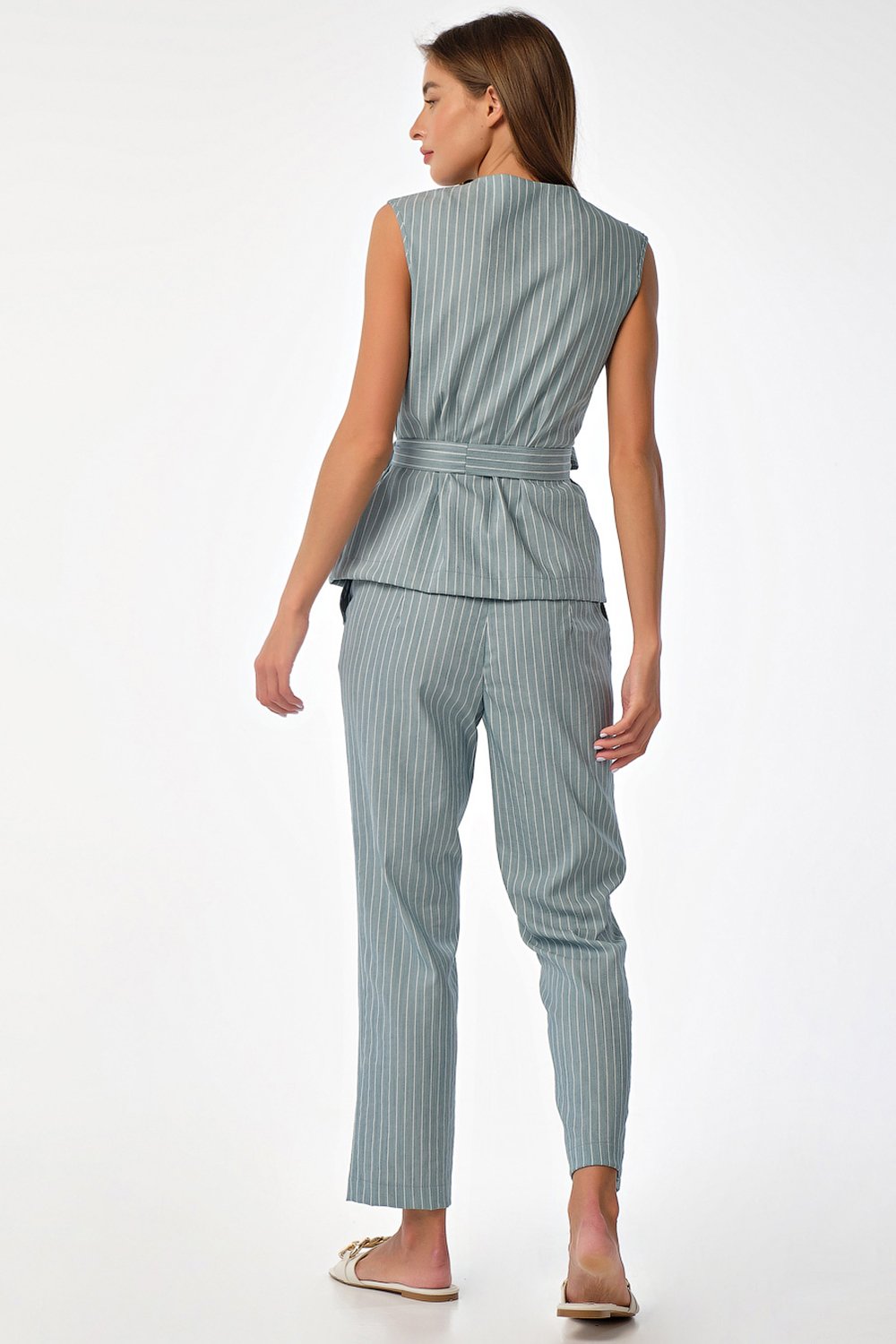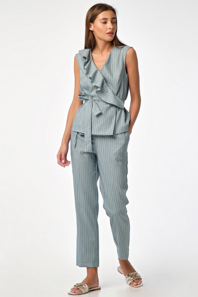 • Особенности: Летний хлопковый костюм состоит из блузы прямого силуэта и укороченных брюк прилегающего силуэта. Детали блузы: на правой полочке волан застежка на потайную кнопку длинный пояс. Детали брюк: брючные карманы притачной пояс с застежкой на две пуговицы.