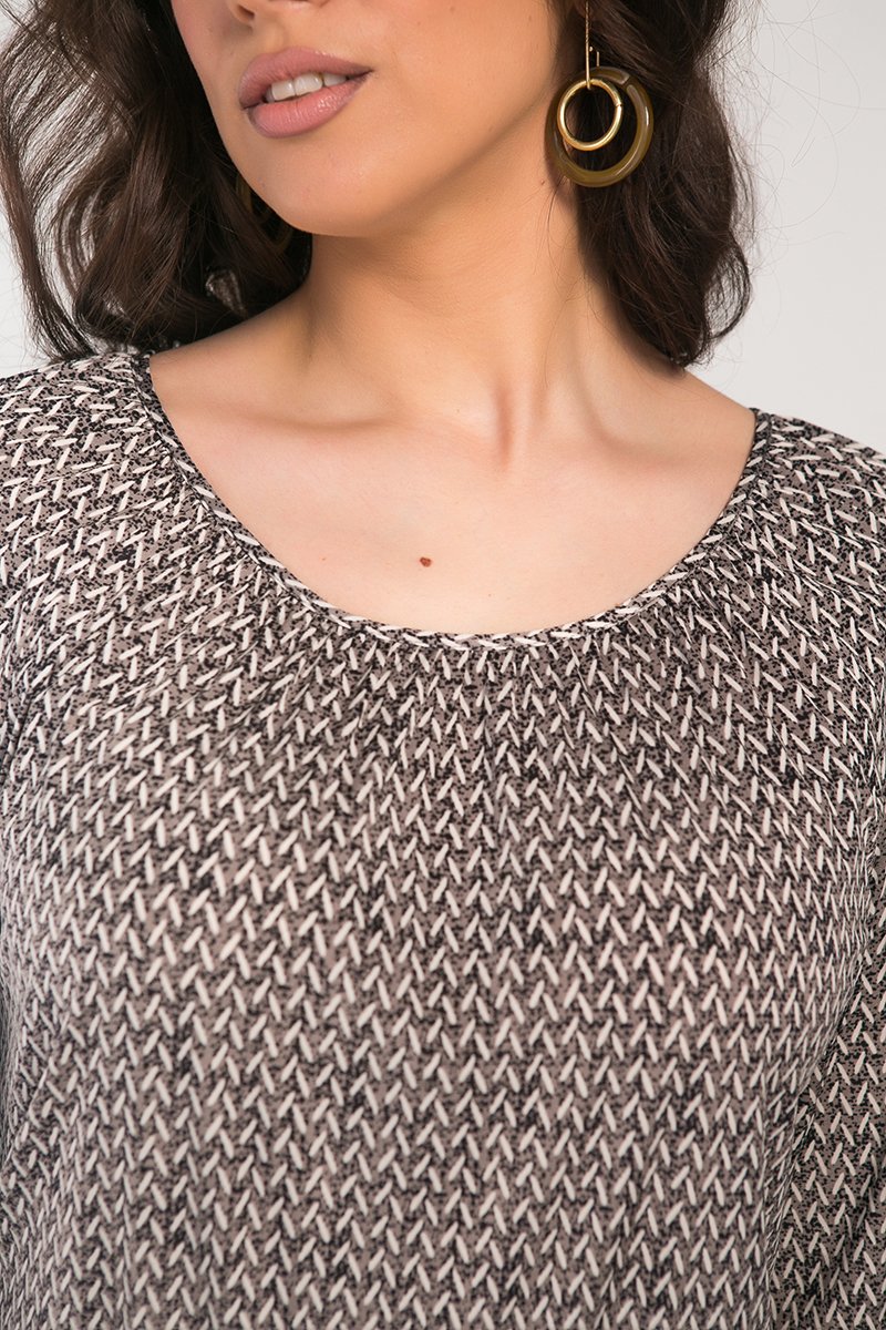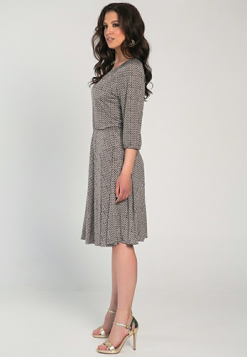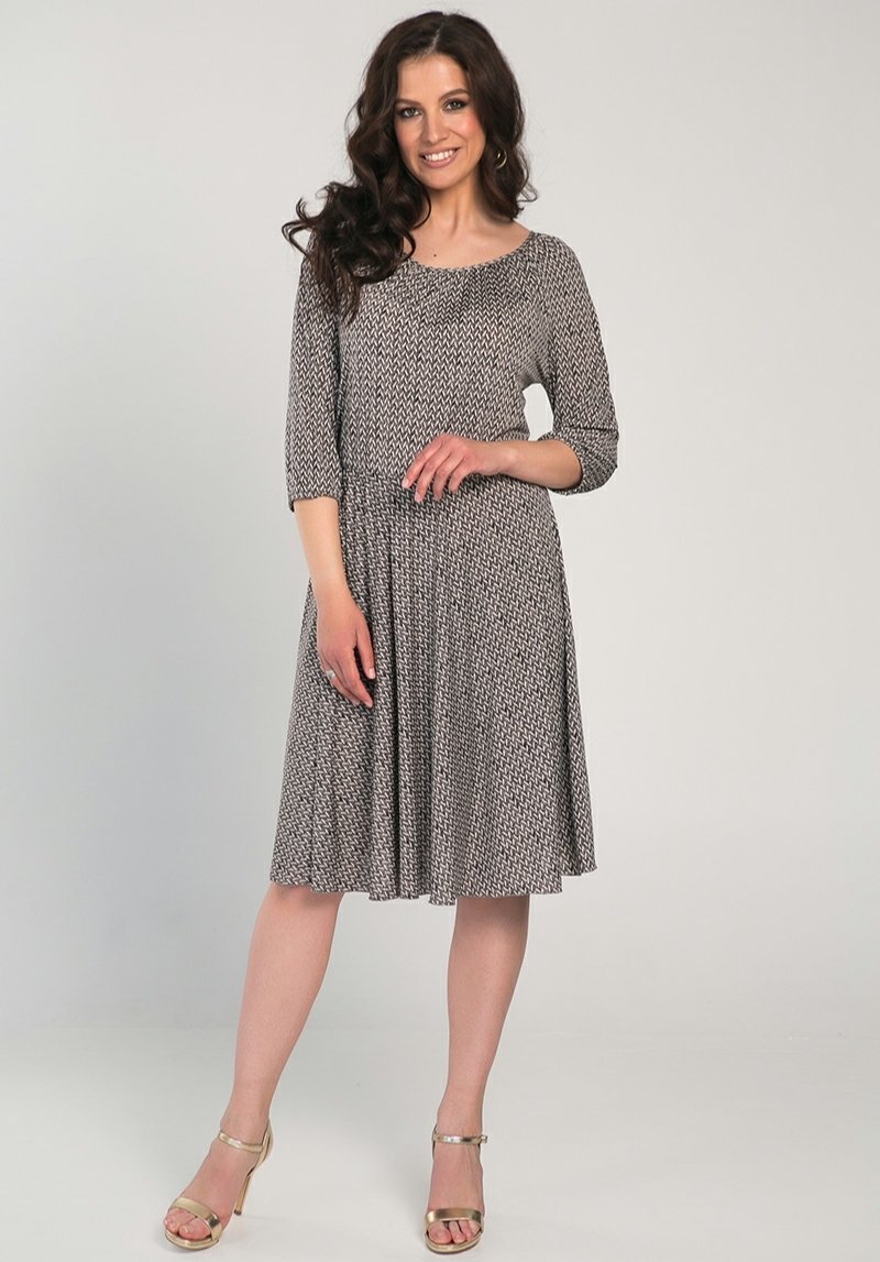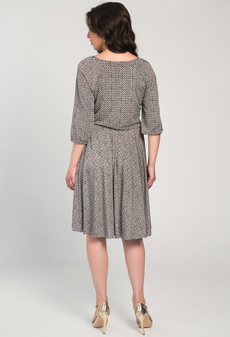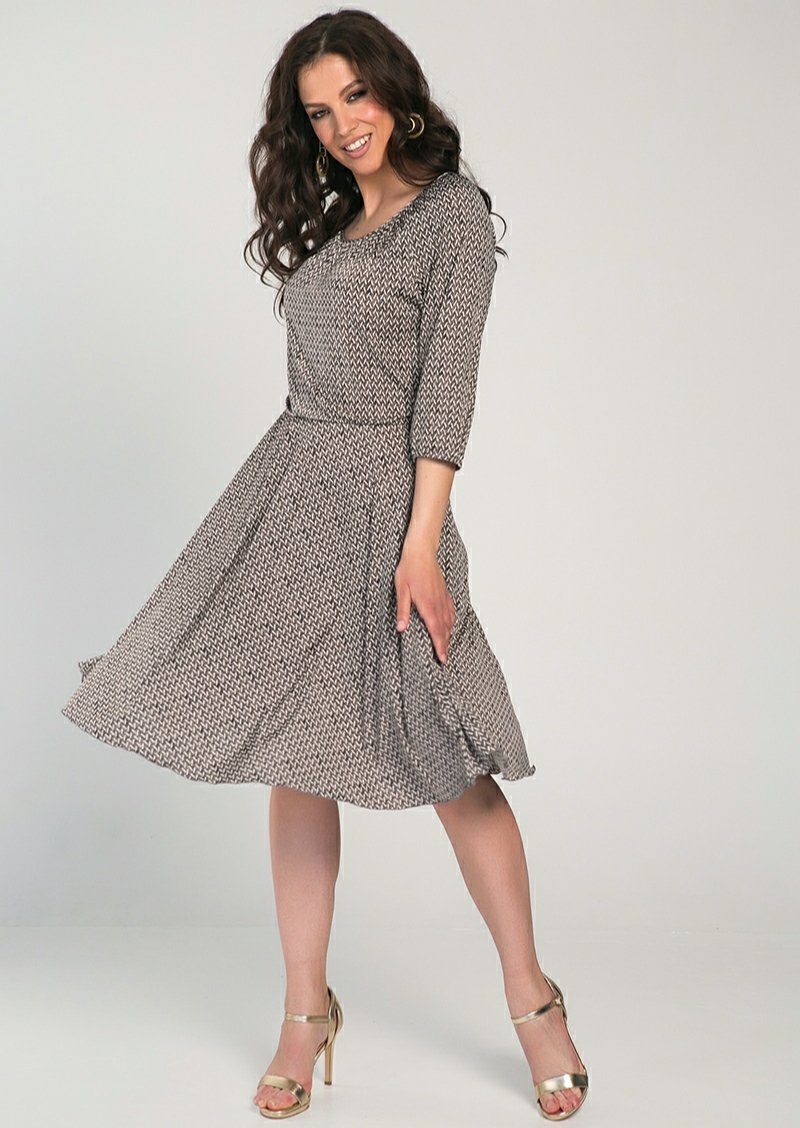 Платье отрезное по линии талии. Рукав реглан,3/4. Горловина переда и спинки собрана в сборку. Юбка полусолнце. По шву талии и по низу рукава - эластичная тесьма.
