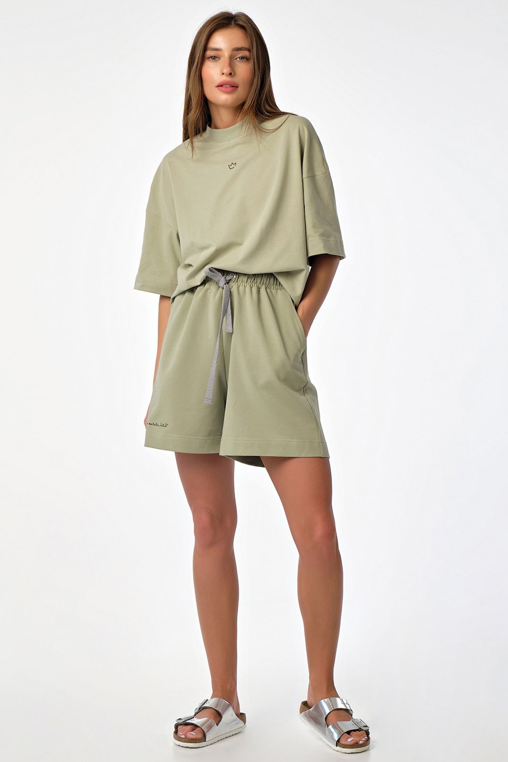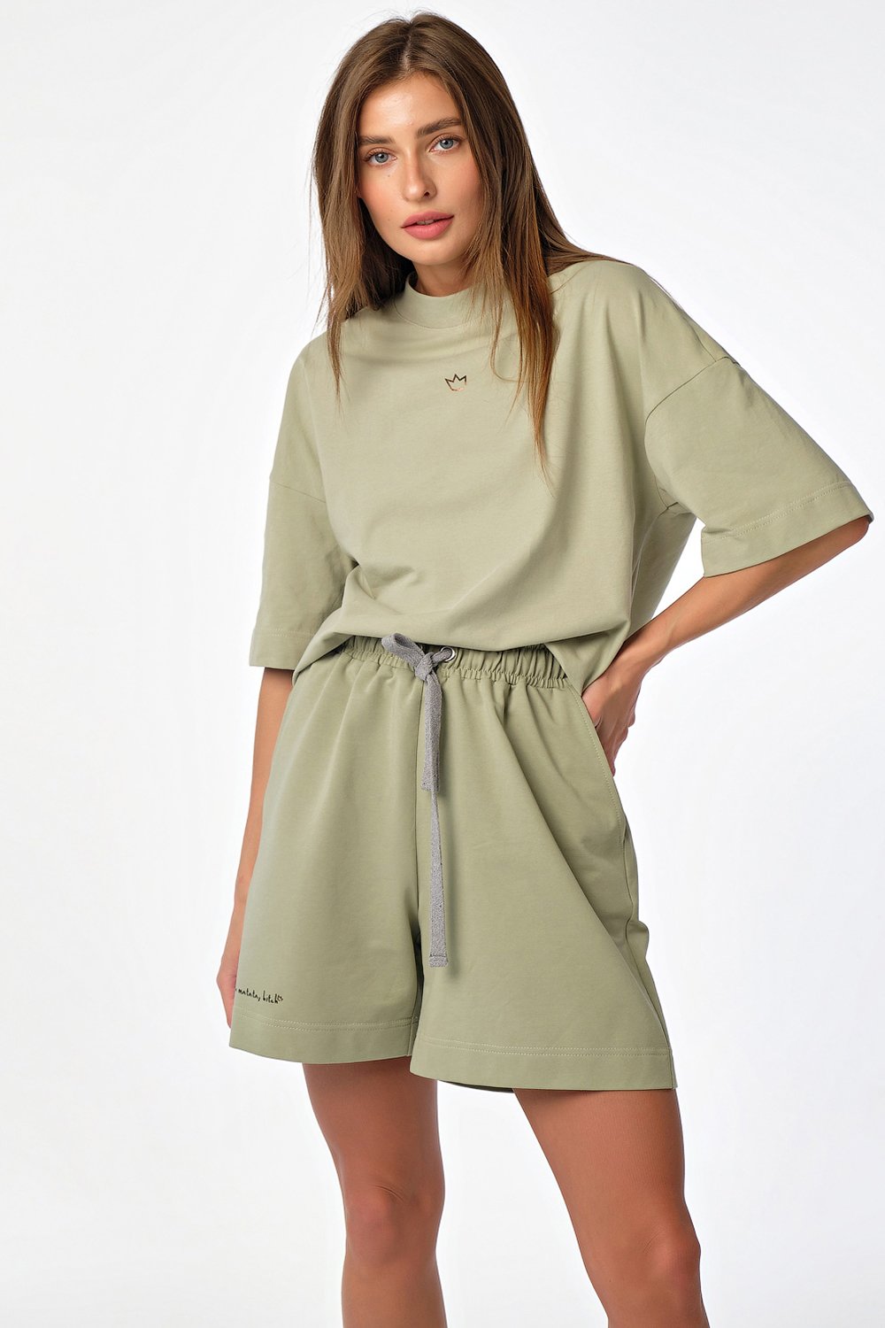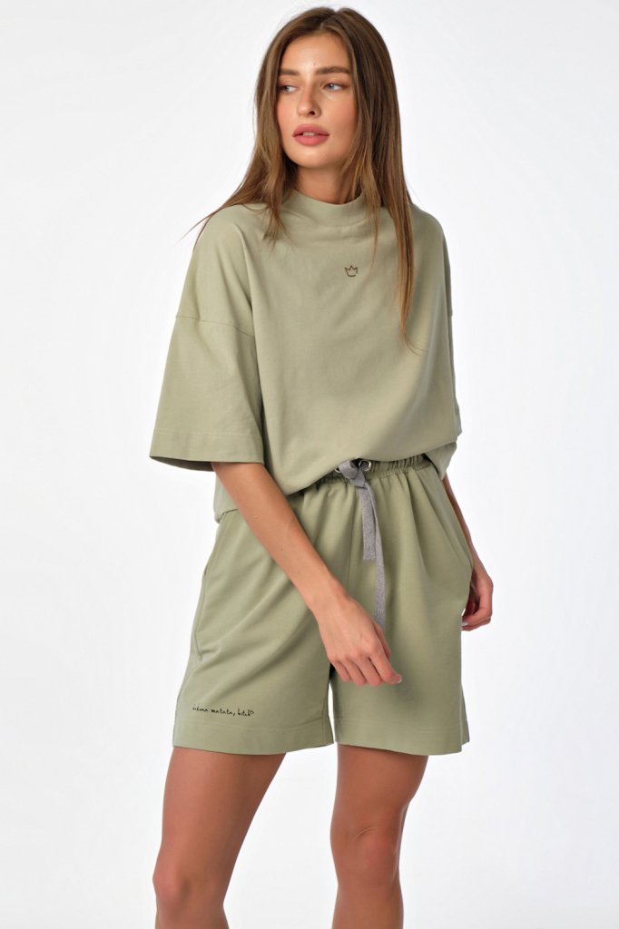 • Особенности: Костюм из футболки и шорт свободного силуэта. Детали футболки: футболка из кулирки силуэта "оверсайз" спущенная линия плеча втачной широкий рукав горловина обработана широкой бейкой из рибаны по центру переда принт. Детали шорт: шорты свободного силуэта из тонкого футера притачной пояс с резиной кулиска с люверсами и декоративным шнуром боковые карманы на передней правой половинке принт.