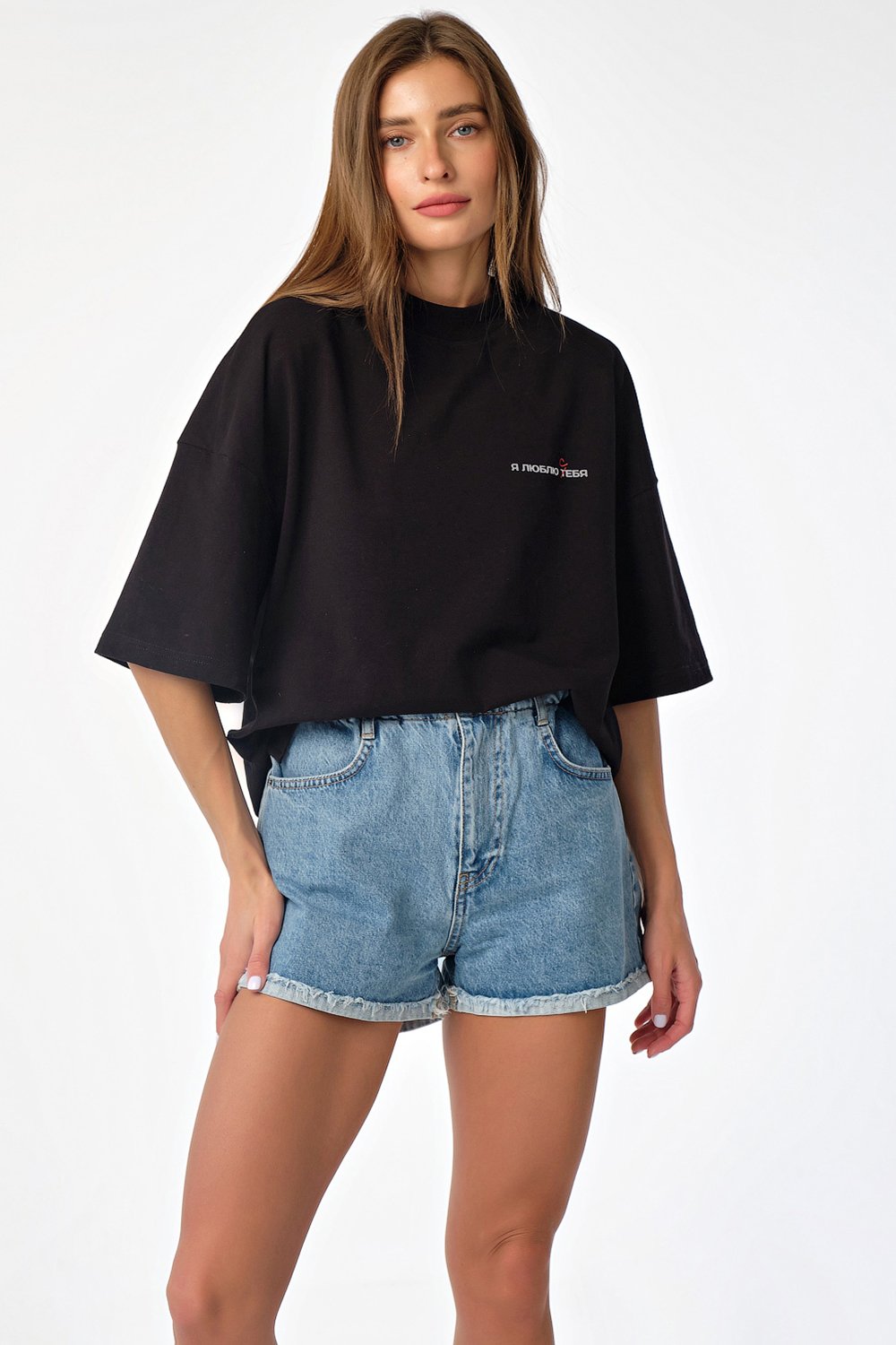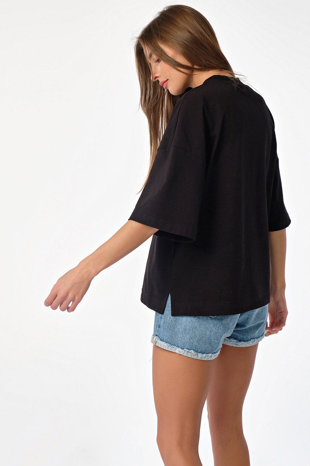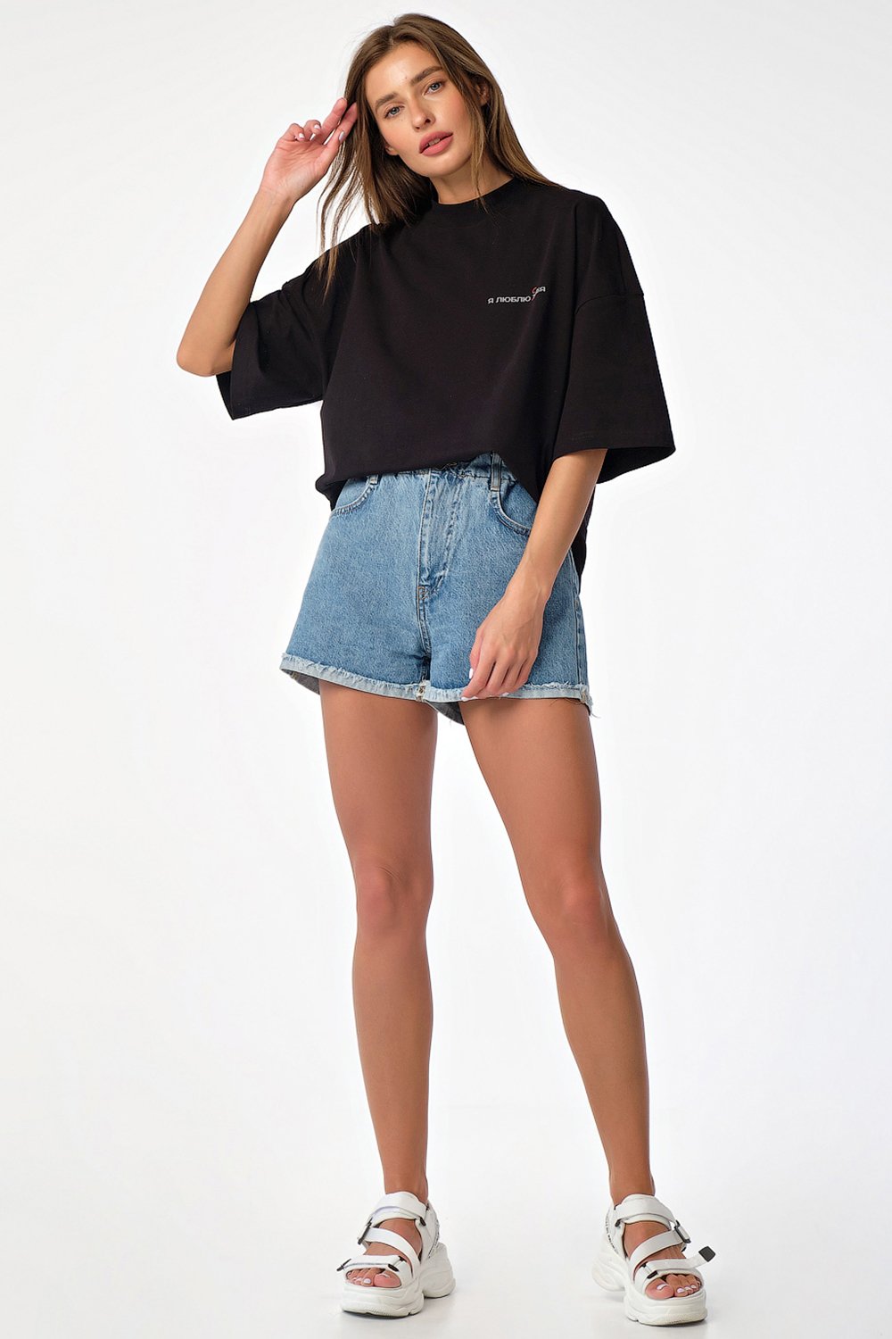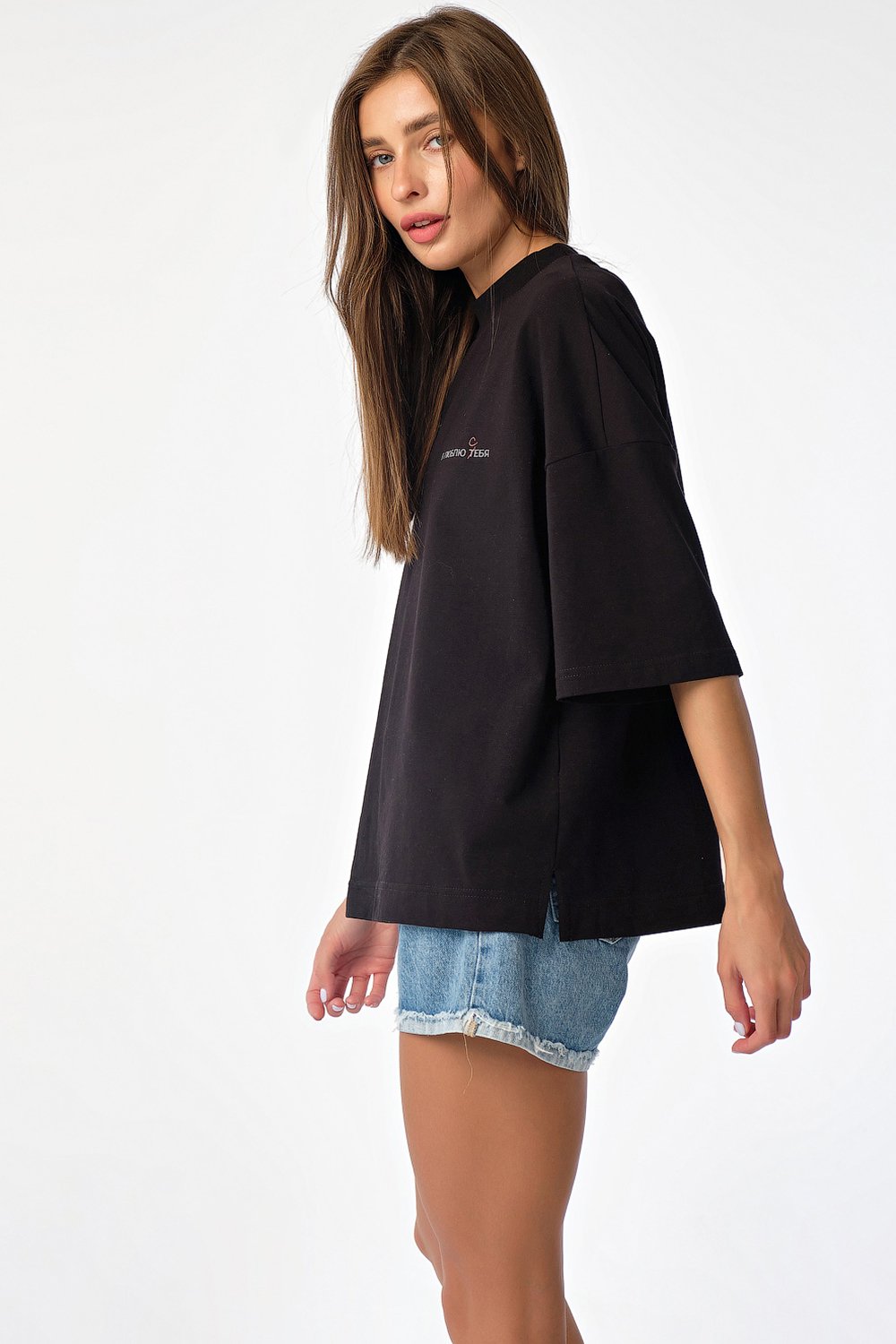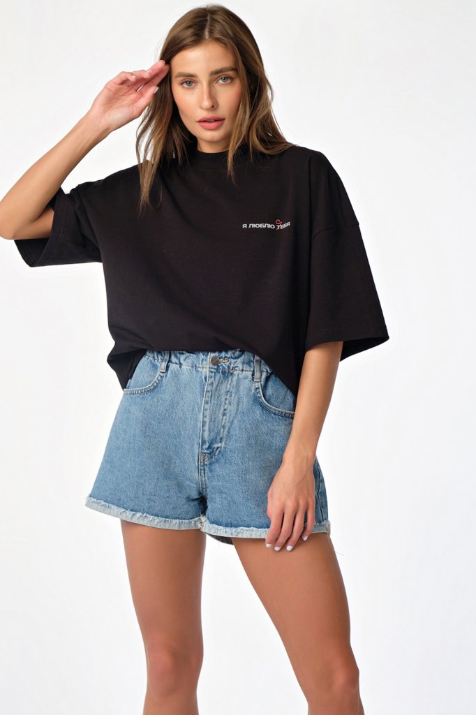 • Особенности: Футболка свободного силуэта oversize. Детали: спущенное плечо широкий рукав с принтом горловина обработана широкой бейкой-стойкой принт по переду разрезы в боковых швах.