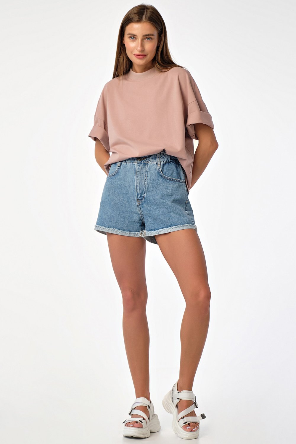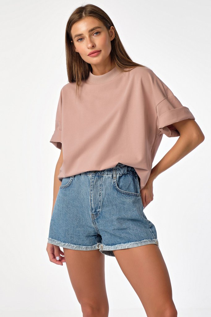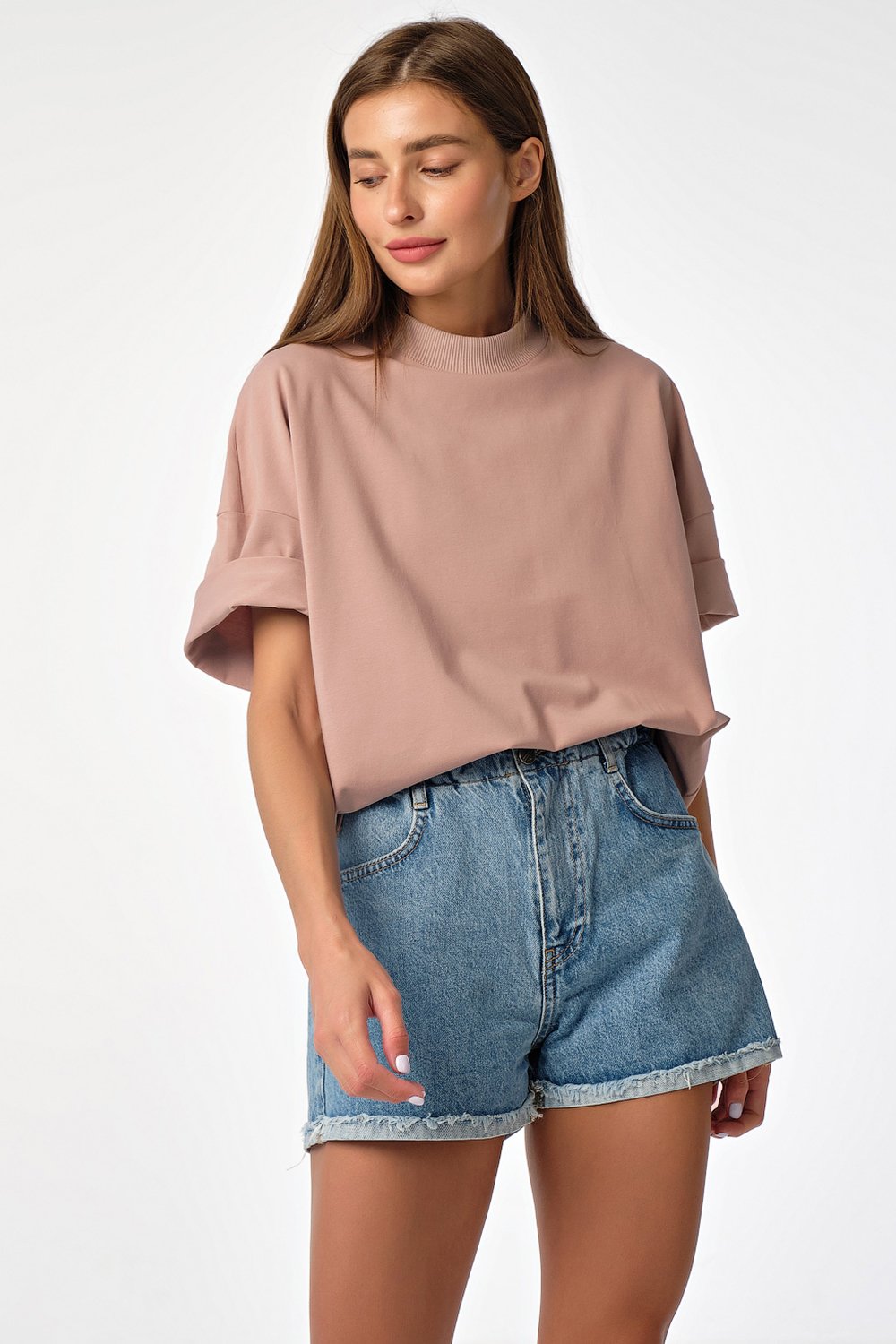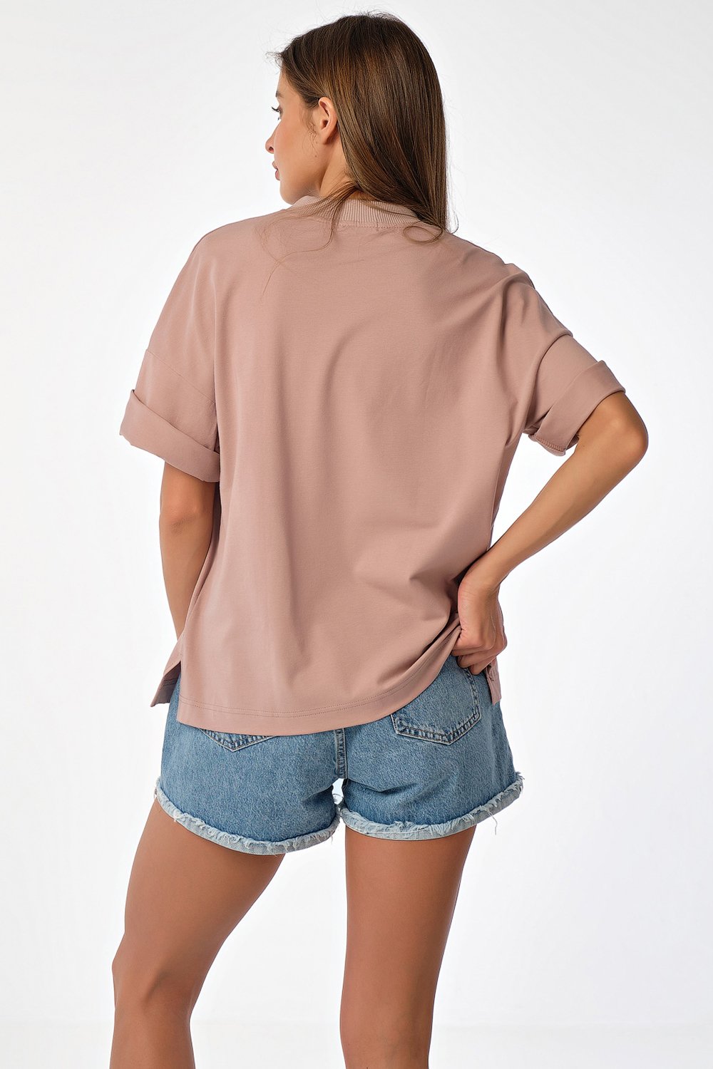 • Особенности: Футболка свободного силуэта oversize. Детали: спущенное плечо широкий рукав с принтом горловина обработана широкой бейкой-стойкой принт по переду разрезы в боковых швах.