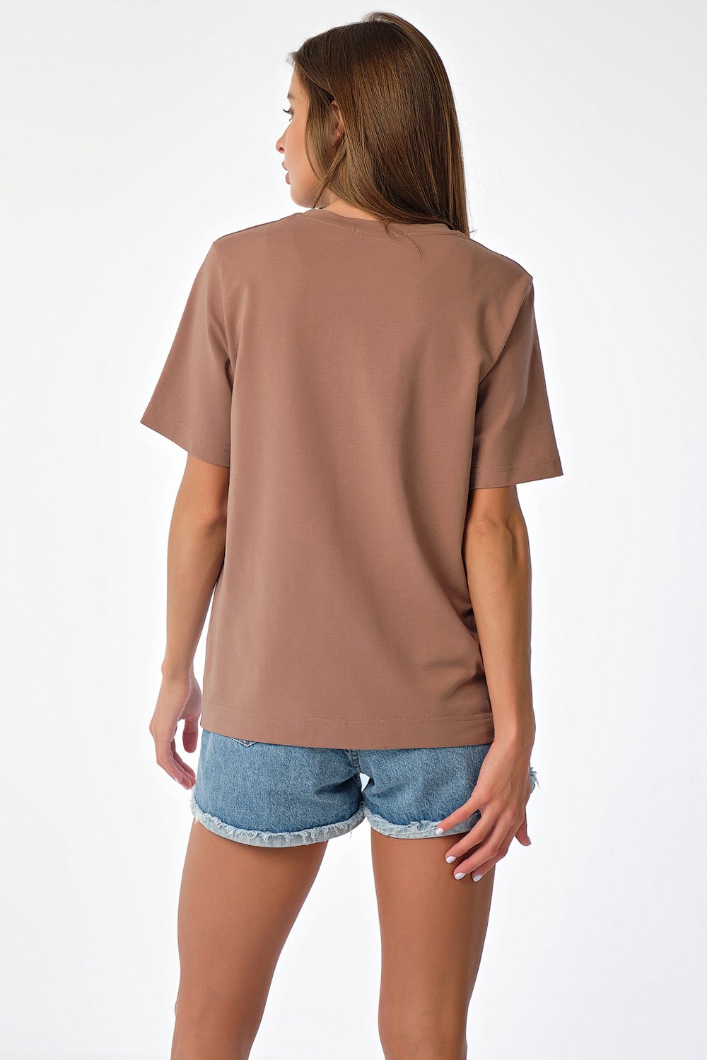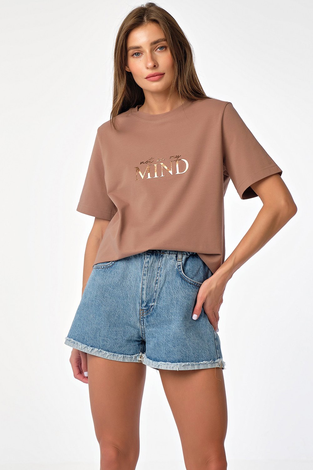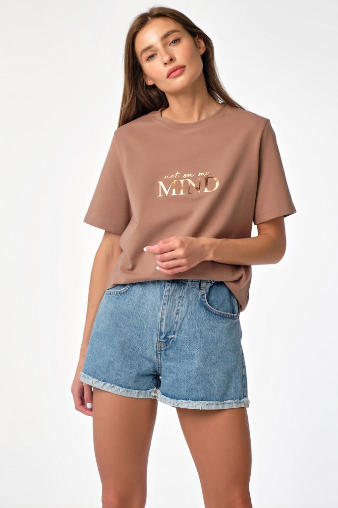 • Особенности: Футболка прямого силуэта среднего объема из трикотажа. Детали: горловина обработана бейкой ПО переду нанесен принт.