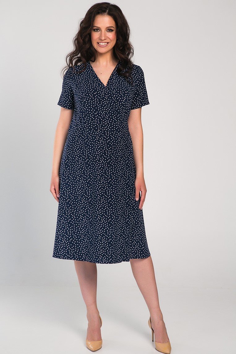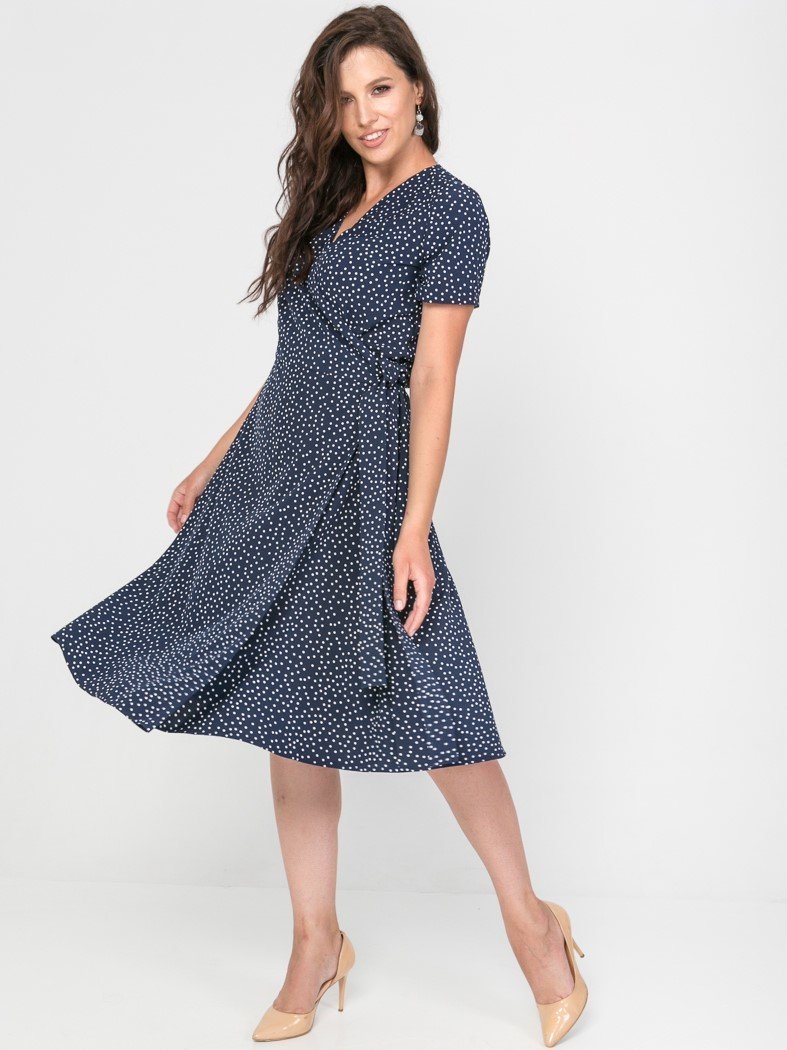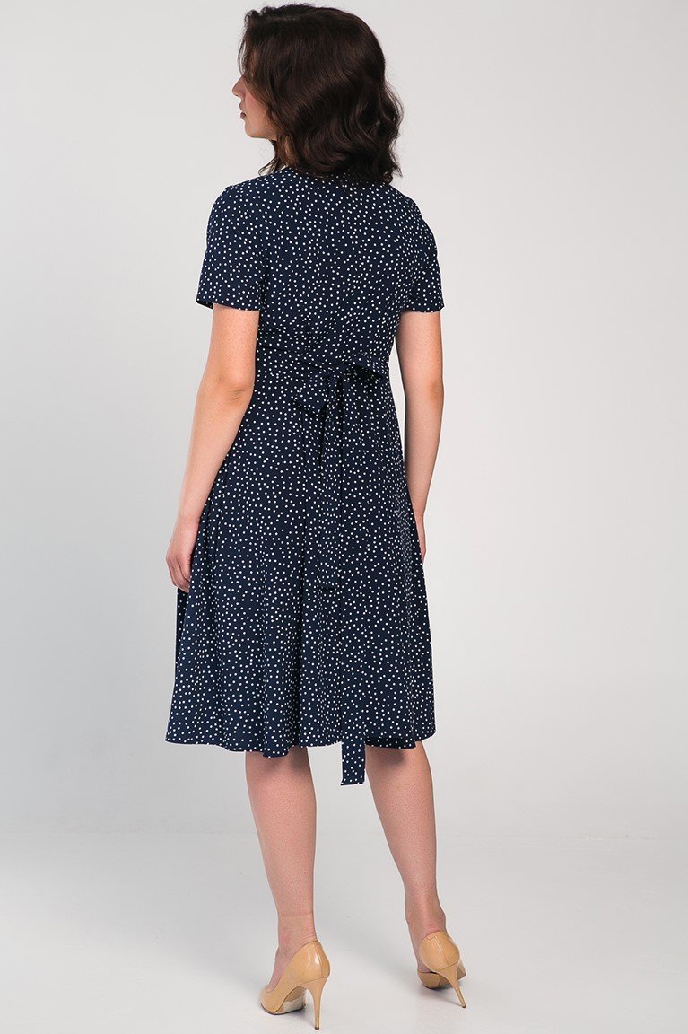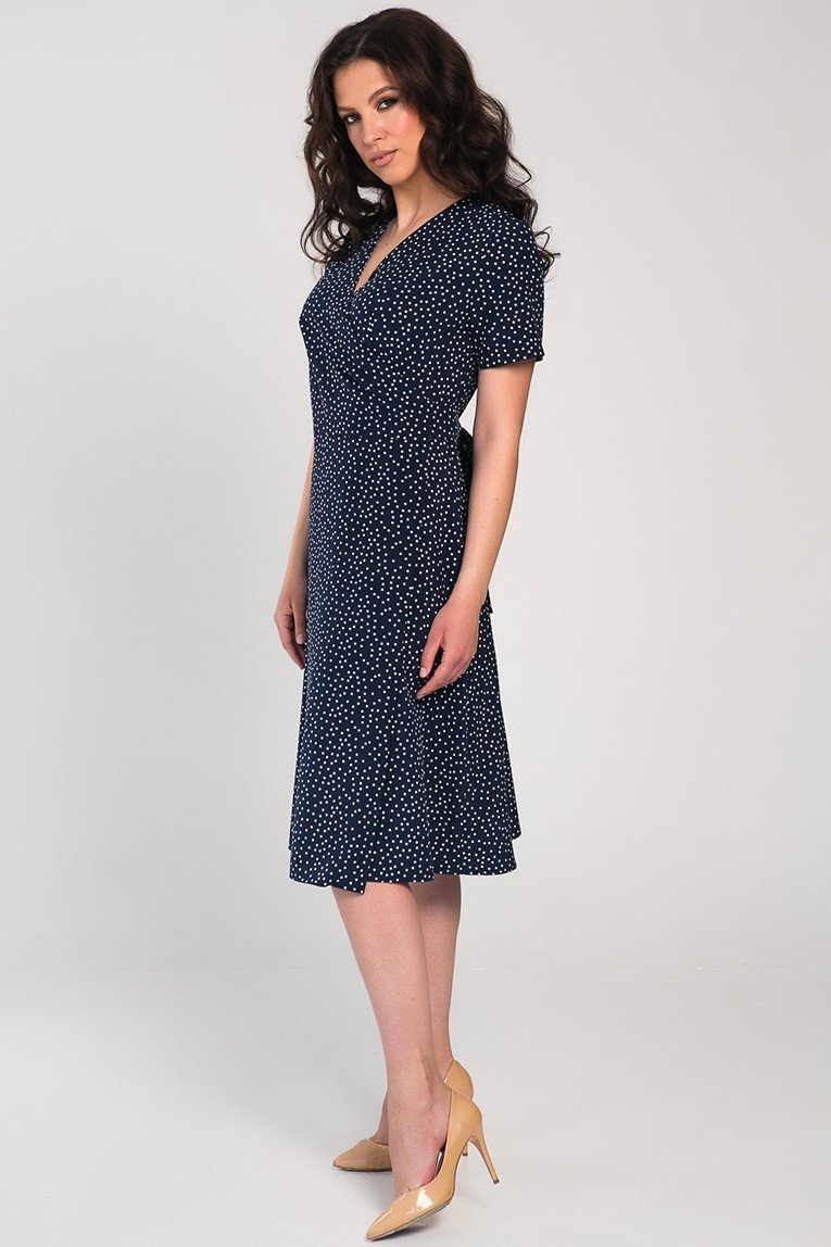 Платье женское, полуприлегающего силуэта, отрезное по линии талии. Нижняя часть переда и спинки расклешенная. Перед с глубоким запахом, с завязывающимися полупоясами. Рукав втачной, короткий.