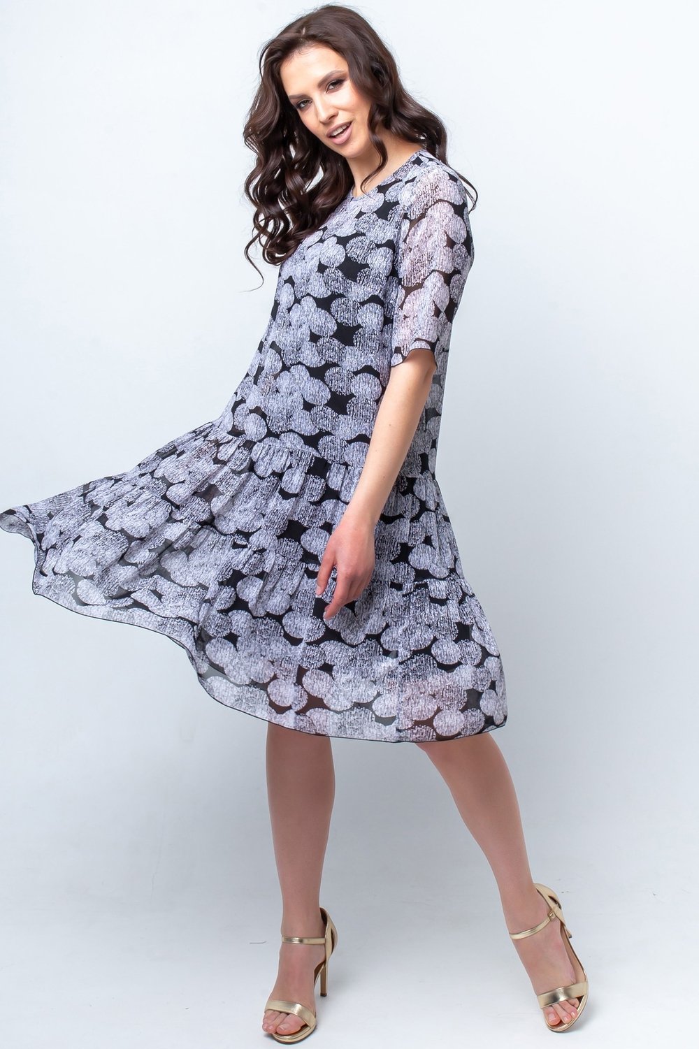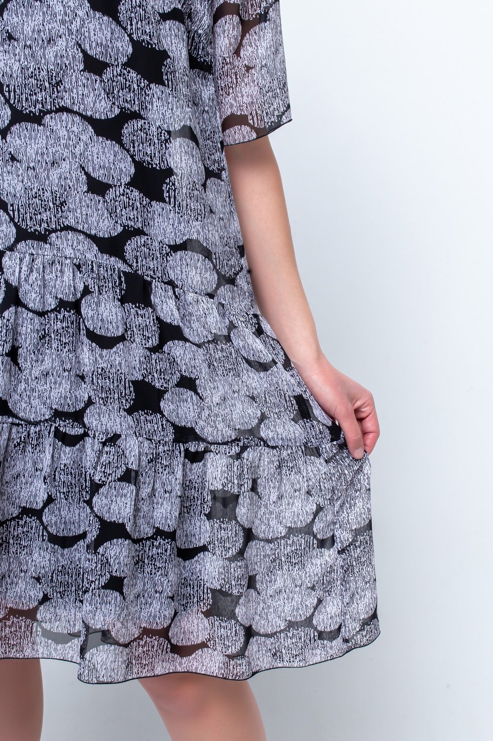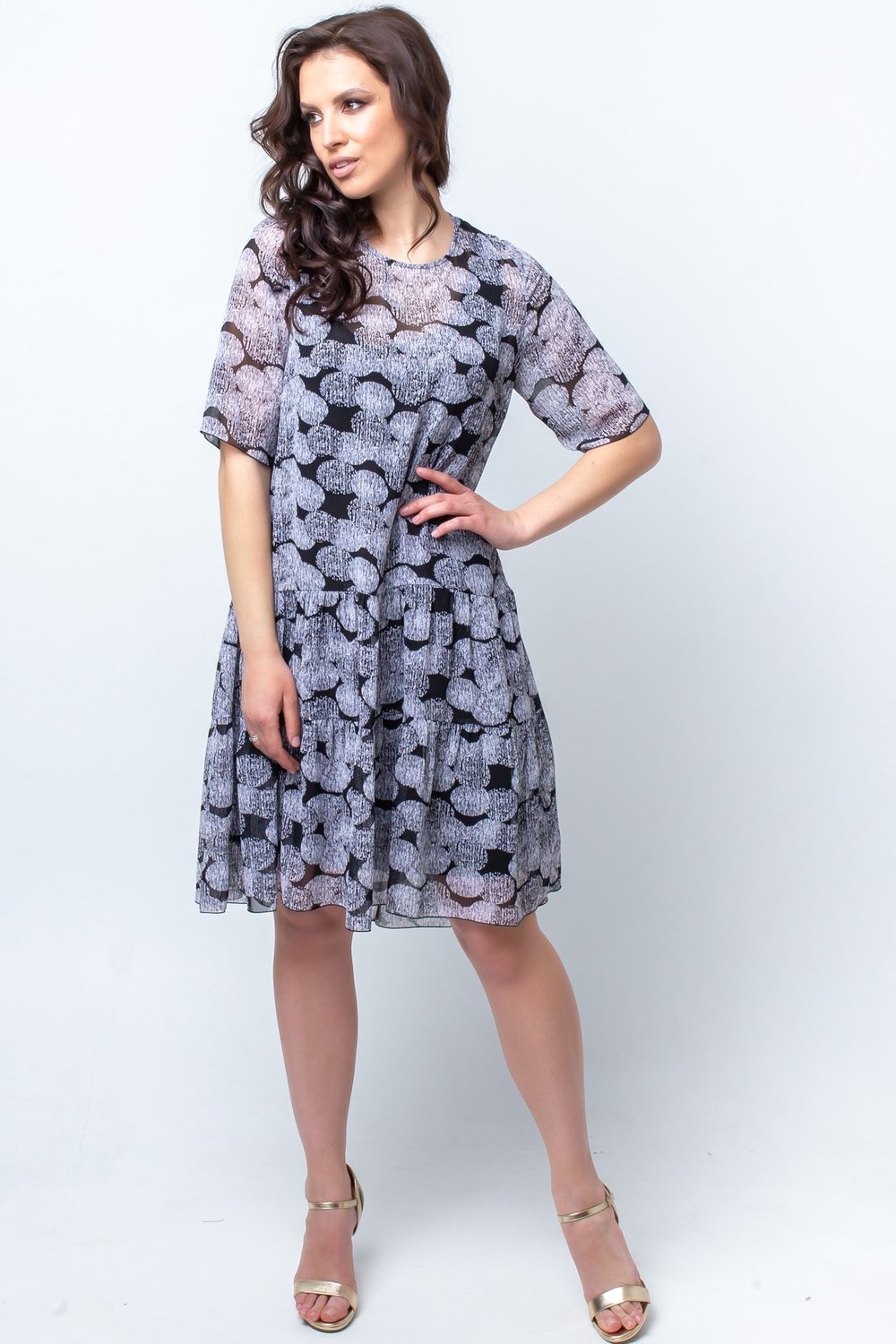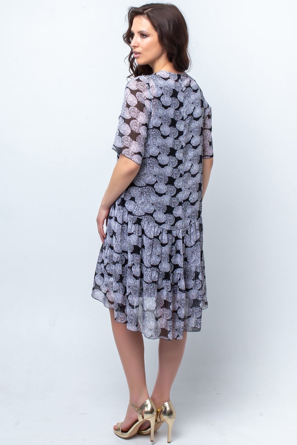 Платье трапециевидного силуэта, отрезное по линии бедер. Горловина круглая, рукав втачной, короткий. Спинка с застежкой в среднем шве на короткую потайную тесьму молнию. Нижняя часть переда и спинки с воланами в два ряда, собранными в сборку. К платью прилагается съемный чехол из трикотажного полотна.Характеристики: