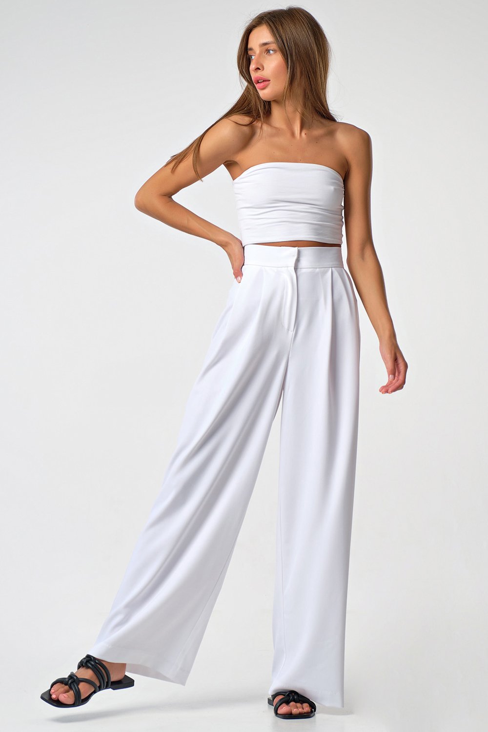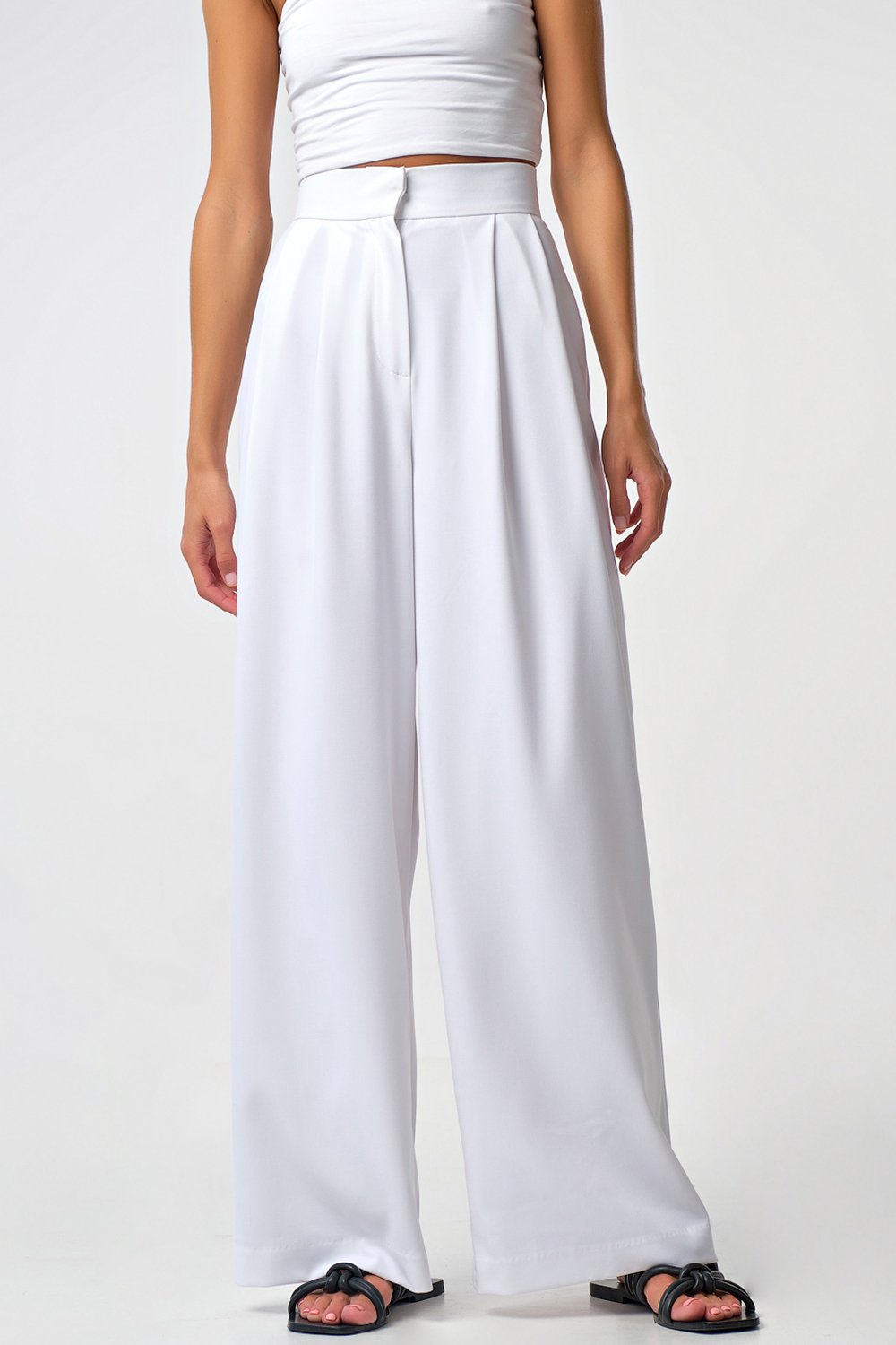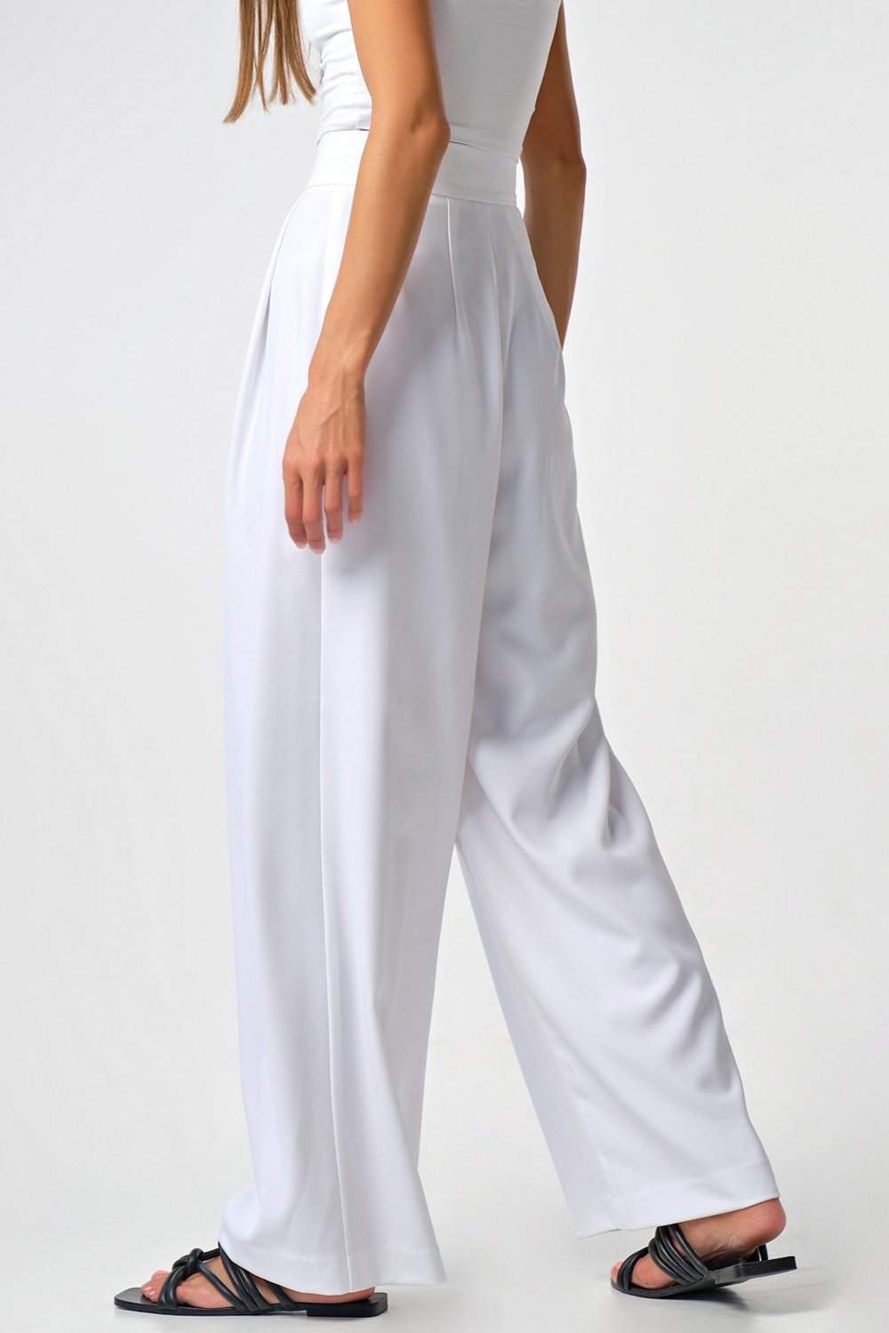 • Особенности: Брюки палаццо из костюмной ткани. Детали: притачной пояс с застежкой на крючок две глубокие складки по переду застежка на молнию.