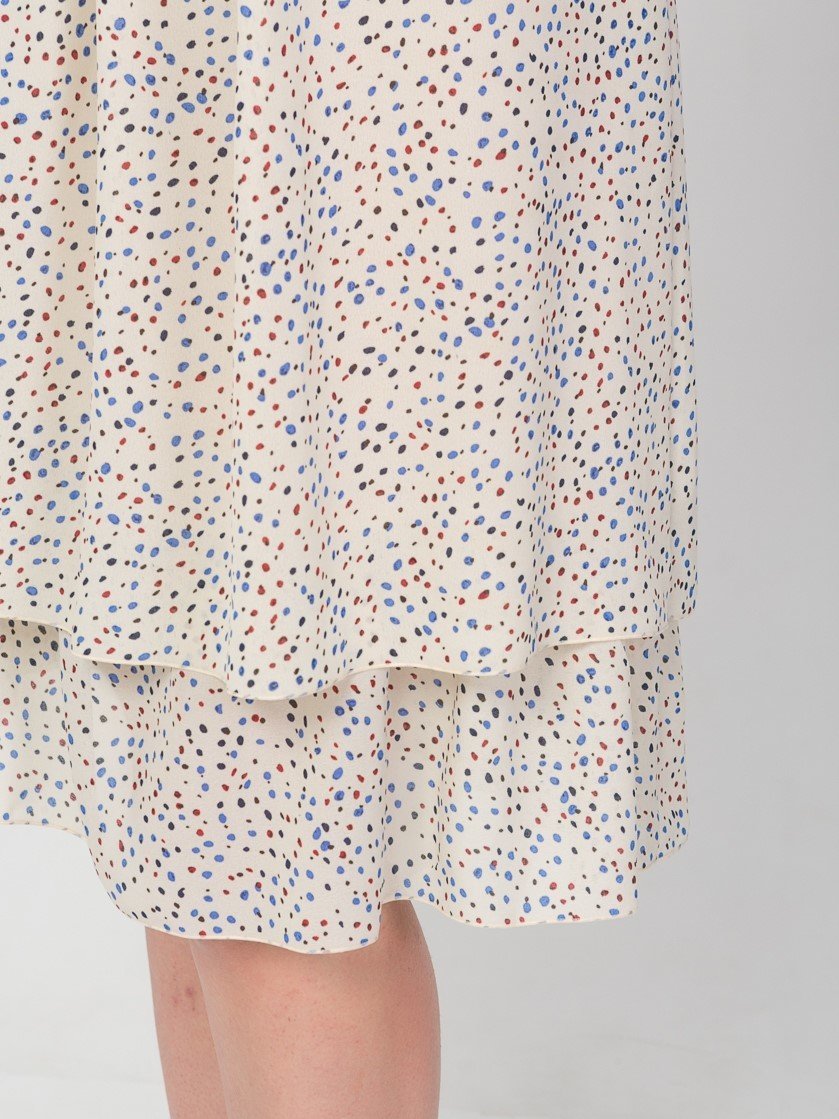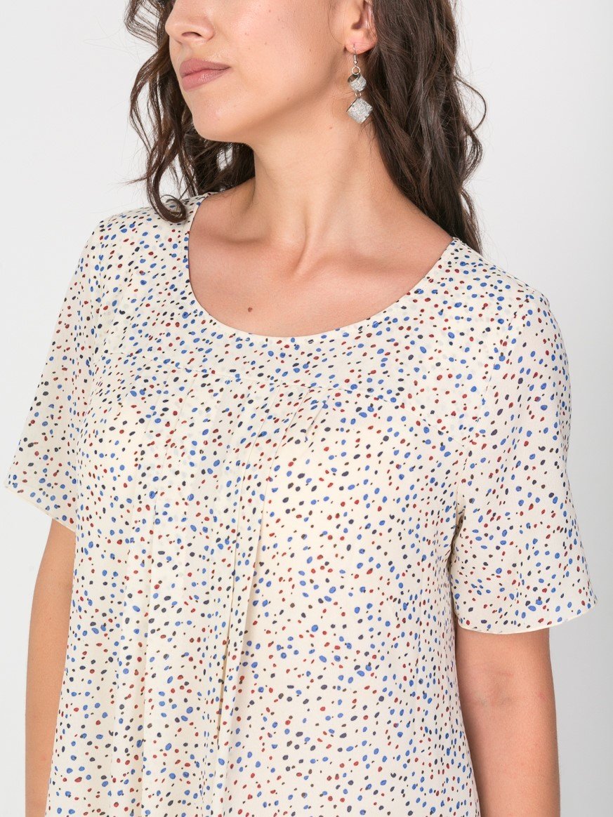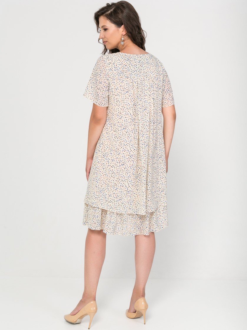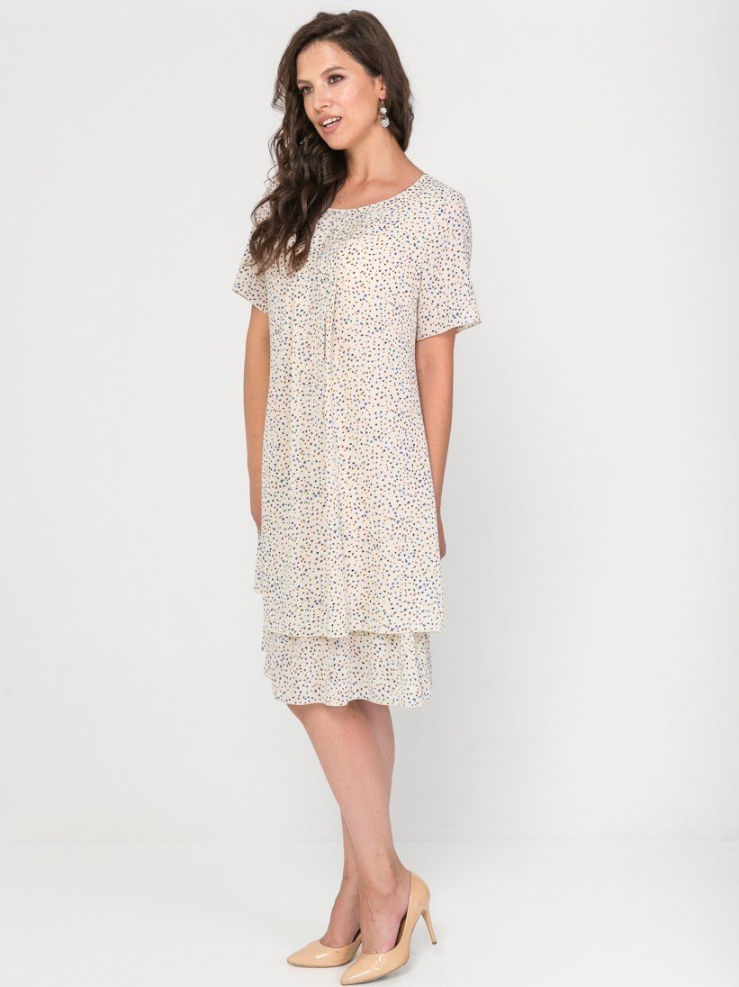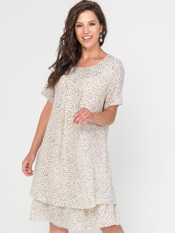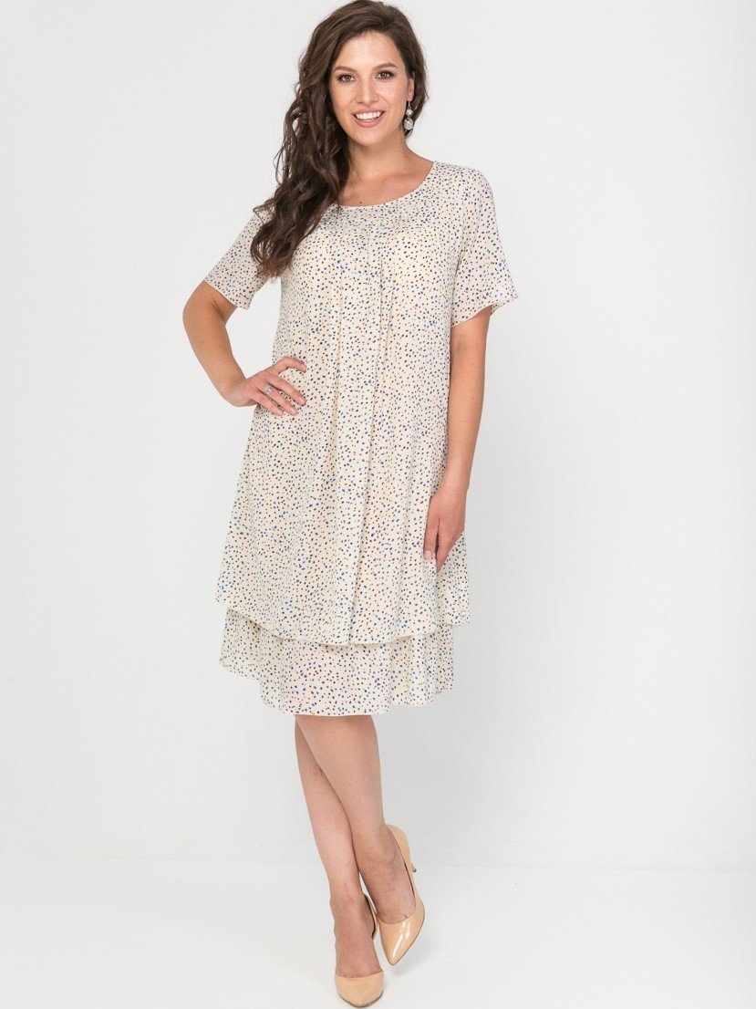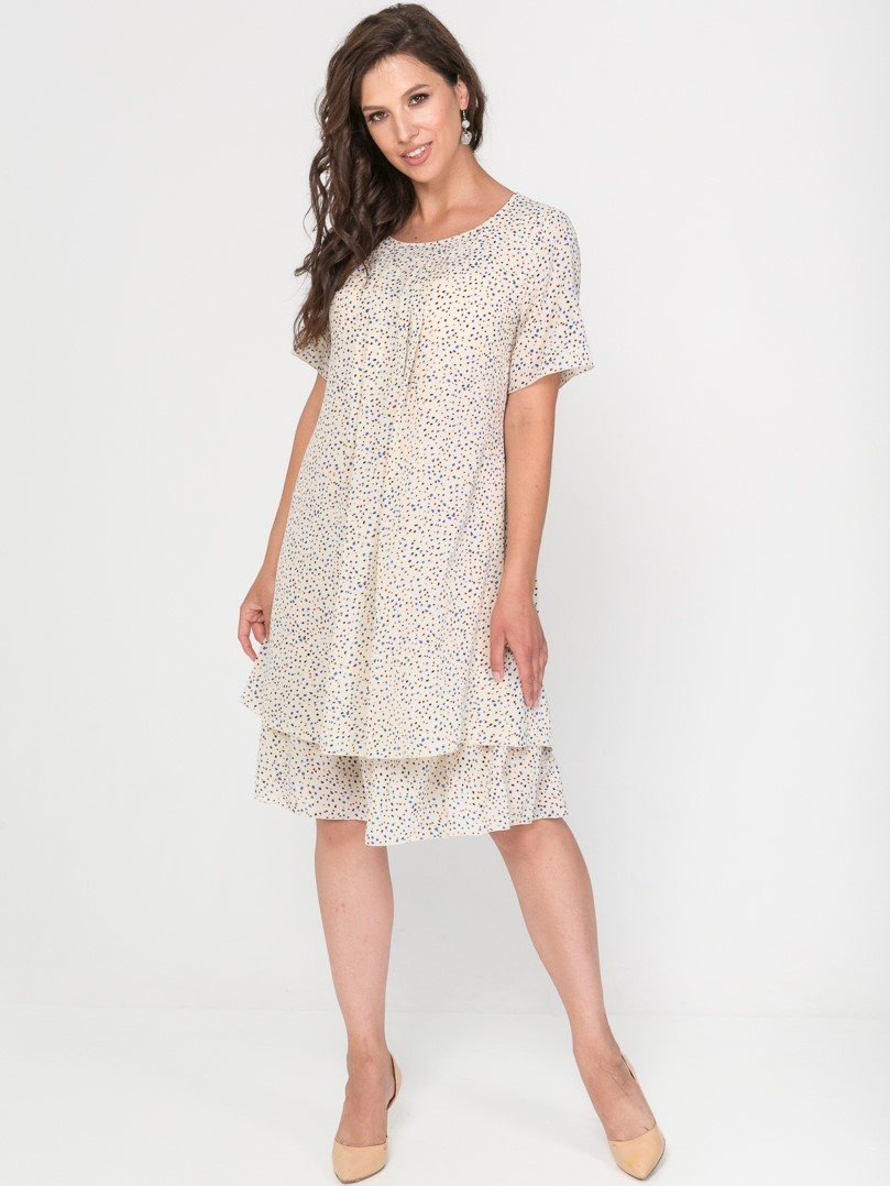 Платье женское трапециевидного силуэта, с кокеткой по переду и спинке. Горловина круглая, рукав втачной, короткий. Нижняя часть переда и спинки с застроченными складками, на подкладке. По низу подкладки - притачная оборка из основной ткани.Характеристики: