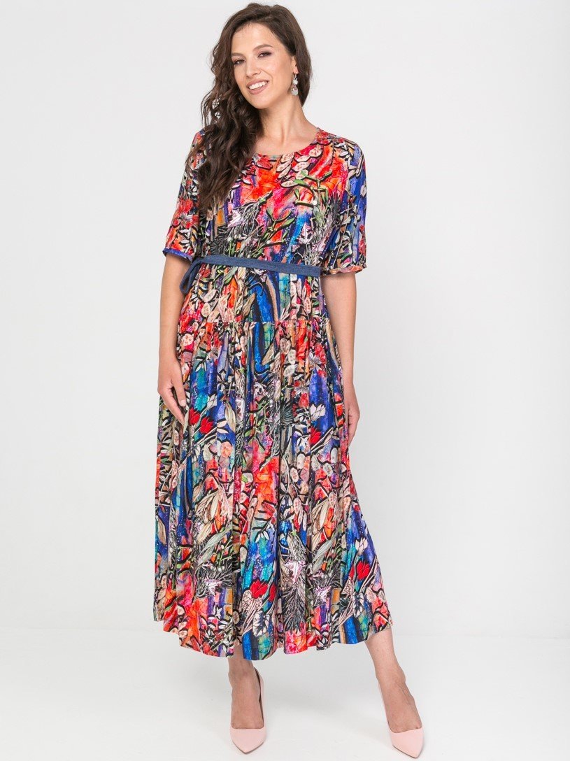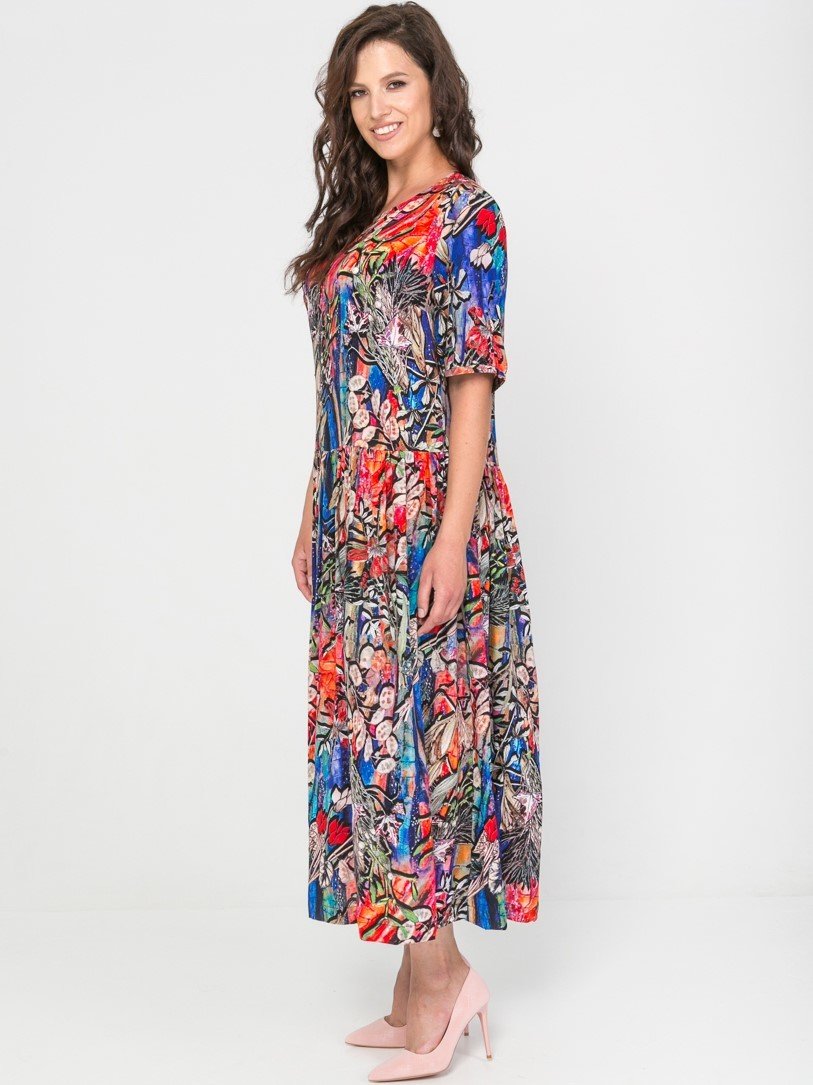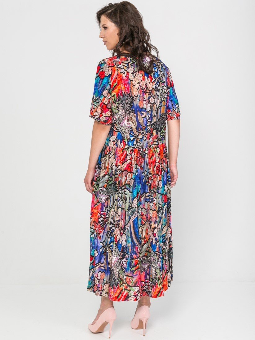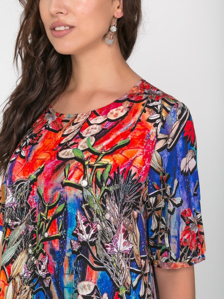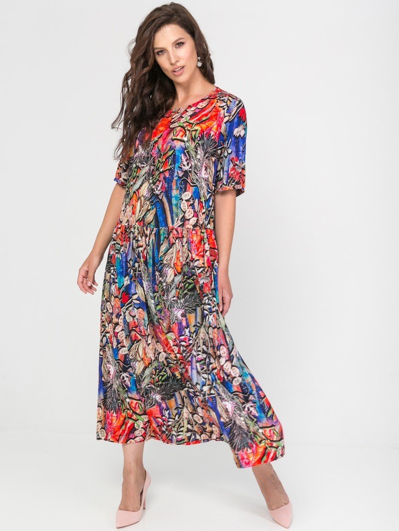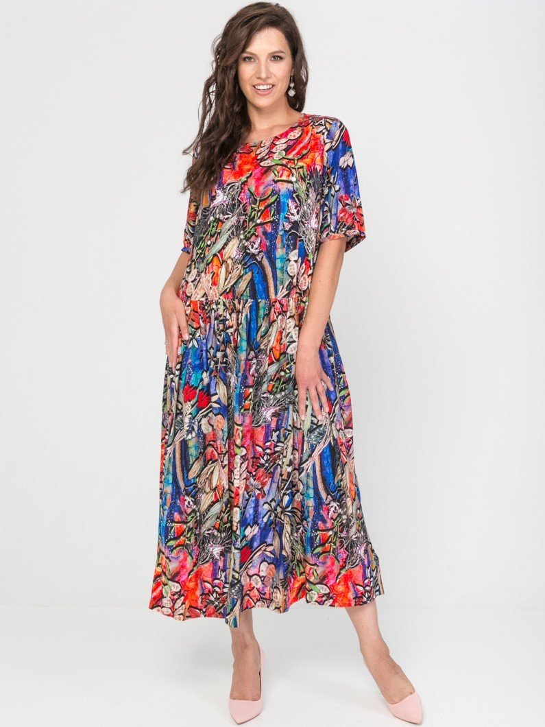 Платье женское прямого силуэта, отрезное выше линии бедер. Горловина круглая. Рукав втачной, короткий, по низу на притачной манжете. Нижняя часть переда и спинки по шву притачивания собрана в сборку.Характеристики: