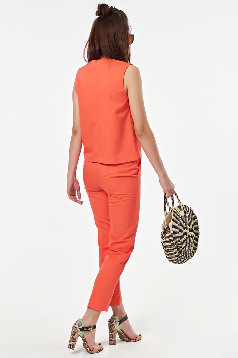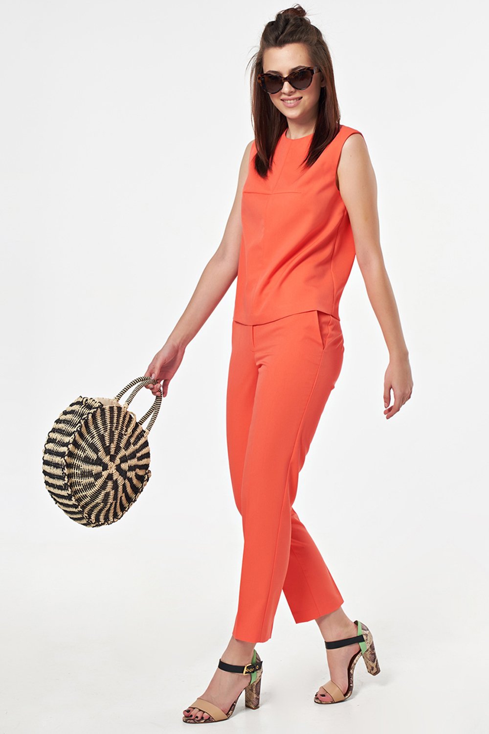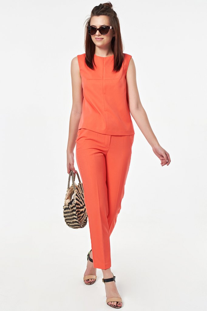 • Особенности: Костюм из костюмной ткани состоит из брюк и топа. Брюки прилегающего силуэта. Детали: боковые карманы, застежка на молнию и пуговицу. Топ прямого силуэта.