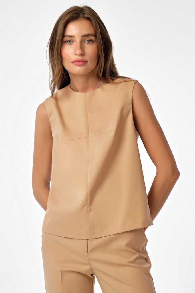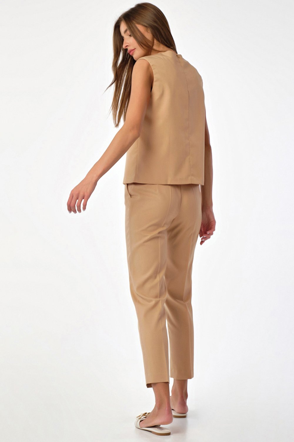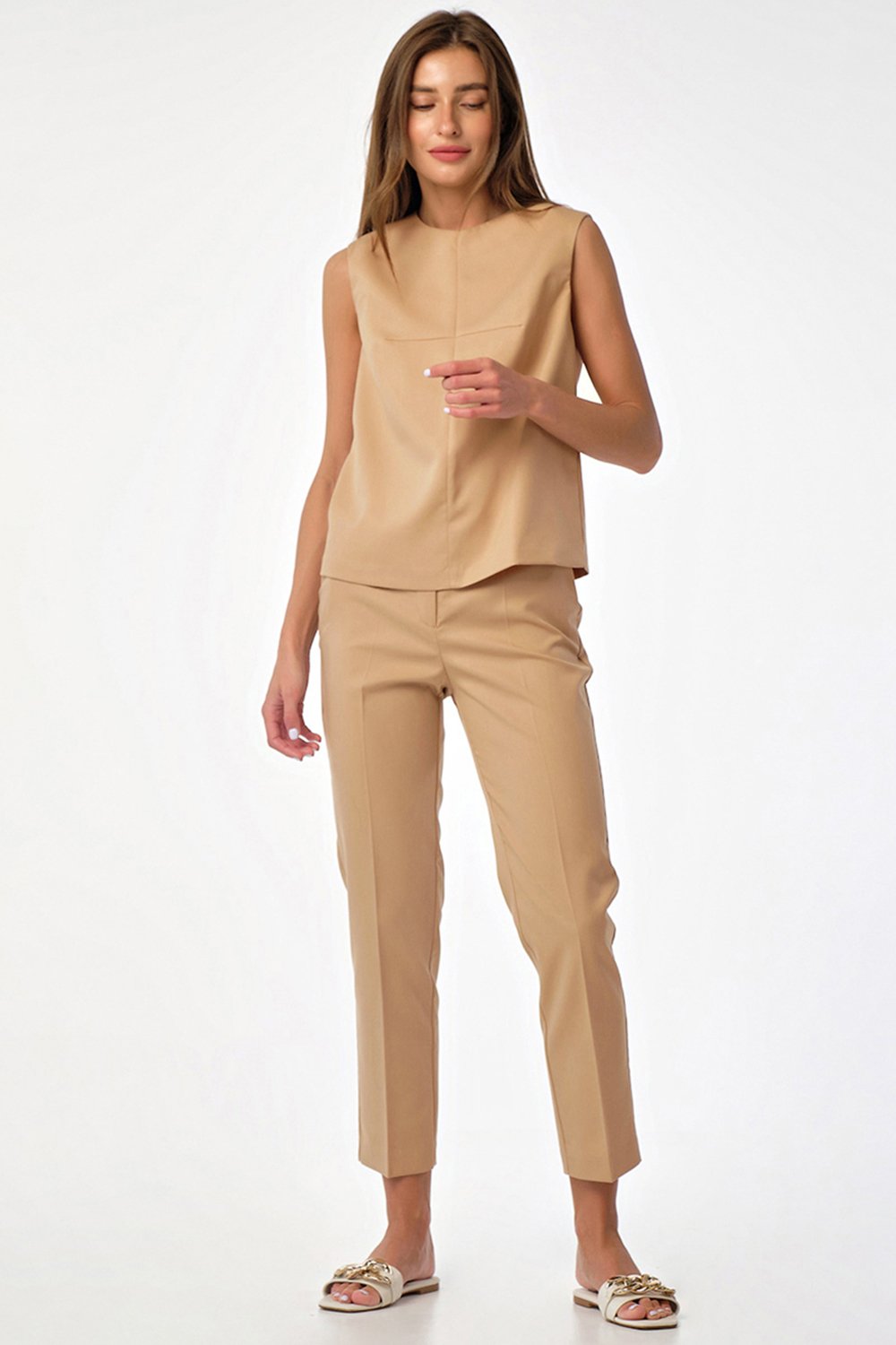 • Особенности: Костюм из костюмной ткани состоит из брюк и топа. Брюки прилегающего силуэта. Детали: боковые карманы, застежка на молнию и пуговицу. Топ прямого силуэта. Детали: горловина округлой формы обработана обтачкой, по переду вертикальное членение, застежка на молнию в среднем шве спинки.