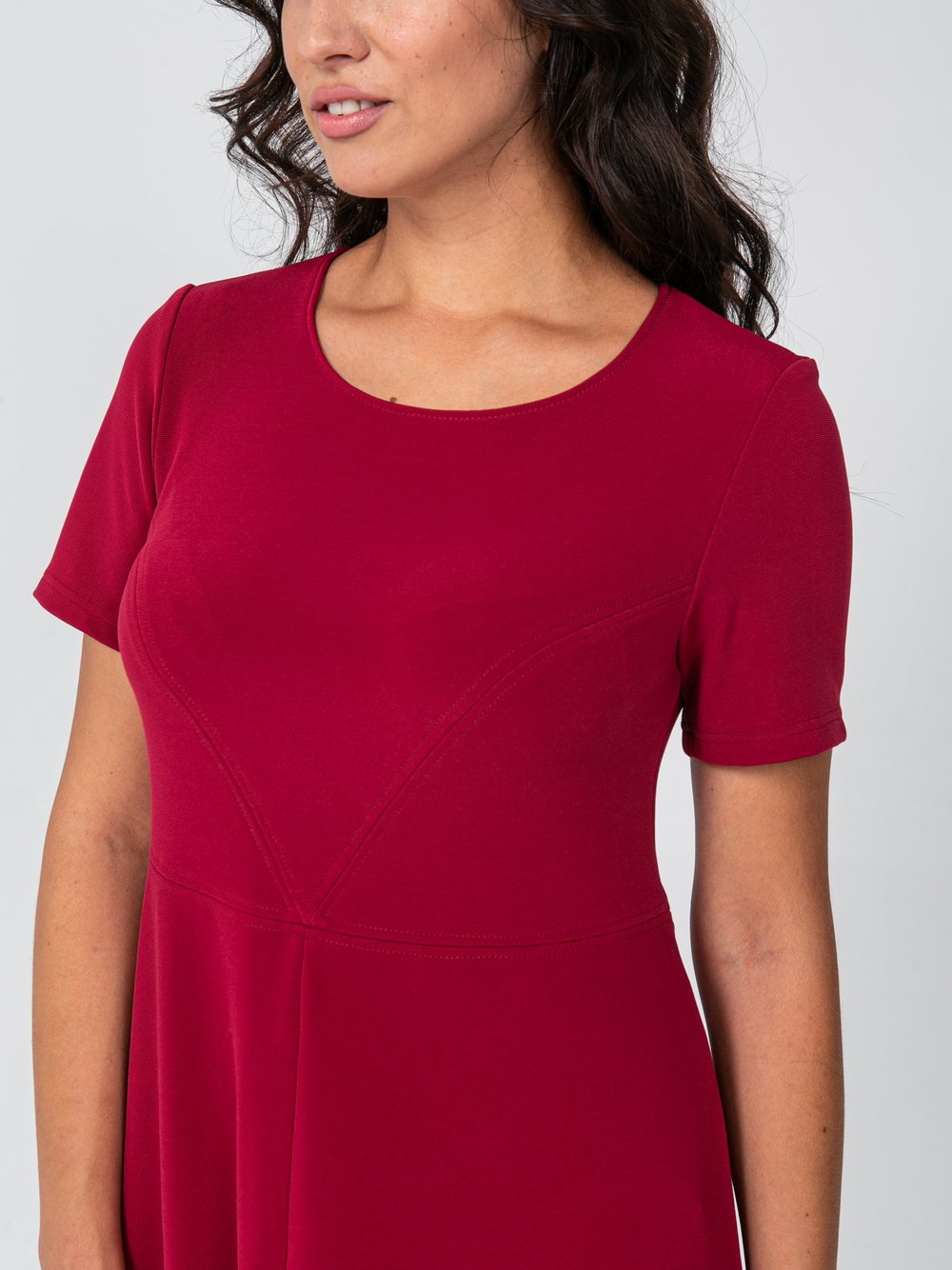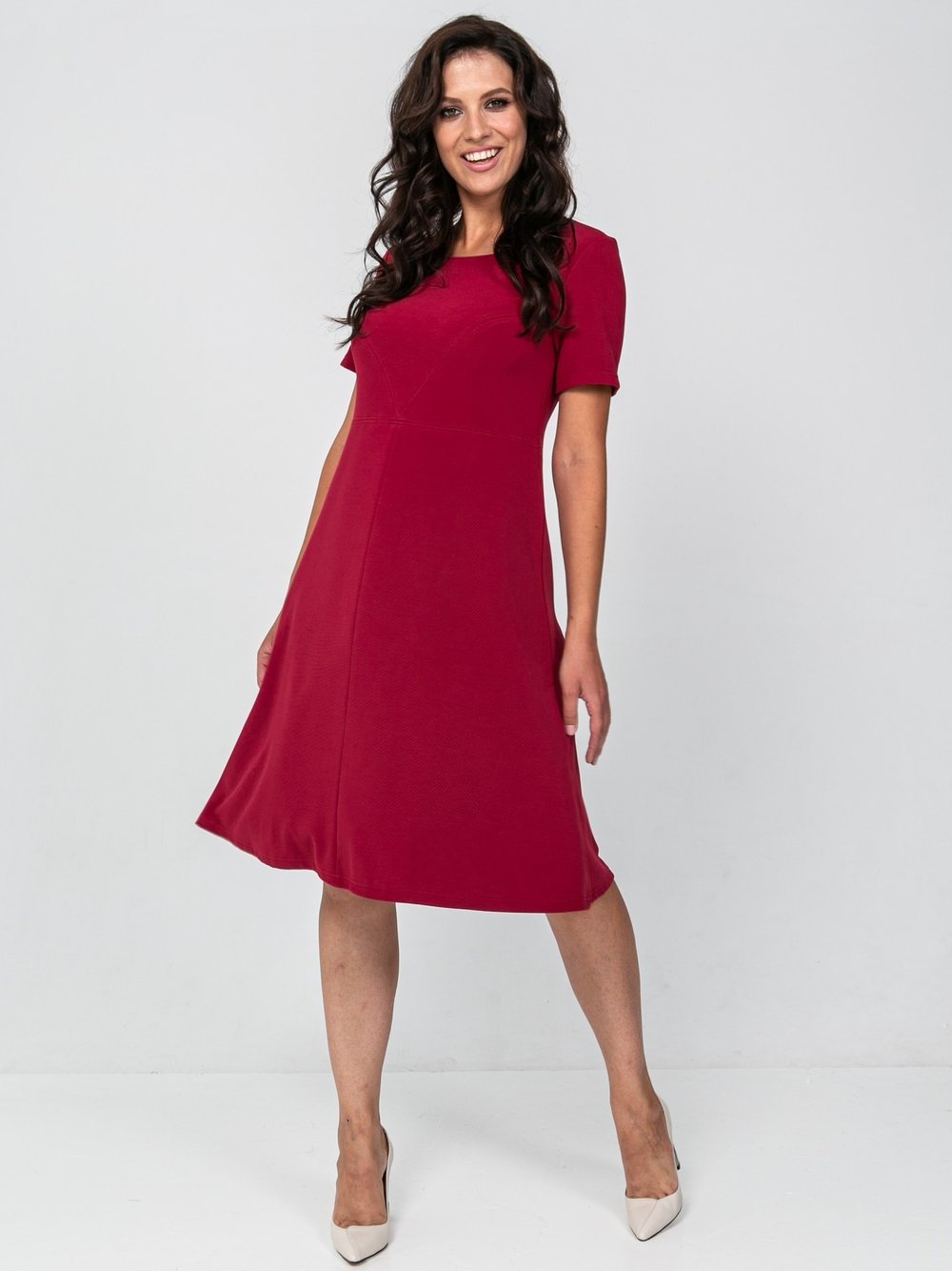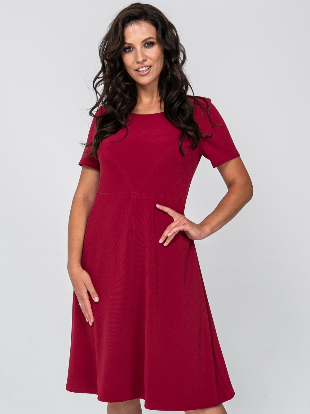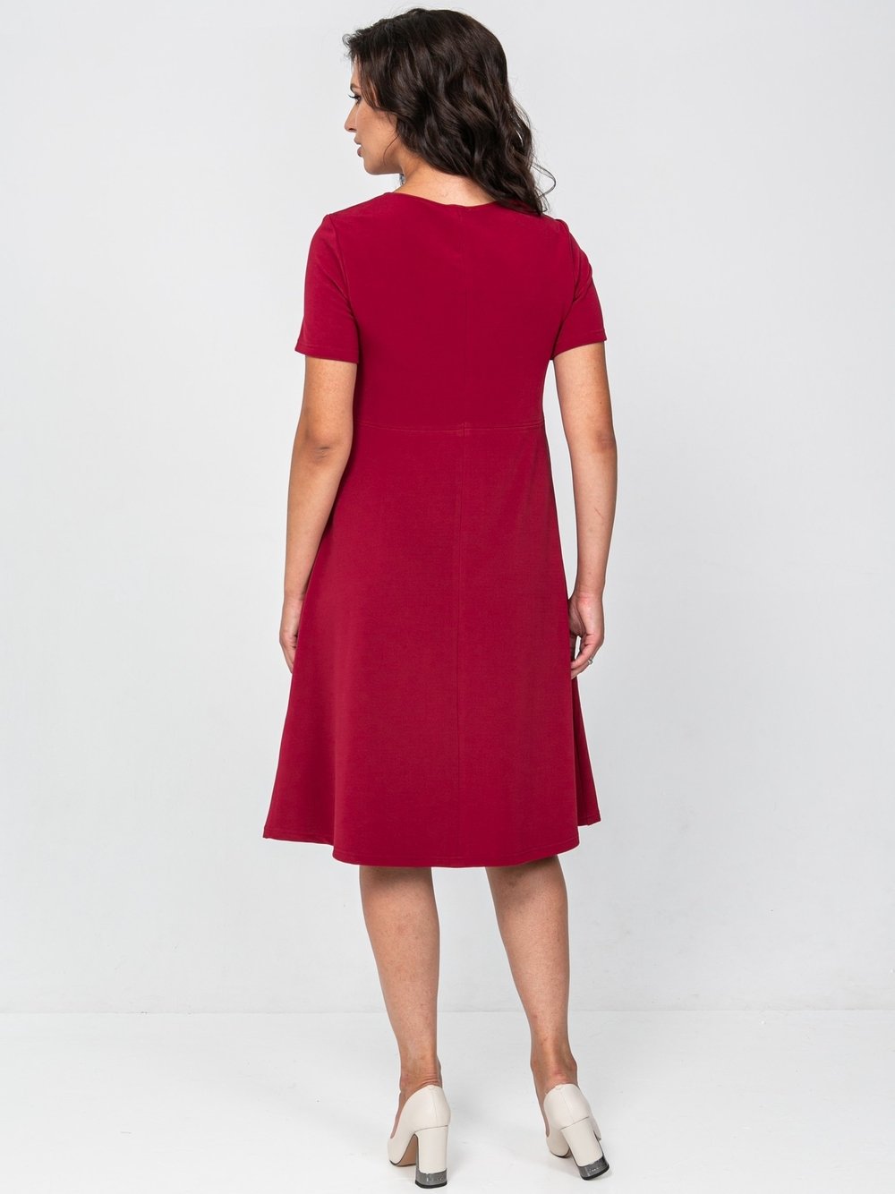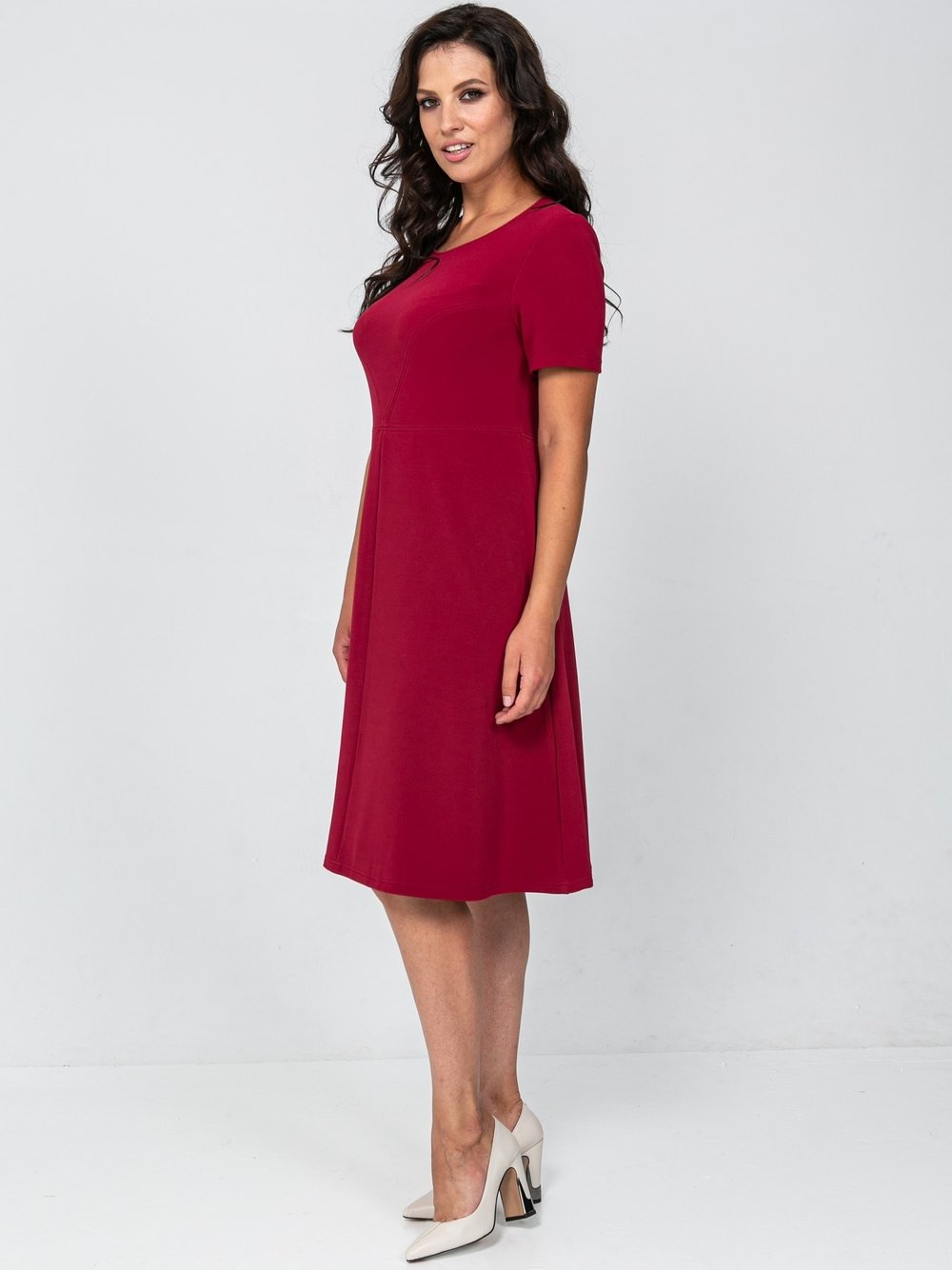 Платье женское А-образного силуэта из однотонного трикотажного полотна, слегка расклешенное к низу, отрезное выше линии талии. Верхняя часть переда с боковыми рельефами, верхняя часть спинки со средним швом. Горловина круглая, рукав втачной, короткий.Характеристики: