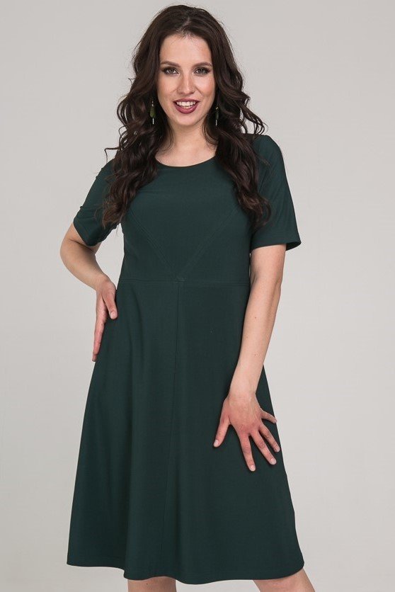 Платье женское А-образного силуэта из однотонного трикотажного полотна, слегка расклешенное к низу, отрезное выше линии талии. Верхняя часть переда с боковыми рельефами, верхняя часть спинки со средним швом. Горловина круглая, рукав втачной, короткий.