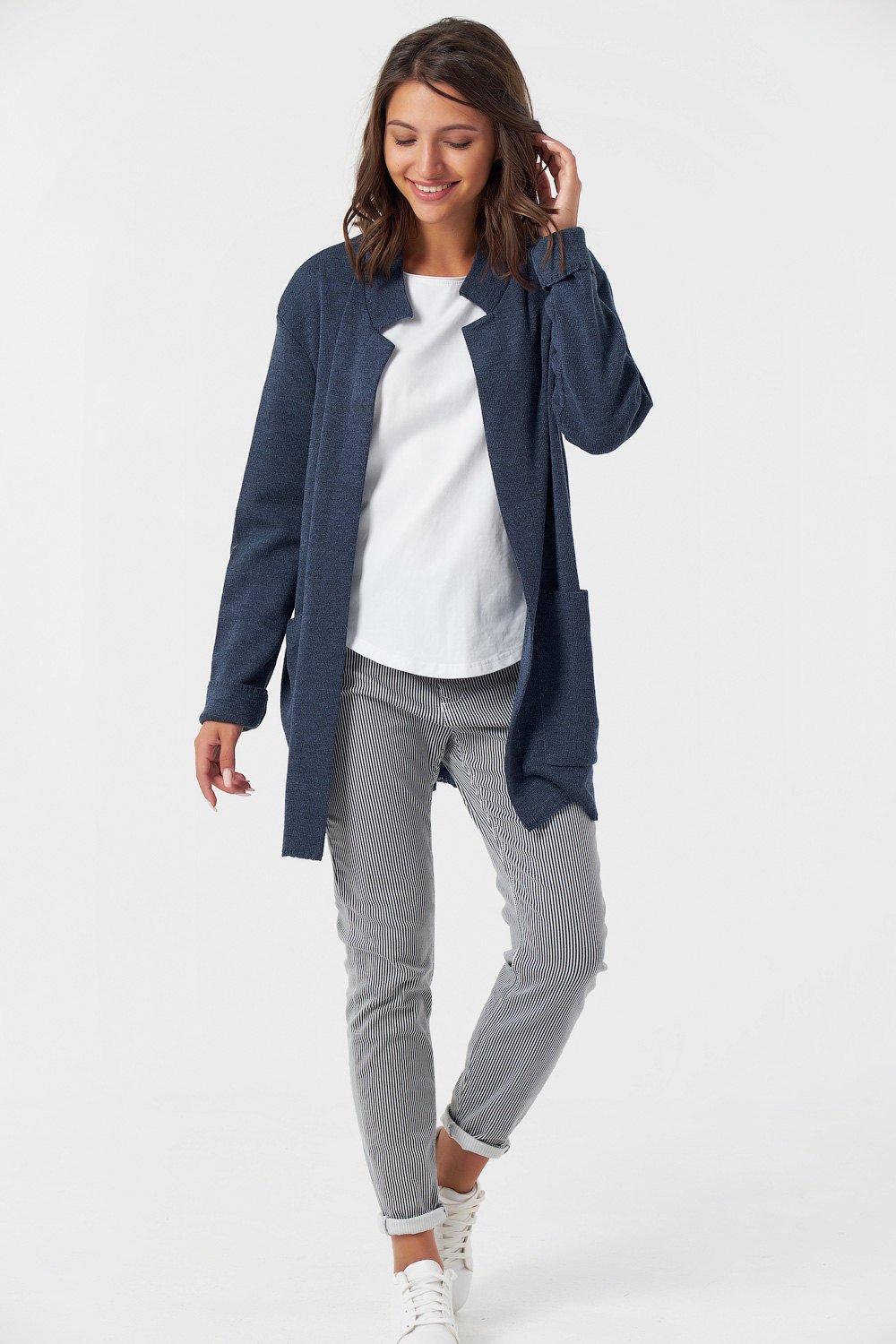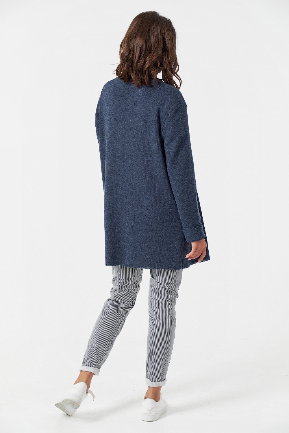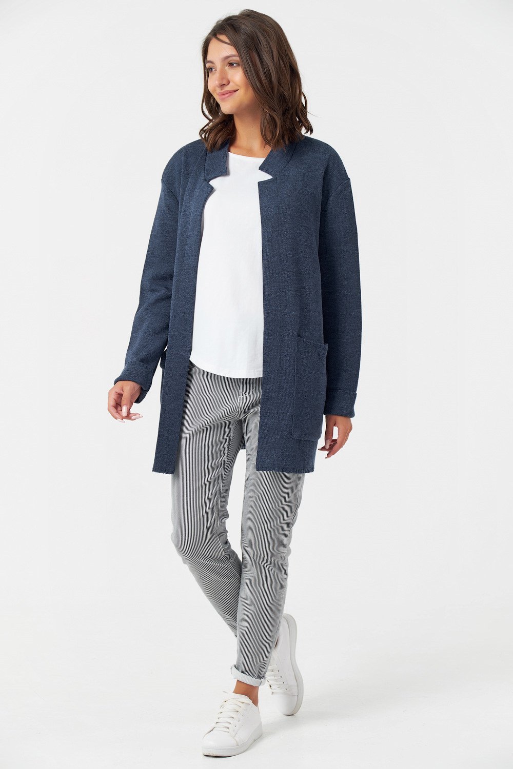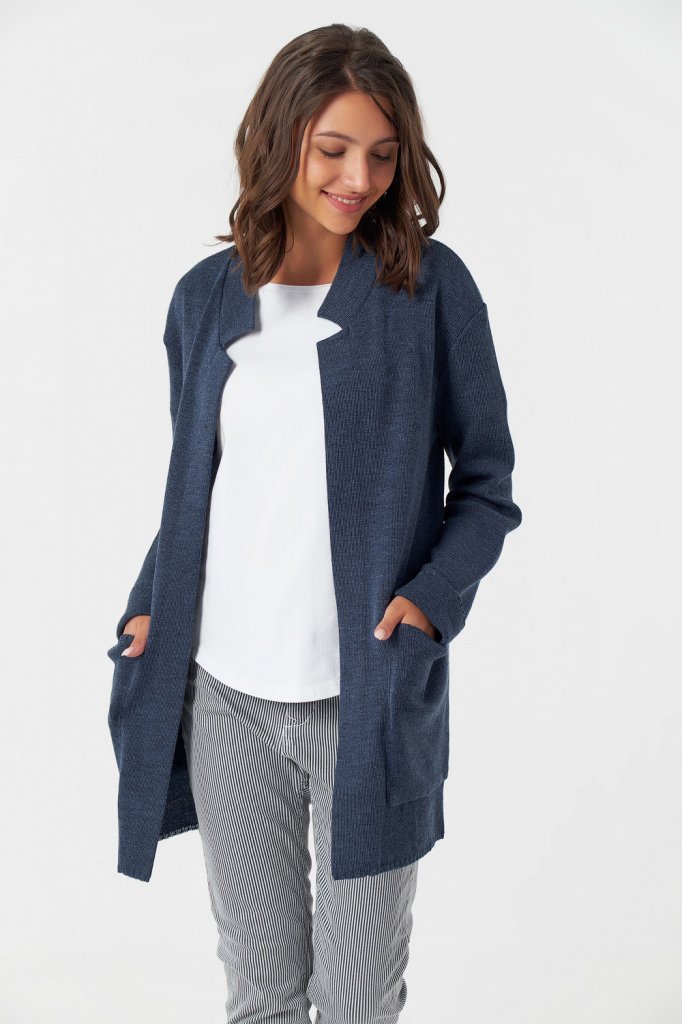 • Особенности: Вязаный кардиган прямого силуэта без застежки из полушерстяной пряжи.