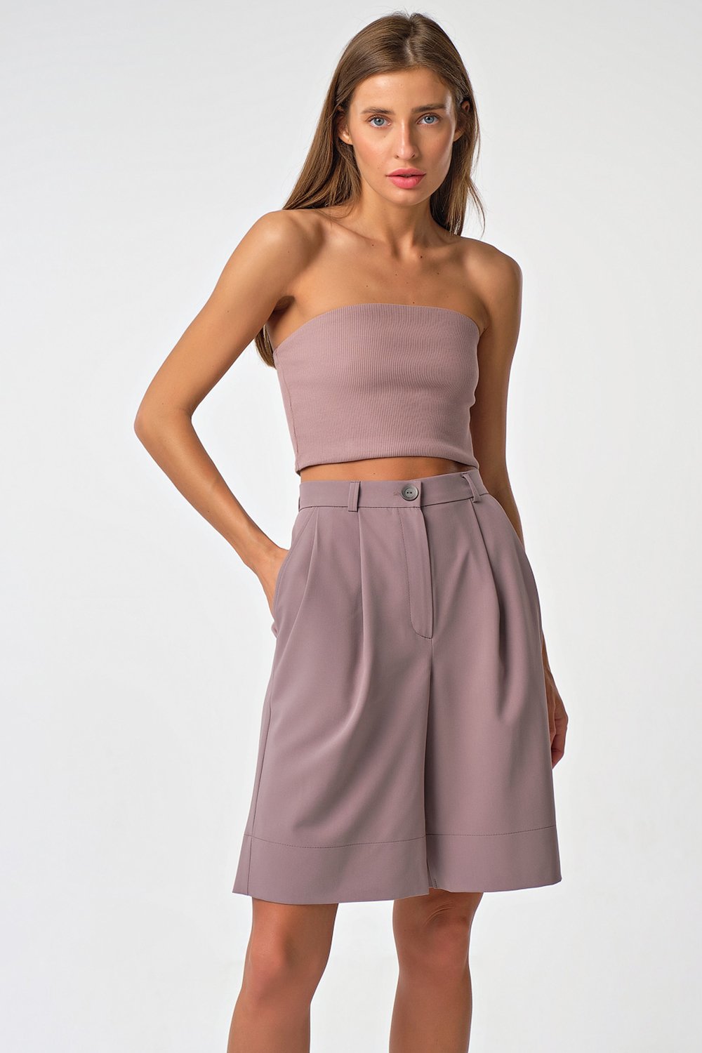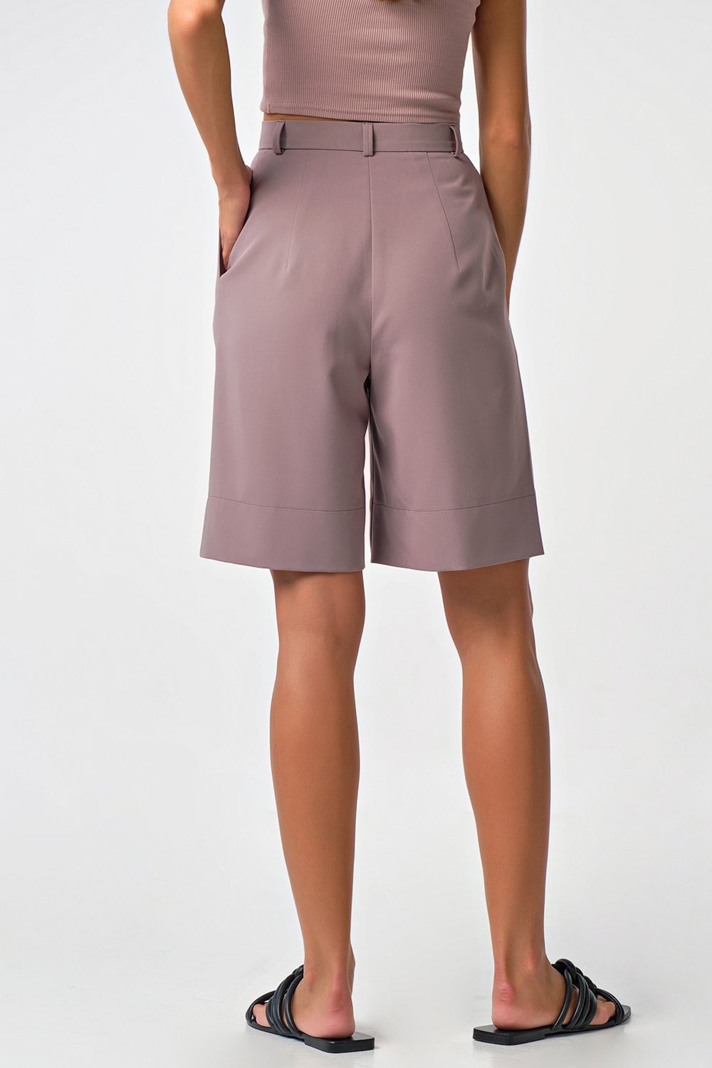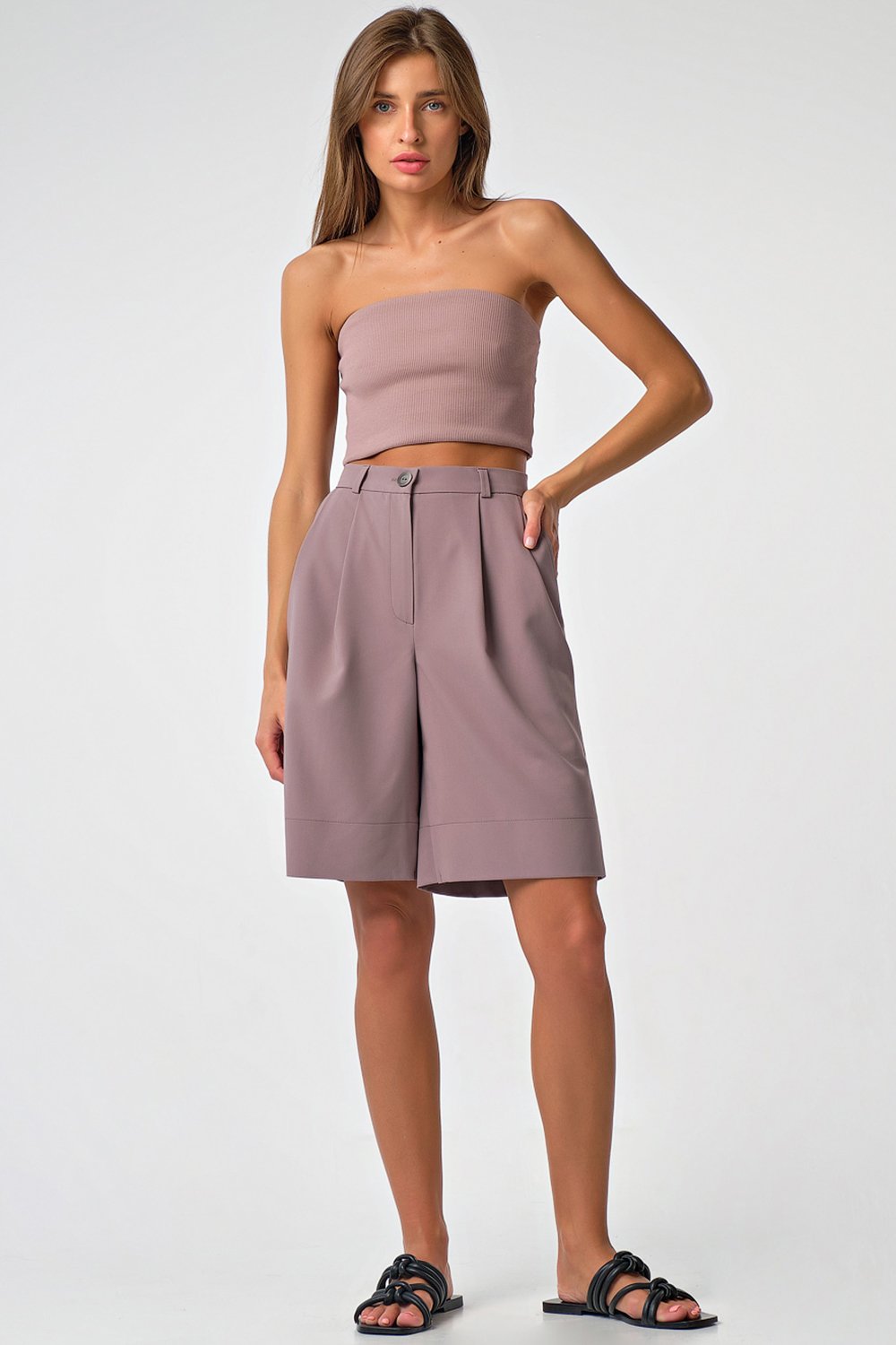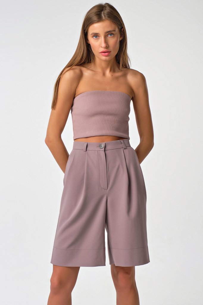 • Особенности: Шорты прямого силуэта из костюмной ткани. Детали: притачной пояс со шлевками и с застежкой на пуговицу, боковые карманы, две складки по переду, широкая подгибка по низу. Застежка на молнию.